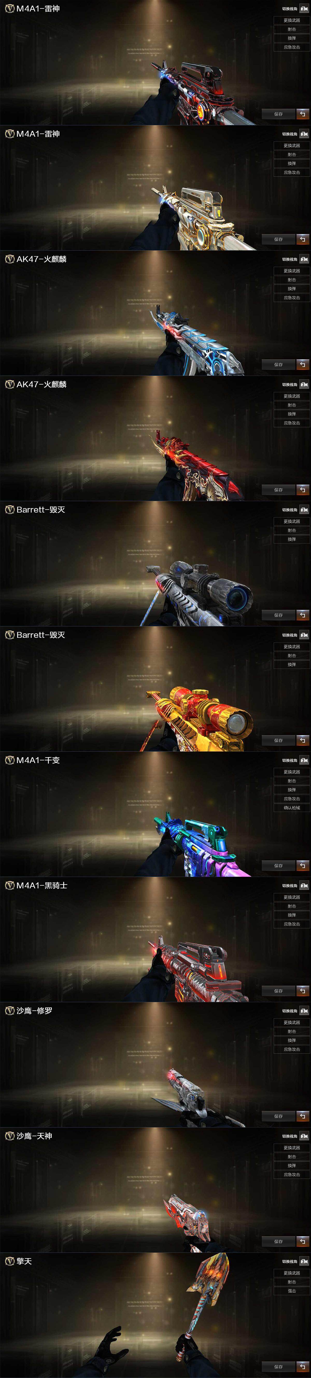 【英雄级武器】:M4A1-千变,M4A1-雷神,M4A1-黑骑士,AK47-无影,黑武士-锦绣游龙,QBZ03-金色蔷薇,王者之心-觉醒版,黑骑士-海王,Barrett-毁灭,沙鹰-修罗*2,沙鹰-天神,屠龙,擎天,高爆手雷-雷霆王者-觉醒版