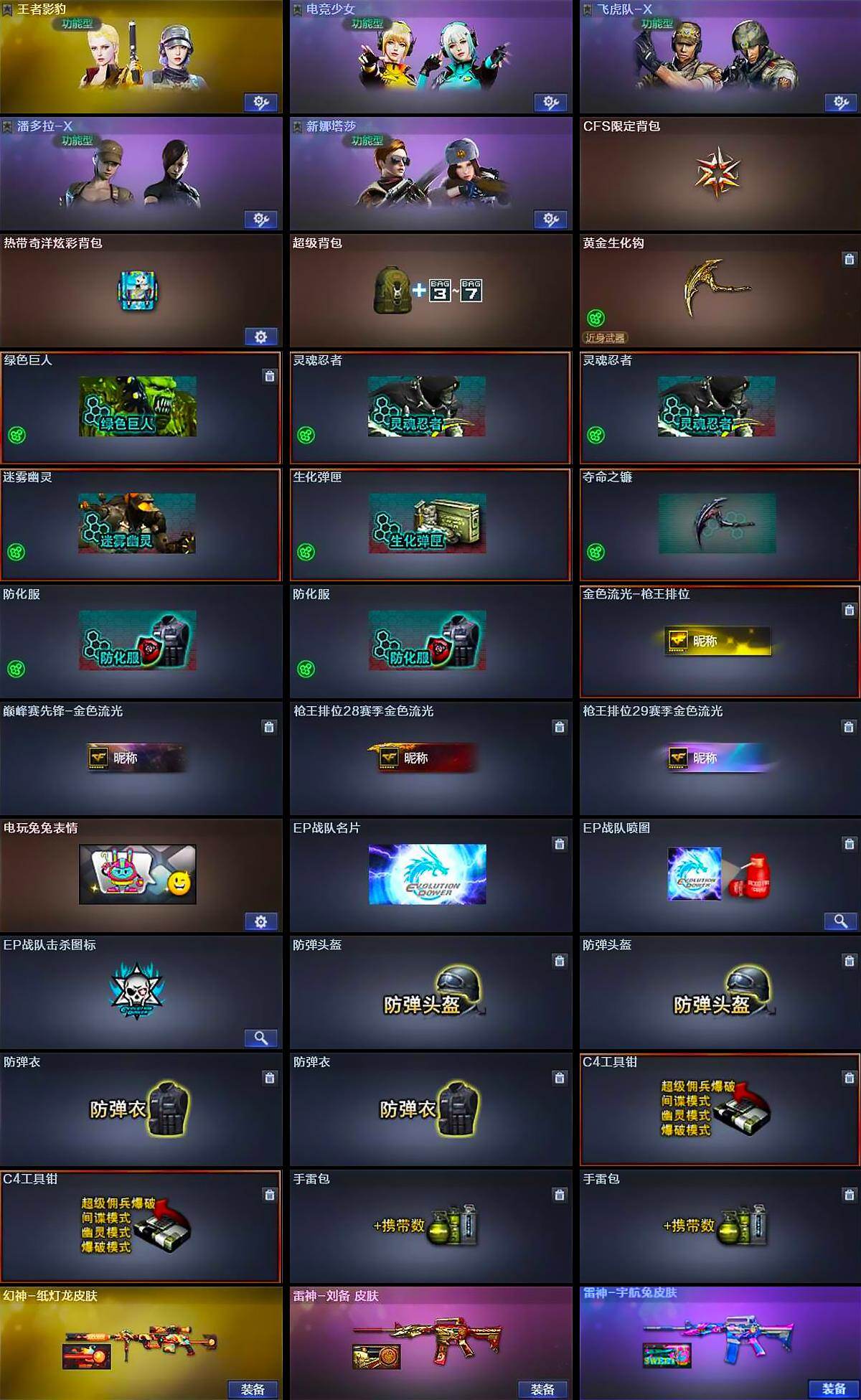 【道具】:CFS限定背包,热带奇洋炫彩背包,超级背包,黄金生化钩,绿色巨人,灵魂忍者*2,迷雾幽灵,生化弹匣,夺命之镰,防化服*2,金色流光-枪王排位,巅峰赛先锋-金色流光,枪王排位28赛季金色流光,枪王排位29赛季金色流光,电玩兔兔表情,EP战队名片,EP战队喷图,EP战队击杀图标,防弹头盔*2,防弹衣*2,C4工具钳*2,手雷包*2