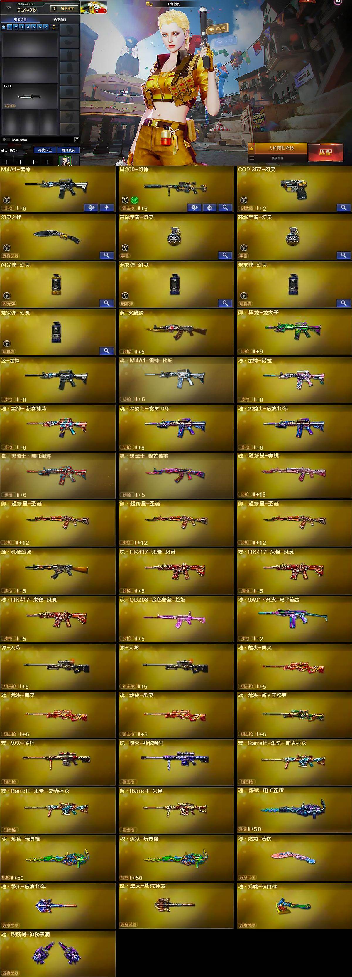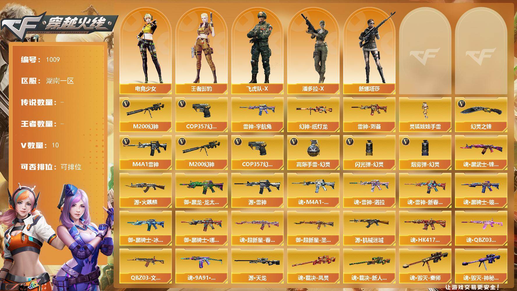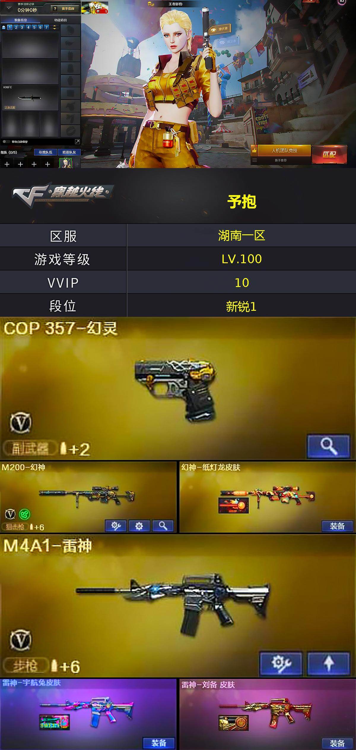 [17694610]湖南一区-10V-0王者武器数-0炫金武器数 【热门武器】:M200-幻神,COP 357-幻灵 【皮肤】:幻神-纸灯龙皮肤,雷神-宇航兔皮肤,雷神-刘备 皮肤 【角色】:王者影豹,电竞少女,飞虎队-X,潘多拉-X,新娜塔莎 【人偶武器】:灵狐娃娃手雷 【英雄级武器】:M4A1-雷神,M200-幻神,COP 357-幻灵,幻灵之锋,高爆手雷-幻灵*2,闪光弹-幻灵,烟雾弹-幻灵*3 【源级武器】:源·火麒麟,御·黑龙-龙太子,源·雷神,魂·M4A1-雷神-化蛇,魂·雷神-诺拉,魂·雷神-新春神龙,魂·黑骑士-破浪10年*2,御·黑骑士-冰魄,御·黑骑士·哪吒闹海,魂·黑武士-锋芒破茧,魂·超新星-春桃,御·超新星-圣诞*3,源·机械迷城,魂·HK417-朱雀-凤灵*3,魂·QBZ03-金色蔷薇-蛇姬,QBZ03-文殊坊,魂·9A91·烈火-电子连击,源·天龙*2,魂·裁决-凤灵*3,魂·裁决-新人王绿豆,魂·毁灭-秦师,魂·毁灭-神秘黑洞,魂·Barrett-朱雀- 新春神龙*2,源·Barrett-朱雀,魂·炼狱-电子连击,魂·炼狱-玩具枪*2,魂·屠龙-春桃,魂·擎天-破浪10年,魂·擎天-蒸汽钟表,魂·龙啸-玩具枪,魂·麒麟刺-神秘黑洞 【道具】:CFS限定背包,热带奇洋炫彩背包,超级背包,黄金生化钩,绿色巨人,灵魂忍者*2,迷雾幽灵,生化弹匣,夺命之镰,防化服*2,金色流光-枪王排位,巅峰赛先锋-金色流光,枪王排位28赛季金色流光,枪王排位29赛季金色流光,电玩兔兔表情,EP战队名片,EP战队喷图,EP战队击杀图标,防弹头盔*2,防弹衣*2,C4工具钳*2,手雷包*2 【特殊枪械】: