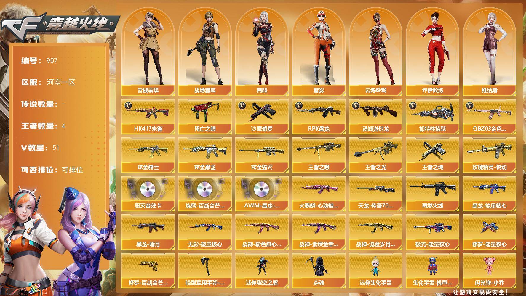 [17699727]河南一区-51V-4王者-3炫金 【热门武器】:QBZ03-金色蔷薇,HK417-朱雀,死亡之眼,汤姆逊-烈龙*6,RPK-盘龙*6,加特林-炼狱*2,沙鹰-修罗*3 【王者炫金武器】:玫瑰精灵-悦动,王者之光,王者之怒,王者之魂,炫金骑士,炫金黑龙,炫金毁灭 【音效卡】:Barrett-毁灭音效卡,炼狱-百战金芒-庆典舞曲音效卡,AWM-昌龙-怀旧音效卡 【皮肤】:M4A1-再燃火线,火麒麟-心动糖果,黑龙-能量核心*2,黑龙-暗月*2,无影-能量核心,战神-粉色甜心皮肤,战神-紫绶金章皮肤*2,战神-流金岁月皮肤,AWM-天龙-传奇70KG,极光-能量核心,修罗-能量核心*2,修罗-百战金芒 皮肤,轻型军用手斧-再燃火线 【角色】:葵,荆棘,战地猎狐,王者-零,雪域霜狐,乔伊教练,云海玲珑,空,暗夜-X,娟娟,零-水下丽影,潜龙队-X,斯沃特-X,维纳斯,影武者-X,智影 【人偶武器】:迷你裂空之翼,夺魂,迷你生化手雷*2,生化手雷-机甲核心,闪光弹-小乔 【暴走生化】:死亡之眼,超级对讲机 【挑战大师】:神圣爆裂者III,冰龙粉碎者-白马银枪,VEPR-12-金魔 【英雄级武器】:AK47-火麒麟*2,M4A1-黑龙,M4A1-雷神,M4A1-死神,AK47-黑武士,AK47-黑鲨,HK417-朱雀,M4A1-玫瑰精灵*2,QBZ03-金色蔷薇,AWM-天龙,Barrett-毁灭*2,Barrett-极光*2,Barrett-金色蔷薇,RPK-盘龙*6,加特林-炼狱*2,炼狱-百战金芒,汤姆逊-烈龙*6,沙鹰-修罗*3,屠龙*5,龙啸,擎天,麒麟刺,麒麟刺-百战金芒,M4A1-赤狱骑士,AWM-昌龙 【道具】:BS战队炫彩背包,云山科技背包,亚洲杯纪念炫彩背包,战舰背包,炫彩背包-诺拉,炫彩背包,百战金芒炫彩背包,背包-洛丽塔,超级背包,雪域霜狐炫彩背包,女皇终结者-魔龙之吻,救世主-黑桃战神,黄金生化钩,绿色巨人,灵魂忍者,变异宝贝,妖姬,迷雾幽灵,夺命之镰,防化服*3,金色流光-枪王排位,流光-再燃火线,枪王排位28赛季金色流光,枪王排位29赛季金色流光,语音特效-盛典烟火,语音特效-怀旧,雪域霜狐表情,萌萌小葵表情,C4-再燃火线,防弹头盔*3,防弹衣*3,C4工具钳*3,手雷包*3 【特殊枪械】:6烈龙,6盘龙,2炼狱