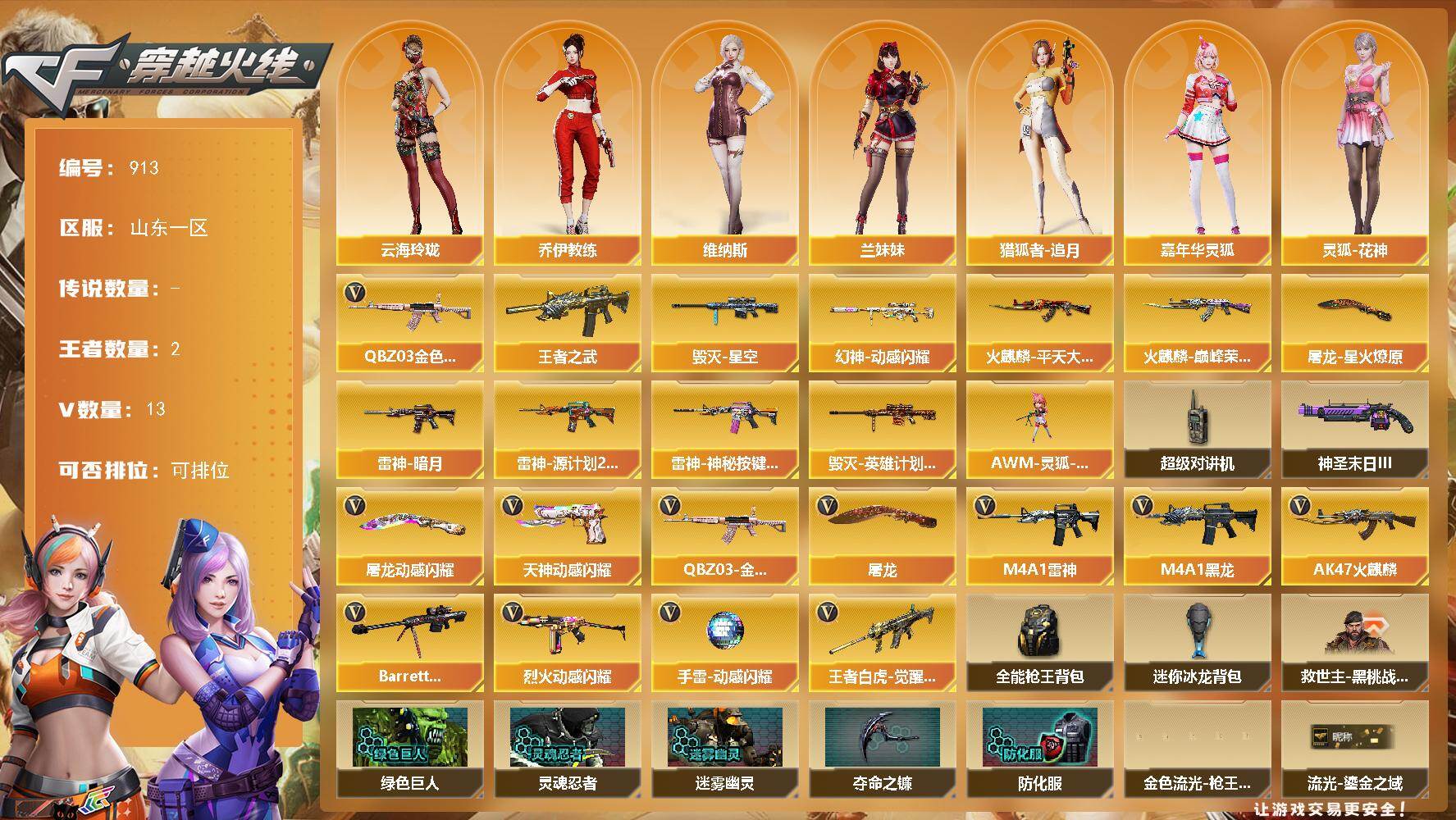 [17699254]山东一区-13V-2王者-0炫金 【热门武器】:QBZ03-金色蔷薇 【王者炫金武器】:王者之武 【皮肤】:幻神-动感闪耀 皮肤,雷神-暗月,雷神-源计划2.0专属 皮肤,雷神-神秘按键 皮肤,火麒麟-平天大圣,火麒麟-巅峰荣耀,毁灭-星空,毁灭-英雄计划 皮肤,屠龙-星火燎原 【角色】:乔伊教练,云海玲珑,芳心审判者,嘉年华灵狐,娟娟,兰妹妹,猎狐者-追月,灵狐-花神,灵狐者-X,麻雀,曼陀罗-礼服,潘多拉-甜心教官,潜龙队-X,兔囡囡,维纳斯,雪莉杨-摸金校尉,幽 【人偶武器】:AWM-灵狐-15周年嘉年华*2 【暴走生化】:超级对讲机 【挑战大师】:神圣爆裂者-末日III 【英雄级武器】:AK47-火麒麟,M4A1-黑龙,M4A1-雷神,QBZ03-金色蔷薇,烈火-动感闪耀,王者白虎-觉醒版,Barrett-毁灭,天神-动感闪耀,屠龙*2,屠龙-动感闪耀,手雷-动感闪耀 【道具】:全能枪王背包,迷你冰龙背包,救世主-黑桃战神,绿色巨人,灵魂忍者,迷雾幽灵,夺命之镰,防化服*3,金色流光-枪王排位*2,流光-鎏金之域,流光-再燃火线,枪王排位29赛季金色流光,动感闪耀表情,防弹头盔*4,防弹衣*4,C4工具钳*4,手雷包*4 【特殊枪械】: