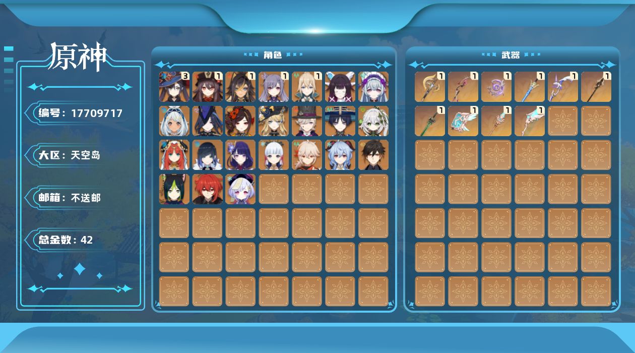 0命克洛琳德,0命千织,0命娜维娅,0命林尼,1命迪希雅,0命流浪者,0命纳西妲,0命妮露,0命提纳里,0命夜兰,0命雷电将军,0命枫原万叶,0命神里绫华,0命钟离,1命胡桃,0命甘雨,1命刻晴,0命七七,1命琴,3命莫娜,0命迪卢克,0命玛拉妮,0命梦见月瑞希,0命哥伦比娅,精1裁断,精1最初的大魔术,精1不灭月华,精1苍古自由之誓,精1磐岩结绿,精1天空之脊,精1贯虹之槊,精1天空之翼,精1阿莫斯之弓,精1天空之卷
