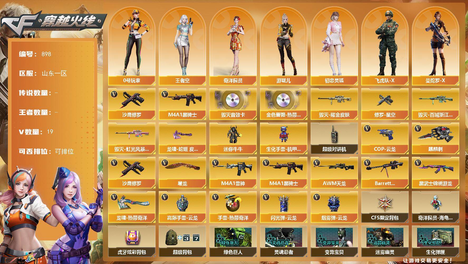 [17700437]山东一区-19V-0王者-0炫金 【热门武器】:M4A1-黑骑士,沙鹰-修罗*2 【音效卡】:QBZ03-金色蔷薇-热带奇洋音效卡,Barrett-毁灭音效卡 【皮肤】:毁灭耀金皮肤,毁灭-百城浙江 皮肤,毁灭-虹光风暴 皮肤,修罗-星空,龙啸-蛇姬 皮肤 【角色】:魅影,王者空,奇洋探员,初恋灵狐,飞虎队-X,风暴女,兰-海滩派对,0号玩家,曼陀罗-X,潘多拉-X,蜀雪,铁骑荣耀,影武者-X,游珑儿 【人偶武器】:迷你牛牛,生化手雷-机甲核心 【暴走生化】:超级对讲机 【英雄级武器】:M4A1-雷神,M4A1-黑骑士,黑武士-锦绣游龙,AWM-天龙,Barrett-毁灭,沙鹰-修罗*2,COP 357-云龙,屠龙,麒麟刺,龙啸-热带奇洋,高爆手雷-云龙,手雷-热带奇洋,闪光弹-云龙,烟雾弹-云龙 【道具】:CFS限定背包,奇洋探员-海龟背包,虎牙炫彩背包,超级背包,绿色巨人,灵魂忍者*2,变异宝贝,迷雾幽灵*2,生化弹匣,夺命之镰,防化服*2,金色流光-枪王排位*2,星辰流光-枪王排位,巅峰赛先锋-金色流光,枪王排位28赛季金色流光,枪王排位29赛季金色流光,热带奇洋表情,斯沃特表情,EP战队名片,EP战队喷图,EP战队击杀图标,防弹头盔*3,防弹衣*3,C4工具钳*3,手雷包*3 【特殊枪械】:1黑骑士