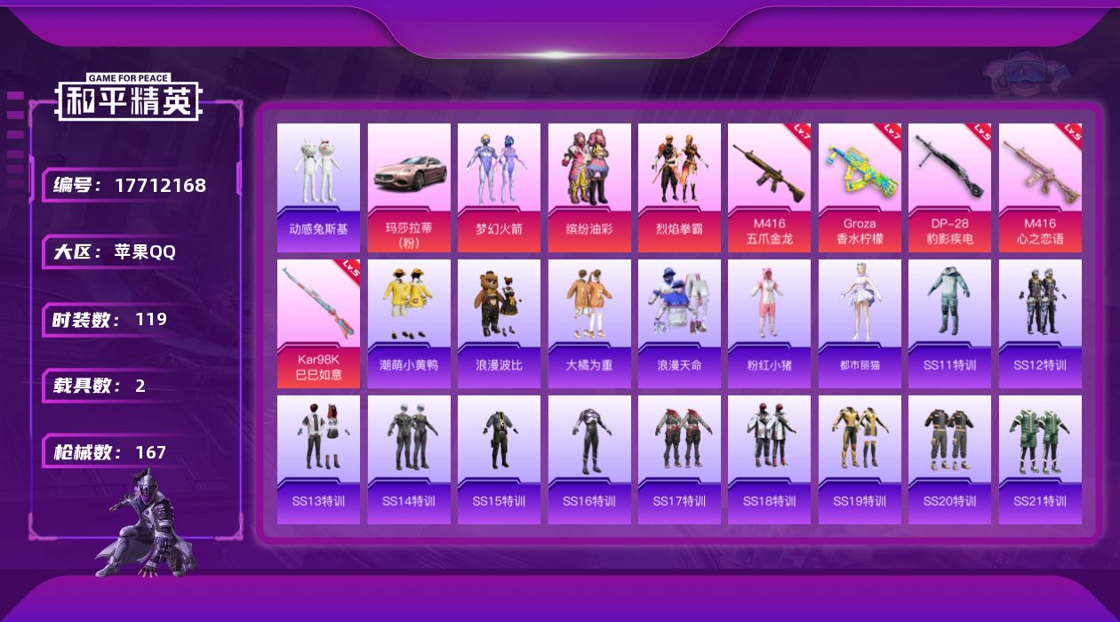 [17712168]【特价出售/店主推荐】苹果 手Q-3粉装-5特效枪-2载具-1粉色飞行器-58538热力值-11王牌印记-119套装-167枪皮【热门品类】:粉装-梦幻火箭,粉装-缤纷油彩,套装-浪漫天命,套装-动感兔斯基人偶服,套装-潮萌小黄鸭,套装-浪漫波比,套装-粉红小猪【粉色套装】:粉装-梦幻火箭,粉装-缤纷油彩,粉装-烈焰拳霸【粉色枪皮等级】:M416-五爪金龙(七级),M416-心之恋语(五级),GROZA-香水柠檬(七级),Kar98K-巳巳如意(五级),DP-28-豹影疾电(五级)【粉色载具】:玛莎拉蒂Ghibli(粉),空客H135-恋语之翼【粉色枪皮】:M416-五爪金龙,M416-心之恋语,GROZA-香水柠檬,Kar98K-巳巳如意,DP-28-豹影疾电【粉色飞行器】:梦幻火箭飞行器