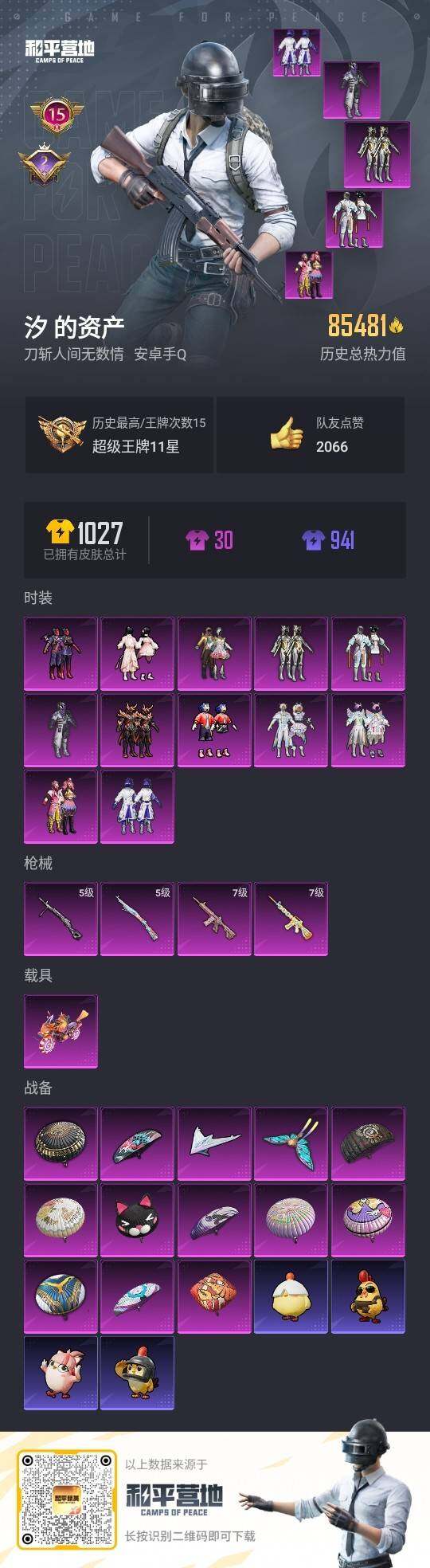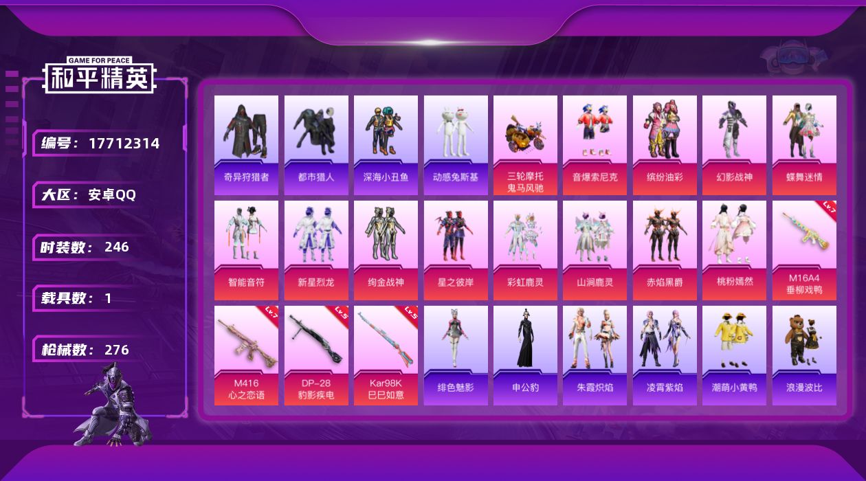 - [16872147]安卓 手Q-1粉装-5特效枪-0载具-0粉色飞行器-25333热力值-4王牌印记-57套装-83枪皮 【热门品类】:套装-龟仙人 【粉色套装】:角色-智耀战神 【粉色枪皮等级】:M762-鬼刀(七级),Kar98K-巳巳如意(五级),Mk14-甜梦熊击(五级),AMR-智耀战神(六级),DP-28-豹影疾电(五级) 【粉色枪皮】:M762-鬼刀,Kar98K-巳巳如意,Mk14-甜梦熊击,AMR-智耀战神,DP-28-豹影疾电 【粉色降落伞】:鬼刀降落伞,幻彩电音降落伞,冷漠罗丽降落伞 【稀有套装】:套装-龟仙人,套装-巳巳如意,角色-都市丽猫,套装-燕燕于飞,套装-鱼渊荷华,套装-白辉玉蕊,套装-粉恋花,套装-紫幽梦,套装-蓝冰羽,套装-极速光影 【稀有枪皮】:AKM-破晓战魂,M16A4-千金淑猫,SCAR-L-炫彩节奏,M416-蓝色火焰,AUG-天降萌叽,M762-奇异狩猎者,G36C-暗夜玫瑰,AC-VAL-天降萌叽,UMP45-蓝色火焰,Vector-暗夜玫瑰,汤姆逊-奇异狩猎者,汤姆逊-智耀战神,AKS-74U-鬼刀,P90-巳巳如意,M24-奇异狩猎者,Mini14-炫彩节奏,Mini14-耀粉歌者,MK20-H-樱桃泡泡,S686-巳巳如意,S12K-玩趣呆呆,M249-彩虹符号,短管霰弹-星穹咏叹调,蝎式手枪-千金淑猫,大砍刀-鬼刀,撬棍-冷漠罗丽,破片手榴弹-巳巳如意 【其他套装】:套装-SS22特训,套装-SS23特训,套装-SS24特训,套装-SS25特训,套装-SS27特训,套装-光之冒险,套装-暗金炫舞,套装-柠萌假日,套装-海岛探路者,套装-深蓝色名流,套装-滨海厨神,套装-玉兔迎春,套装-甜蜜告白,套装-破晓战魂,套装-竞技名士,套装-缤纷果语,套装-荣耀,套装-都市漫游者,套装-长空猛禽,套装-青春校园,套装-青涩时光,套装-飞行日记,套装-魅力单车,套装-鹤鸣,套装-麻辣教官,套装-龟仙人,角色-白光莹 【营地ID】:794051617