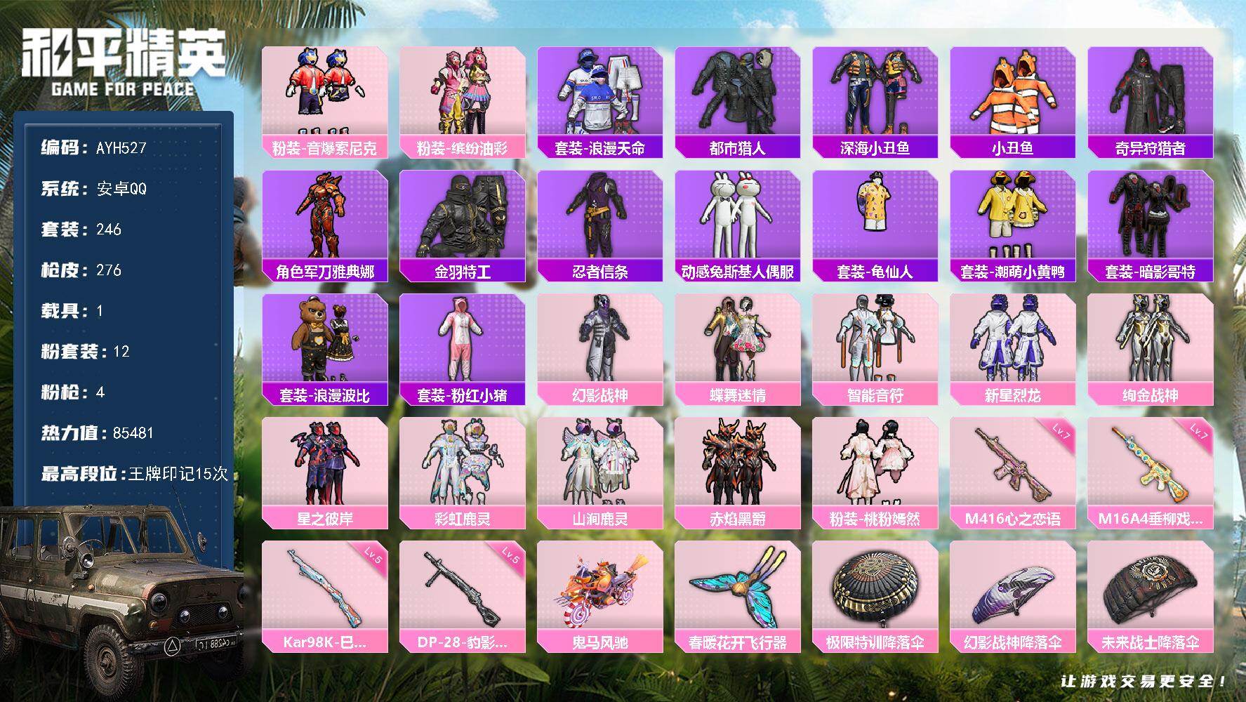 [17712314]地铁满天赋 安卓 手Q-12粉装-4特效枪-1载具-2粉色飞行器-85481热力值-15王牌印记-246套装-276枪皮【热门品类】:粉装-音爆索尼克,粉装-缤纷油彩,套装-浪漫天命,套装-都市猎人,套装-深海小丑鱼,套装-小丑鱼,套装-奇异狩猎者,角色-军刀雅典娜,套装-金羽特工,套装-忍者信条,套装-动感兔斯基人偶服,套装-龟仙人,套装-潮萌小黄鸭,套装-暗影哥特,套装-浪漫波比,套装-粉红小猪【粉色套装】:粉装-幻影战神,粉装-蝶舞迷情,粉装-智能音符,粉装-缤纷油彩,粉装-新星烈龙,粉装-绚金战神,粉装-星之彼岸,粉装-彩虹鹿灵,粉装-山涧鹿灵,粉装-赤焰黑爵,粉装-音爆索尼克,粉装-桃粉嫣然【粉色枪皮等级】:M16A4-垂柳戏鸭(七级),M416-心之恋语(七级),Kar98K-巳巳如意(五级),DP-28-豹影疾电(五级)【粉色载具】:鬼马风驰【粉色枪皮】:M16A4-垂柳戏鸭,M416-心之恋语,Kar98K-巳巳如意,DP-28-豹影疾电【粉色飞行器】:春暖花开飞行器