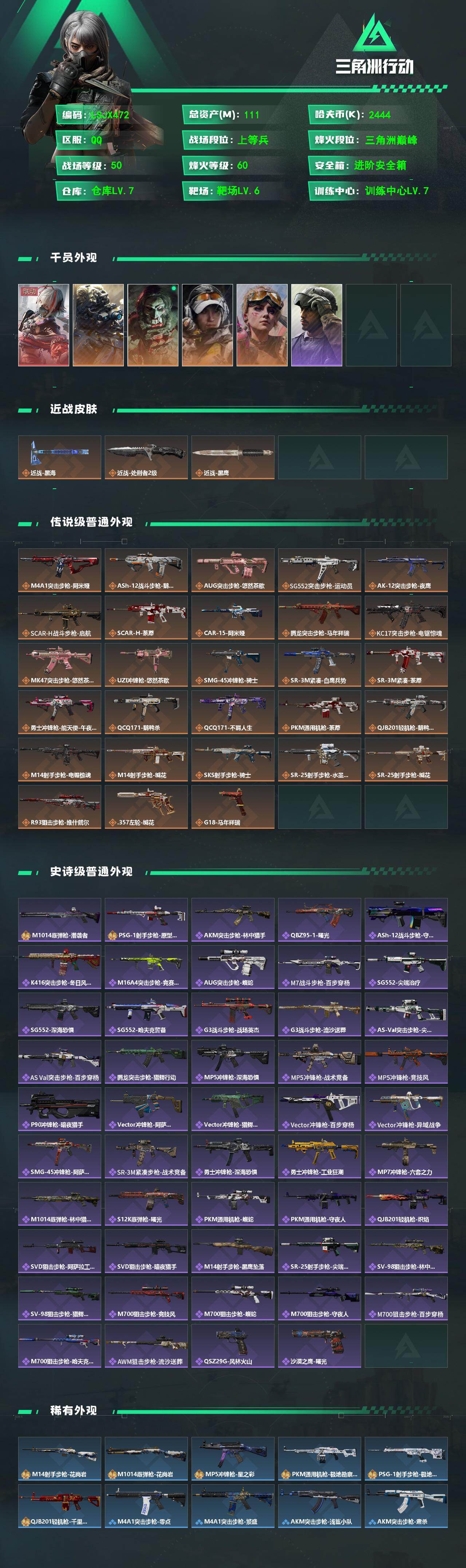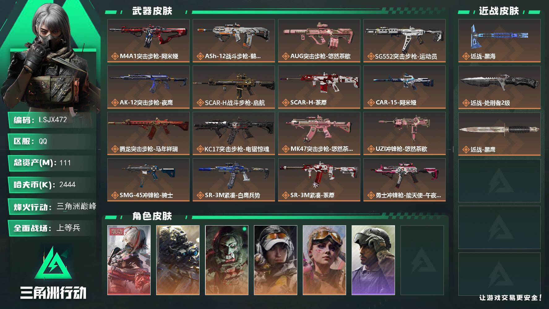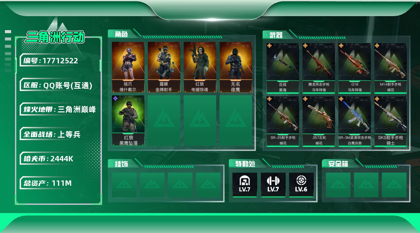 [17712522]111m总资产-2444k哈伏币-60烽火等级-三角洲巅峰-50战场等级-上等兵 【干员外观】:骇爪-维什戴尔,无名-夜鹰,红狼-电锯惊魂,露娜-金牌射手,蛊-不羁人生,红狼-黑鹰坠落 【近战皮肤】:近战-黑海,近战-处刑者2级,近战-黑鹰 【传说外观】:M4A1突击步枪-阿米娅,ASh-12战斗步枪-鹅鸭杀,AUG突击步枪-悠然茶歇,SG552突击步枪-运动员,AK-12突击步枪-夜鹰,SCAR-H战斗步枪-启航,SCAR-H战斗步枪-荼蘼,CAR-15突击步枪-阿米娅,腾龙突击步枪-马年祥瑞,KC17突击步枪-电锯惊魂,MK47突击步枪-悠然茶歇,UZI冲锋枪-悠然茶歇,SMG-45冲锋枪-骑士,SR-3M紧凑突击步枪-白鹰兵势,SR-3M紧凑突击步枪-荼蘼,勇士冲锋枪-能天使-午夜邮差,QCQ171冲锋枪-鹅鸭杀,QCQ171冲锋枪-不羁人生,PKM通用机枪-荼蘼,QJB201轻机枪-鹅鸭杀,M14射手步枪-电锯惊魂,M14射手步枪-缄花,SKS射手步枪-骑士,SR-25射手步枪-水墨云图,SR-25射手步枪-缄花,R93狙击步枪-维什戴尔,.357左轮-缄花,G18-马年祥瑞 【史诗外观】:M1014霰弹枪-潜袭者,PSG-1射手步枪-原型机,AKM突击步枪-林中猎手,QBZ95-1突击步枪-曙光,ASh-12战斗步枪-守夜人,K416突击步枪-冬日风情,M16A4突击步枪-竞赛选手,AUG突击步枪-蝮蛇,M7战斗步枪-百步穿杨,SG552突击步枪-尖端治疗,SG552突击步枪-深海恐惧,SG552突击步枪-哈夫克警备,G3战斗步枪-战场英杰,G3战斗步枪-流沙送葬,AS Val突击步枪-尖端治疗,AS Val突击步枪-百步穿杨,腾龙突击步枪-猎鳄行动,MP5冲锋枪-深海恐惧,MP5冲锋枪-战术竞备,MP5冲锋枪-竞技风,P90冲锋枪-暗影猎手,Vector冲锋枪-阿萨拉文明,Vector冲锋枪-猎鳄行动,Vector冲锋枪-百步穿杨,Vector冲锋枪-异域战争,SMG-45冲锋枪-阿萨拉特攻,SR-3M紧凑突击步枪-战术竞备,勇士冲锋枪-深海恐惧,勇士冲锋枪-工业狂潮,MP7冲锋枪-六套之力,M1014霰弹枪-林中猎手,S12K霰弹枪-曙光,PKM通用机枪-蝮蛇,PKM通用机枪-守夜人,QJB201轻机枪-炽焰,SVD狙击步枪-阿萨拉工艺,SVD狙击步