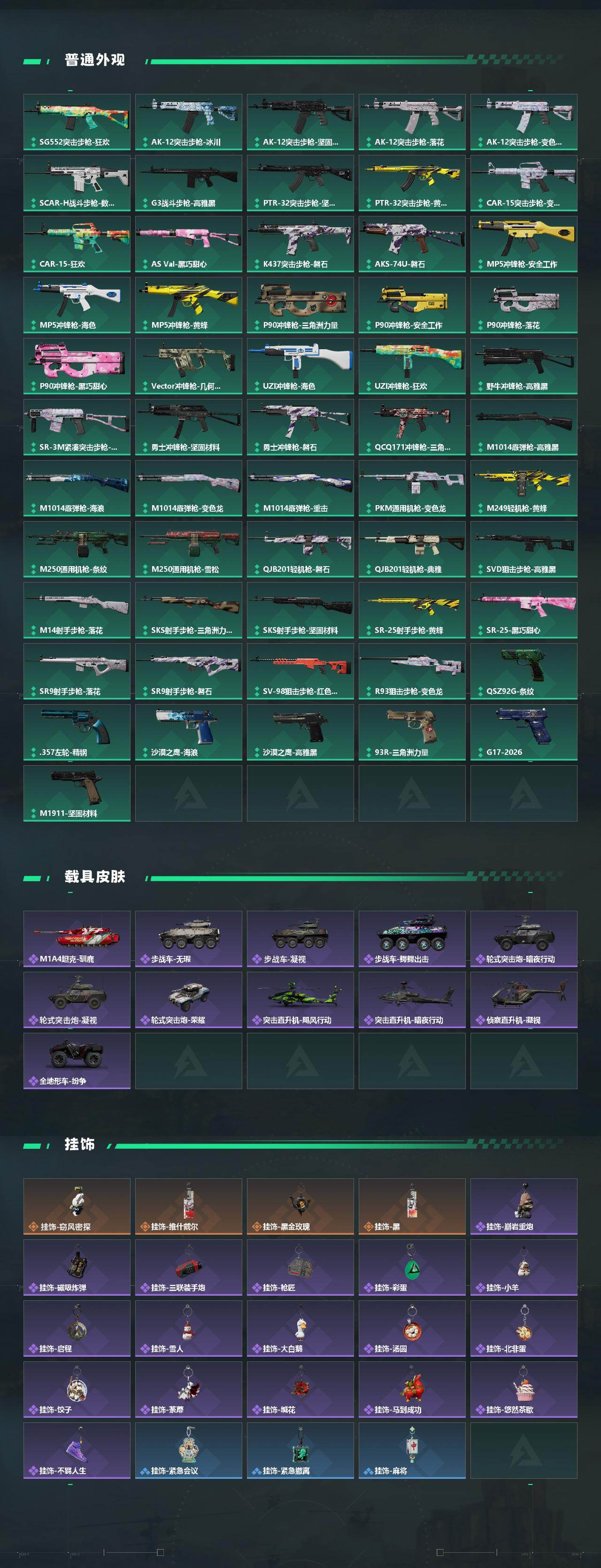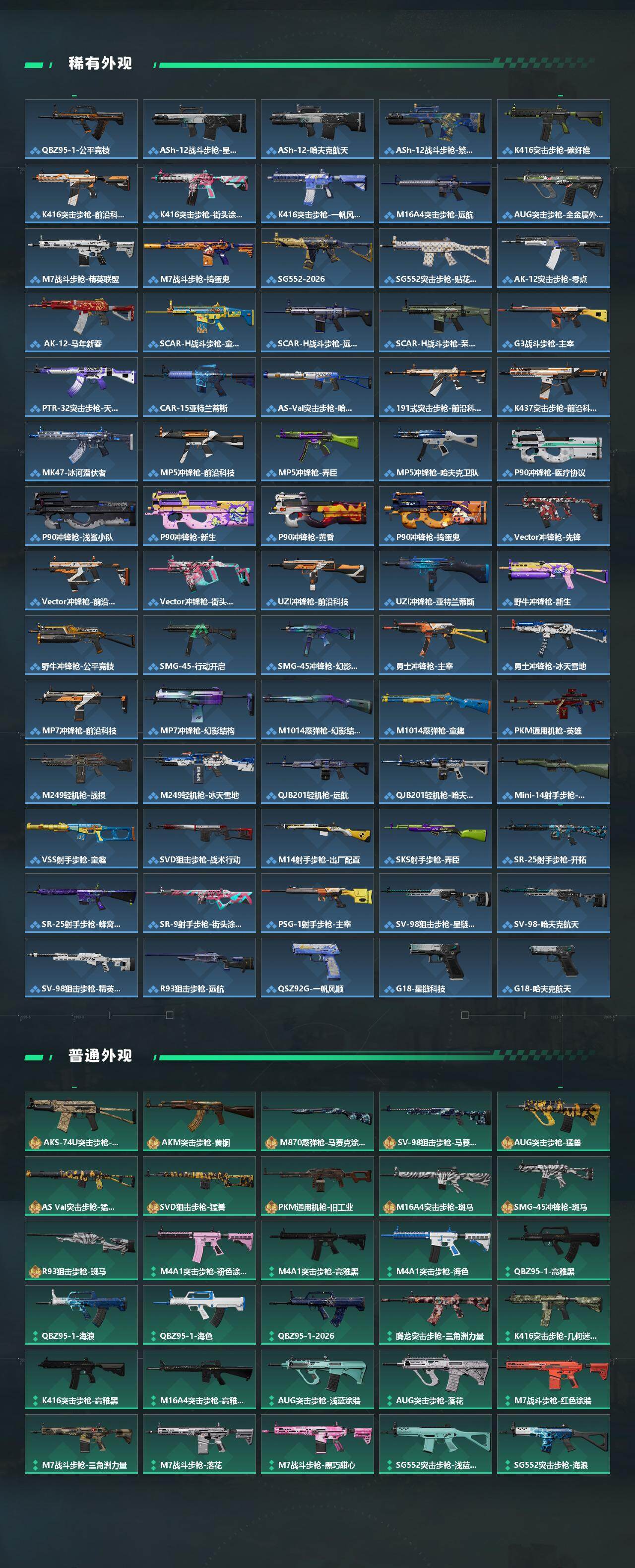 【史诗外观】:M1014霰弹枪-潜袭者,PSG-1射手步枪-原型机,AKM突击步枪-林中猎手,QBZ95-1突击步枪-曙光,ASh-12战斗步枪-守夜人,K416突击步枪-冬日风情,M16A4突击步枪-竞赛选手,AUG突击步枪-蝮蛇,M7战斗步枪-百步穿杨,SG552突击步枪-尖端治疗,SG552突击步枪-深海恐惧,SG552突击步枪-哈夫克警备,G3战斗步枪-战场英杰,G3战斗步枪-流沙送葬,AS Val突击步枪-尖端治疗,AS Val突击步枪-百步穿杨,腾龙突击步枪-猎鳄行动,MP5冲锋枪-深海恐惧,MP5冲锋枪-战术竞备,MP5冲锋枪-竞技风,P90冲锋枪-暗影猎手,Vector冲锋枪-阿萨拉文明,Vector冲锋枪-猎鳄行动,Vector冲锋枪-百步穿杨,Vector冲锋枪-异域战争,SMG-45冲锋枪-阿萨拉特攻,SR-3M紧凑突击步枪-战术竞备,勇士冲锋枪-深海恐惧,勇士冲锋枪-工业狂潮,MP7冲锋枪-六套之力,M1014霰弹枪-林中猎手,S12K霰弹枪-曙光,PKM通用机枪-蝮蛇,PKM通用机枪-守夜人,QJB201轻机枪-炽焰,SVD狙击步枪-阿萨拉工艺,SVD狙击步