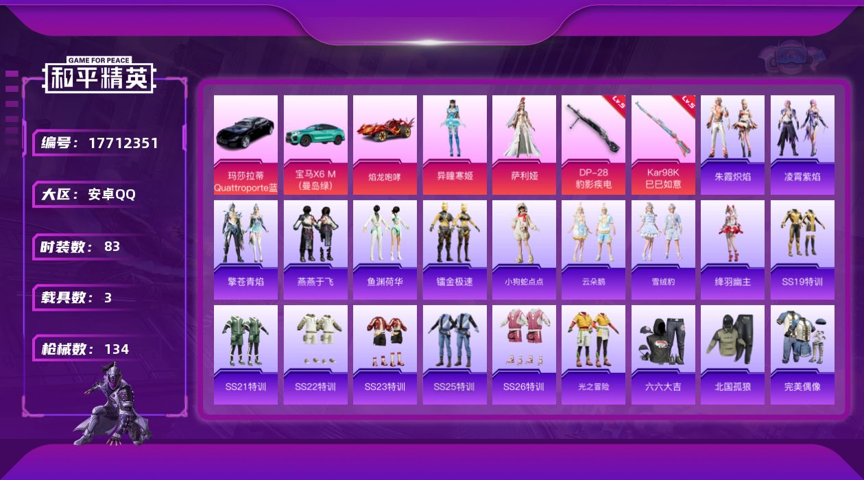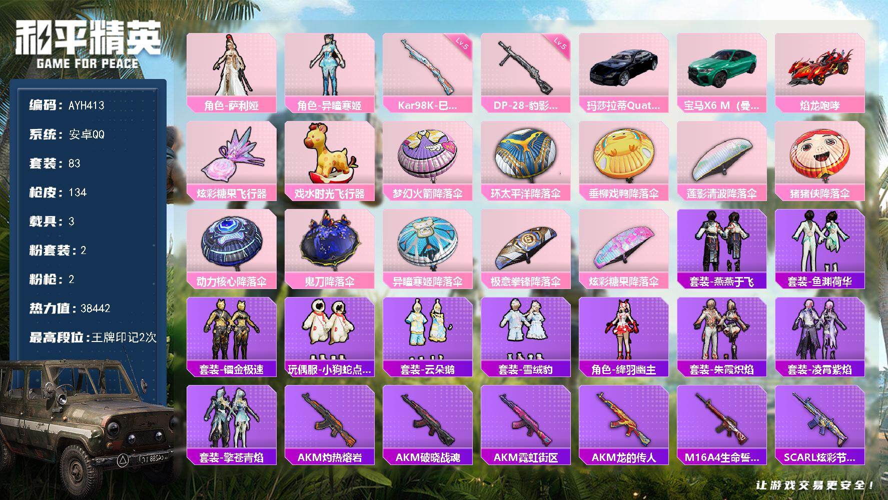 [17712351]安卓 手Q-2粉装-2特效枪-3载具-2粉色飞行器-38442热力值-2王牌印记-83套装-134枪皮【粉色套装】:角色-萨利娅,角色-异瞳寒姬【粉色枪皮等级】:Kar98K-巳巳如意(五级),DP-28-豹影疾电(五级)【粉色载具】:玛莎拉蒂Quattroporte(夜幕蓝),宝马X6 M(曼岛绿),焰龙咆哮【粉色枪皮】:Kar98K-巳巳如意,DP-28-豹影疾电【粉色飞行器】:炫彩糖果飞行器,戏水时光飞行器