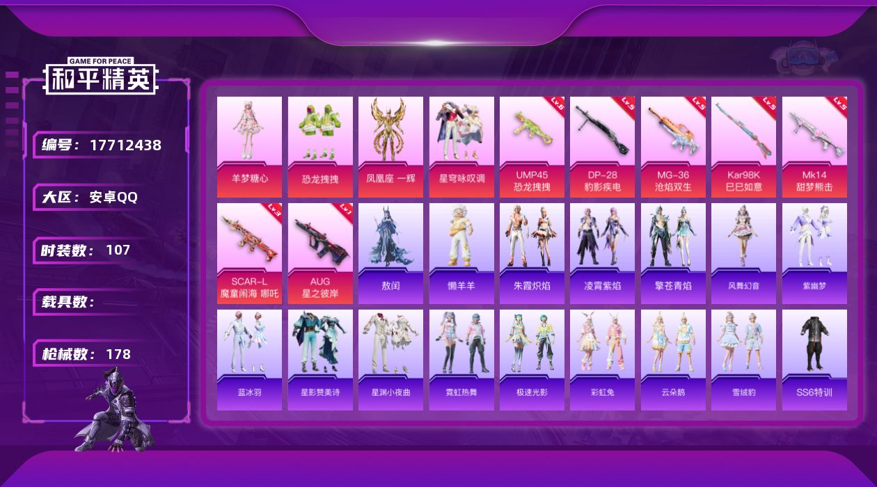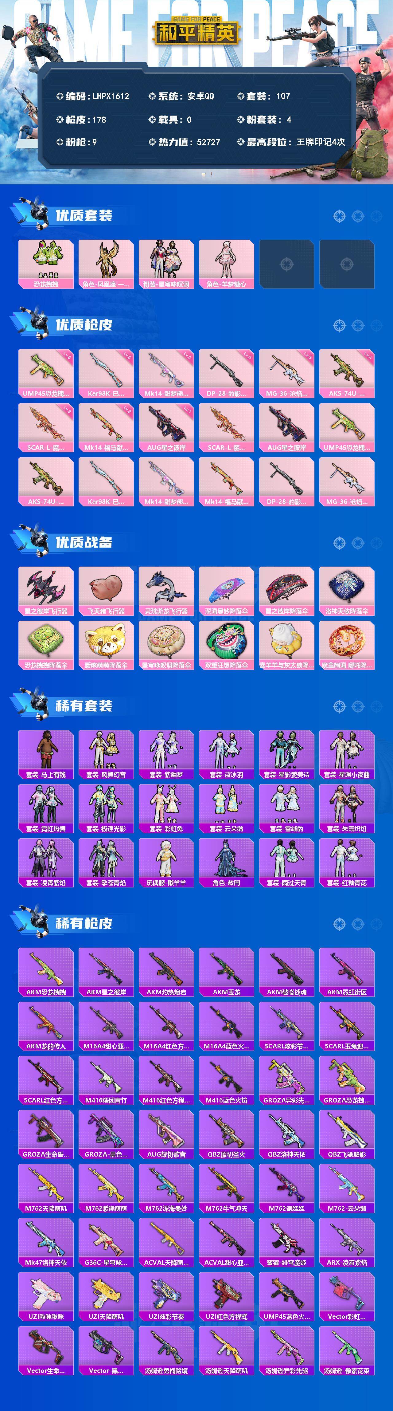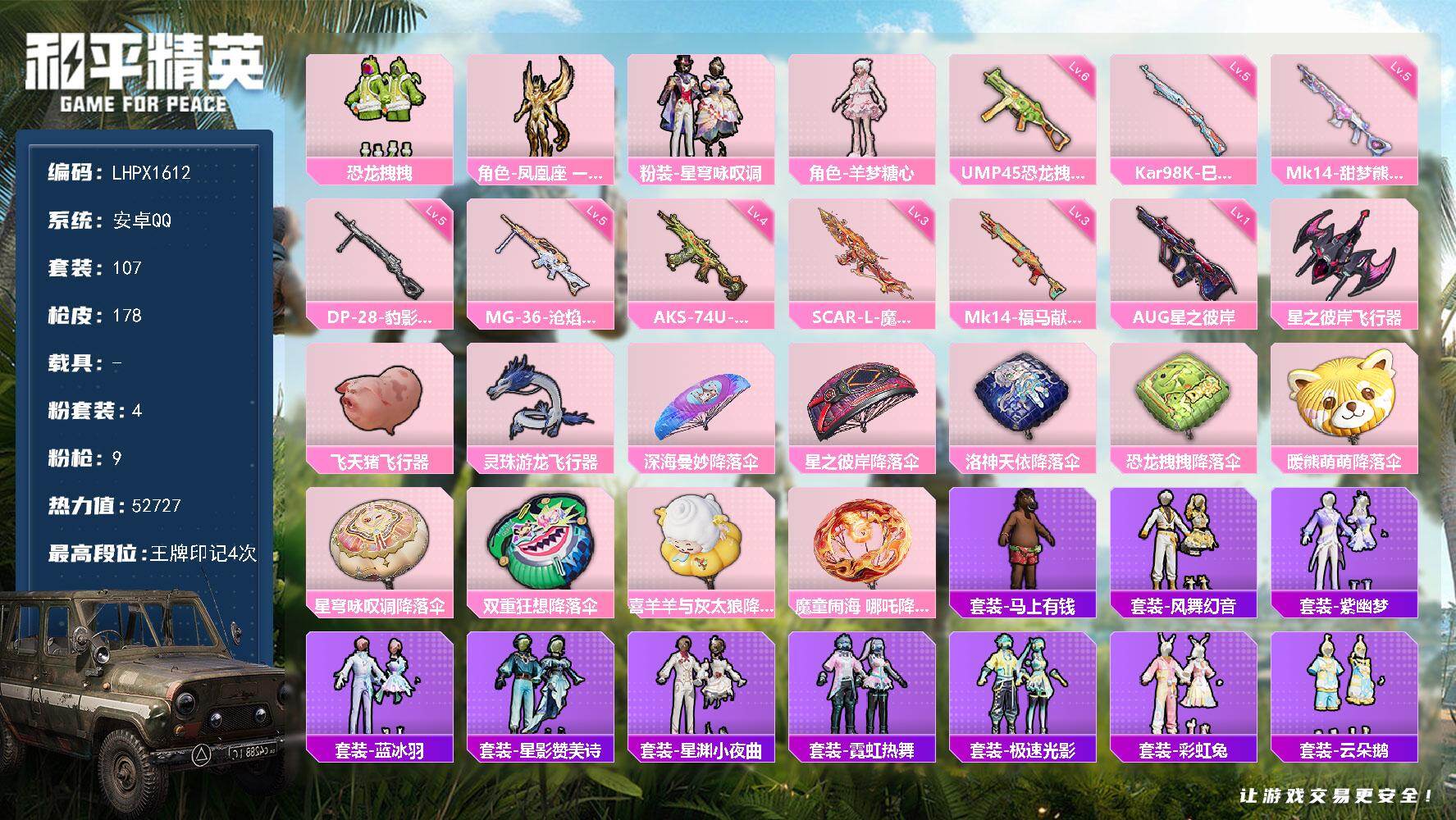 [17712438]【特价出售/店主推荐】安卓 手Q-4粉装-9特效枪-4粉色飞行器-52727热力值-4王牌印记-107套装-178枪皮【粉色套装】:粉装-恐龙拽拽,角色-凤凰座 一辉,粉装-星穹咏叹调,角色-羊梦糖心【粉色枪皮等级】:SCAR-L-魔童闹海 哪吒(三级),AUG-星之彼岸(一级),UMP45-恐龙拽拽(六级),AKS-74U-森灵之息(四级),Kar98K-巳巳如意(五级),Mk14-甜梦熊击(五级),Mk14-福马献瑞(三级),DP-28-豹影疾电(五级),MG-36-沧焰双生(五级)【粉色枪皮】:SCAR-L-魔童闹海 哪吒,AUG-星之彼岸,UMP45-恐龙拽拽,AKS-74U-森灵之息,Kar98K-巳巳如意,Mk14-甜梦熊击,Mk14-福马献瑞,DP-28-豹影疾电,MG-36-沧焰双生【粉色飞行器】:星之彼岸飞行器,飞天猪飞行器,灵珠游龙飞行器
