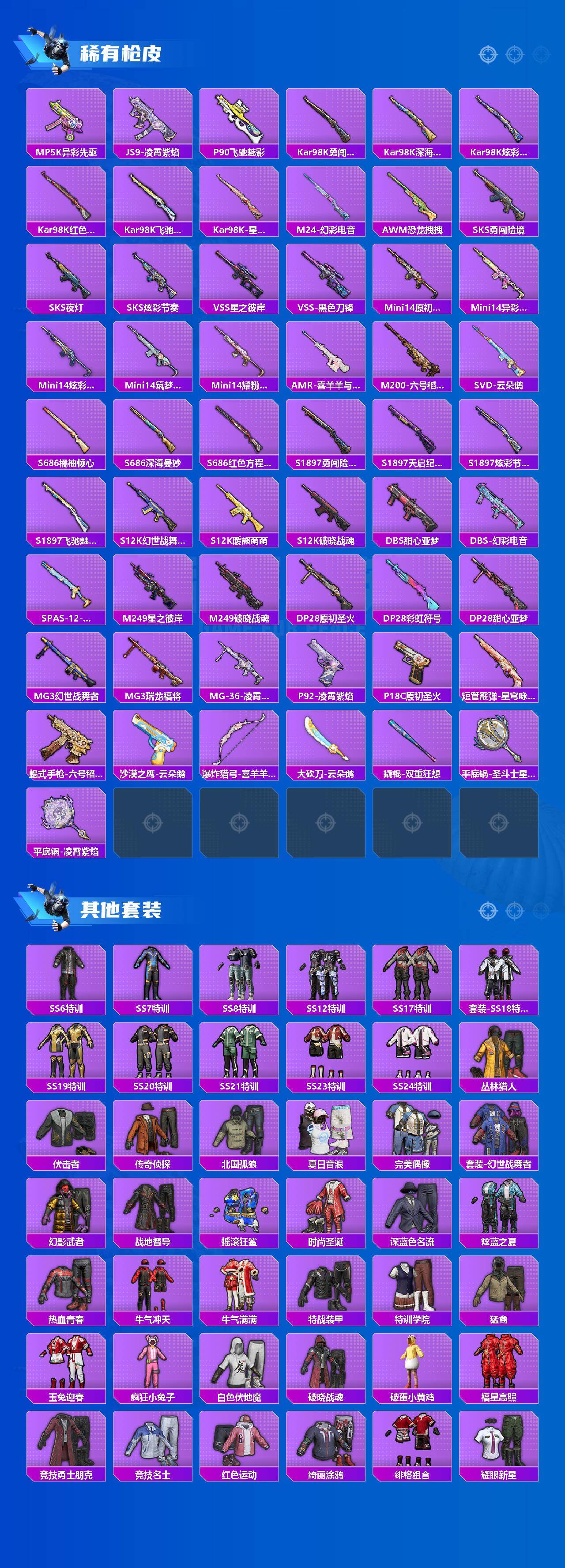 - [17532676]【ky6290】辽宁一区-55V-0王者武器数-0炫金武器数 【热门武器】:M200-幻神,金色蔷薇-古蛇迷踪,修罗-古蛇迷踪,QBZ03-街机,M4A1-黑骑士 【皮肤】:幻神-传奇欧欧 皮肤,白虎-霓虹机甲 皮肤,雷神-荣耀之魄,雷神-源计划2.0专属 皮肤,火麒麟-雷神,火麒麟-冠军之心,火麒麟-战神关羽,毁灭-荣耀之怒,毁灭-英雄计划 皮肤,黑骑士-暗月 【角色】:玄豹,蛇隐宗,奇洋探员,乔伊教练,修道士,云海玲珑,暗夜-X,暗夜审判,初恋灵狐,潘多拉-甜心教官,蛇姬 【人偶武器】:异变清道夫-蛇影双骄,Scar Light-马枪,夺魂 【挑战大师】:冰龙粉碎者-白马银枪,激光毁灭者III-白马银枪 【英雄级武器】:AK47-火麒麟,M4A1-雷神,M4A1-黑骑士,AK12-天启,金色蔷薇-古蛇迷踪,SCAR Light-玄豹,机械迷城-穹宇,Barrett-毁灭,AWM-裁决,M200-幻神,沙鹰-天神*5,Anaconda-玄豹*2,USP-冥王,修罗-古蛇迷踪,屠龙*2,麒麟刺,擎天-竞技荣光,丛林匕首-玄豹*2,高爆手雷-竞技荣光,高爆手雷-古蛇迷踪,高爆手雷-玄豹*8,闪光弹-竞技荣光,闪光弹-玄豹*10,烟雾弹-竞技荣光,烟雾弹-古蛇迷踪,烟雾弹-玄豹*8,M4A1-赤狱骑士,AK47-竞魂无影 【源级武器】:源·火麒麟,火麒麟-雷神,源-黑龙,源·雷神*2,魂·M4A1-雷神-化蛇,魂·雷神-神秘按键,御·雷神-机甲刑天,源·黑骑士,御·黑骑士·哪吒闹海,源·天启,源·武圣,源·机械迷城,魂·龙血-锋芒破茧,魂·HK417-朱雀-凤灵,源-金色蔷薇,魂·QBZ03-金色蔷薇-古蛇迷踪,魂·QBZ03-金色蔷薇-萌杀,QBZ03-文殊坊,魂·英雄-湾区光枢,源-极光,源·天龙,魂·毁灭-神秘黑洞,魂·Barrett-朱雀-锦鲤,魂·炼狱-电子连击,魂·修罗-迷彩,源·天神,灵·天神-穹宇,魂·屠龙-春桃,魂·屠龙-惊鸿,源·龙啸,魂·龙啸-NICE,魂·龙啸-秦师,灵·麒麟刺-穹宇 【道具】:BS战队炫彩背包,CFS限定背包,云山科技背包,古蛇迷踪炫彩背包,超级背包,女皇终结者-魔龙之吻,绿色巨人,灵魂忍者,迷雾幽灵,夺命之镰,防化服*3,流光-鎏金之域,枪王排位29赛季金色流光,古蛇迷踪打击特效,蛇隐宗表情,EP战队名片,防弹头盔*6,防弹
