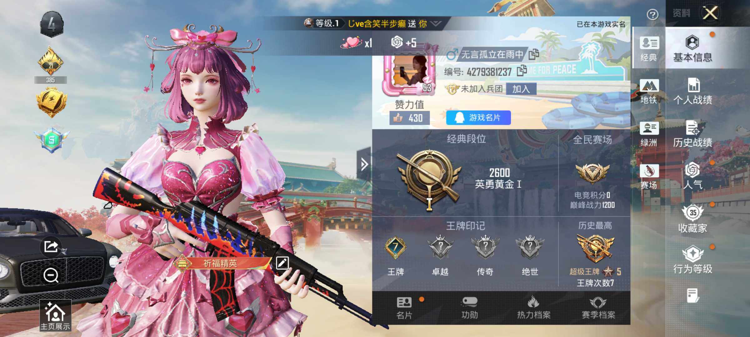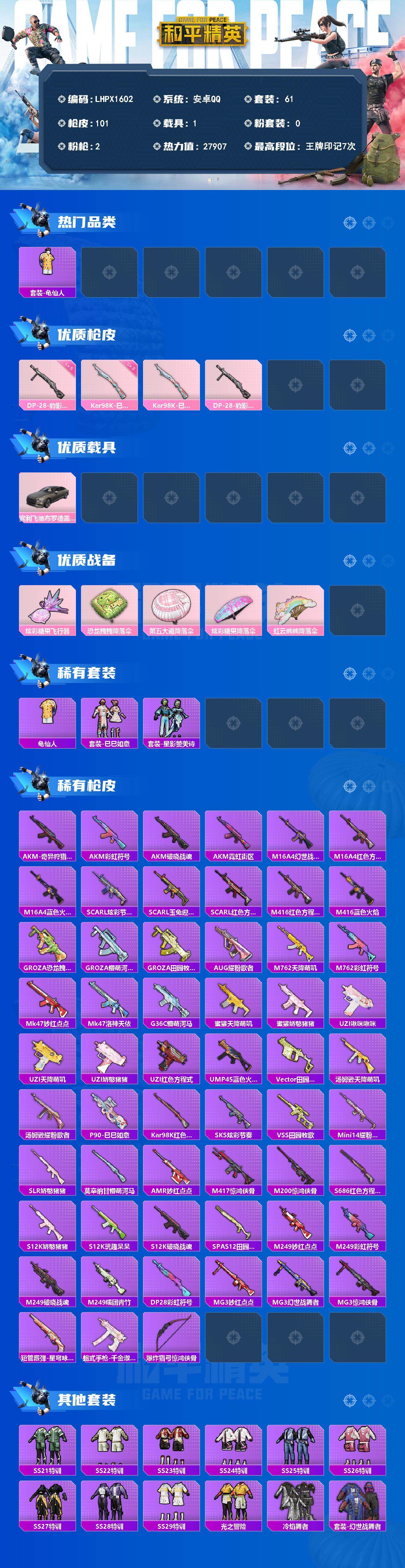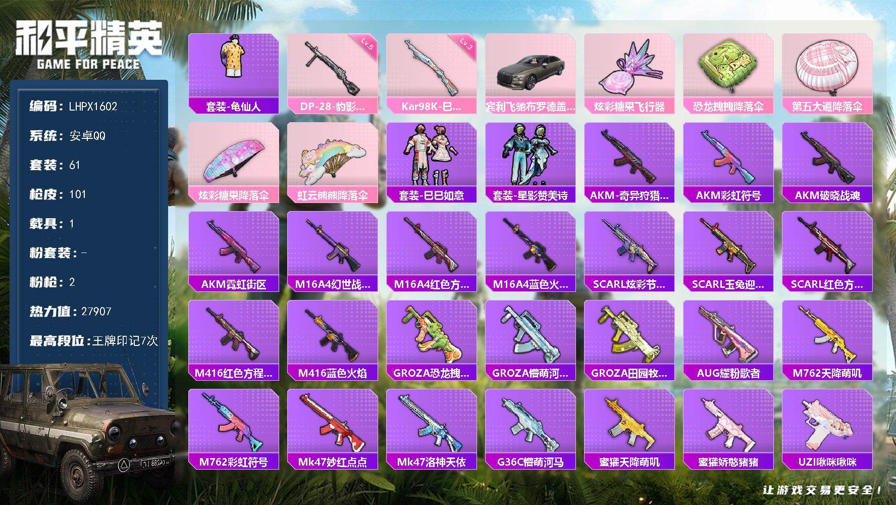 [17712606]可二次【特价出售/店主推荐】安卓 手Q-2特效枪-1载具-1粉色飞行器-27907热力值-7王牌印记-61套装-101枪皮【热门品类】:套装-龟仙人【粉色枪皮等级】:Kar98K-巳巳如意(三级),DP-28-豹影疾电(五级)【粉色载具】:宾利飞驰(布罗德盖棕双色)【粉色枪皮】:Kar98K-巳巳如意,DP-28-豹影疾电【粉色飞行器】:炫彩糖果飞行器