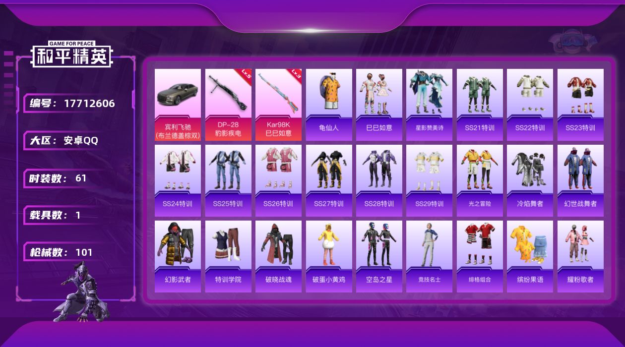 - [17982048]安卓 手Q-4神装-30粉装-34特效枪-10载具-23粉色飞行器-163042热力值-18王牌印记-270套装-431枪皮 【红色神装等级】:暮色玫影-艾丽娅(一级),最终圣卫者-帕修斯(四级),宇宙意志-塞卢姆(一级),沙丘之主-图卡盟(一级) 【红色角色神装】:暮色玫影-艾丽娅,最终圣卫者-帕修斯,宇宙意志-塞卢姆,沙丘之主-图卡盟 【热门品类】:粉装-梦幻火箭,套装-浪漫天命,套装-都市猎人,套装-派对舞王,套装-小丑鱼,套装-奇异狩猎者,角色-军刀雅典娜,套装-龟仙人,角色-Mark.06 【粉色套装】:角色-绝对恒星,粉装-极限特训,粉装-幻影战神,粉装-甜心巧克力,粉装-宝贝奶油派,粉装-天使彩虹糖,粉装-梦幻火箭,粉装-星之彼岸,粉装-暗夜玫瑰,粉装-赤焰黑爵,粉装-紫电风暴,角色-复仇流浪者,粉装-寒光使者,粉装-第五大道,粉装-仲夏莫吉托,角色-宙之时溯,角色-星云暗核,角色-风幻水境,角色-千金淑猫,角色-樱桃泡泡,粉装-星穹咏叹调,角色-狂魅哈莉,角色-绯穹魔姬,角色-奇迹舞步 美琪,角色-奇迹舞步 美雪,角色-异瞳寒姬,人物-小舞,人物-小舞·灵珑,人物-小舞·雪昙,人物-小舞·恋语 【粉色枪皮等级】:AKM-梦之光华(四级),AKM-幽焰骑士(三级),SCAR-L-纯梦嫁纱(六级),SCAR-L-金蛇镇世(三级),M416-风花雪月(六级),M416-天马神君(三级),GROZA-镜光银凌(五级),GROZA-旋星之夜(四级),AUG-星梦奇缘(六级),AUG-许七安(一级),蜜獾-异瞳寒姬(四级),Famas-天象三御(五级),UMP45-宇宙意志(三级),Vector-环太平洋(五级),Vector-最终圣卫者(三级),AKS-74U-星穹咏叹调(四级),AKS-74U-森灵之息(四级),P90-沙丘之主(三级),Kar98K-巳巳如意(五级),Mk14-甜梦熊击(五级),Mk14-爆裂游戏(四级),Mk14-福马献瑞(五级),M417-第五大道(一级),M200-伏羲圣卦(四级),AA12-G-萌骑幻想(四级),M249-绝对恒星(一级),DP-28-千金淑猫(四级),DP-28-豹影疾电(五级),MG3-酷泡奶龙(四级),MG3-辉羽雀灵(三级),M338-回旋牧梦使(四级),烟雾弹-好运连连(四级),燃烧瓶-薄荷可可(四级)