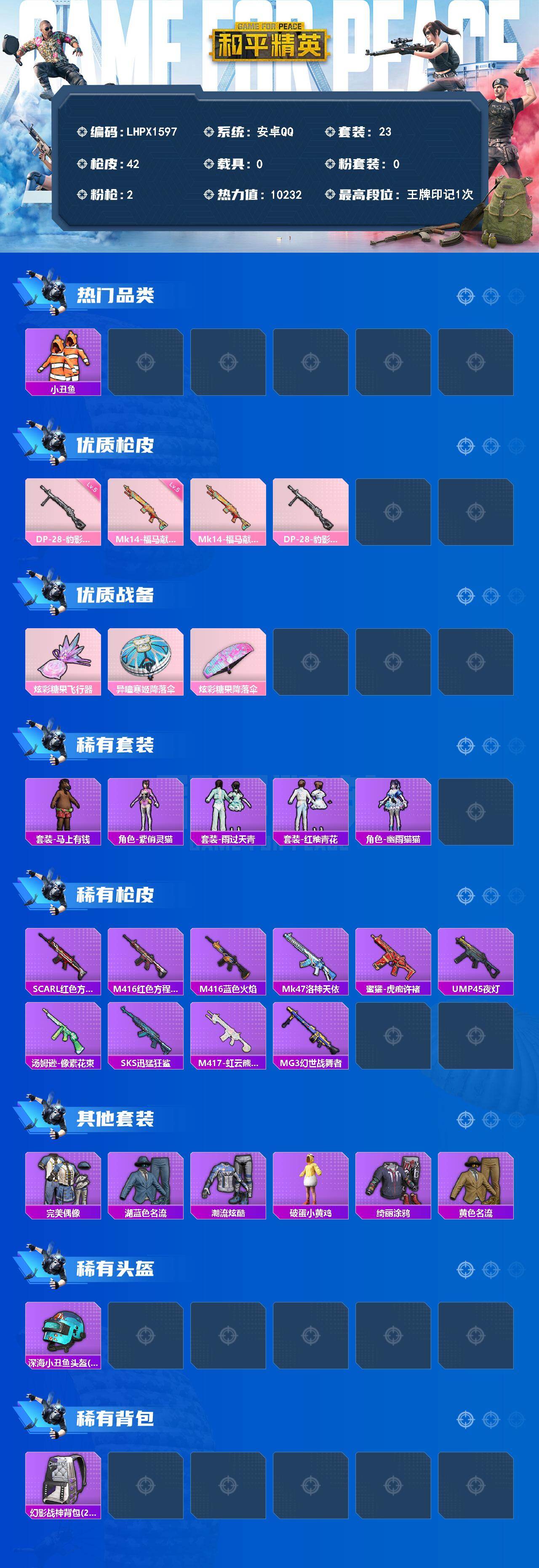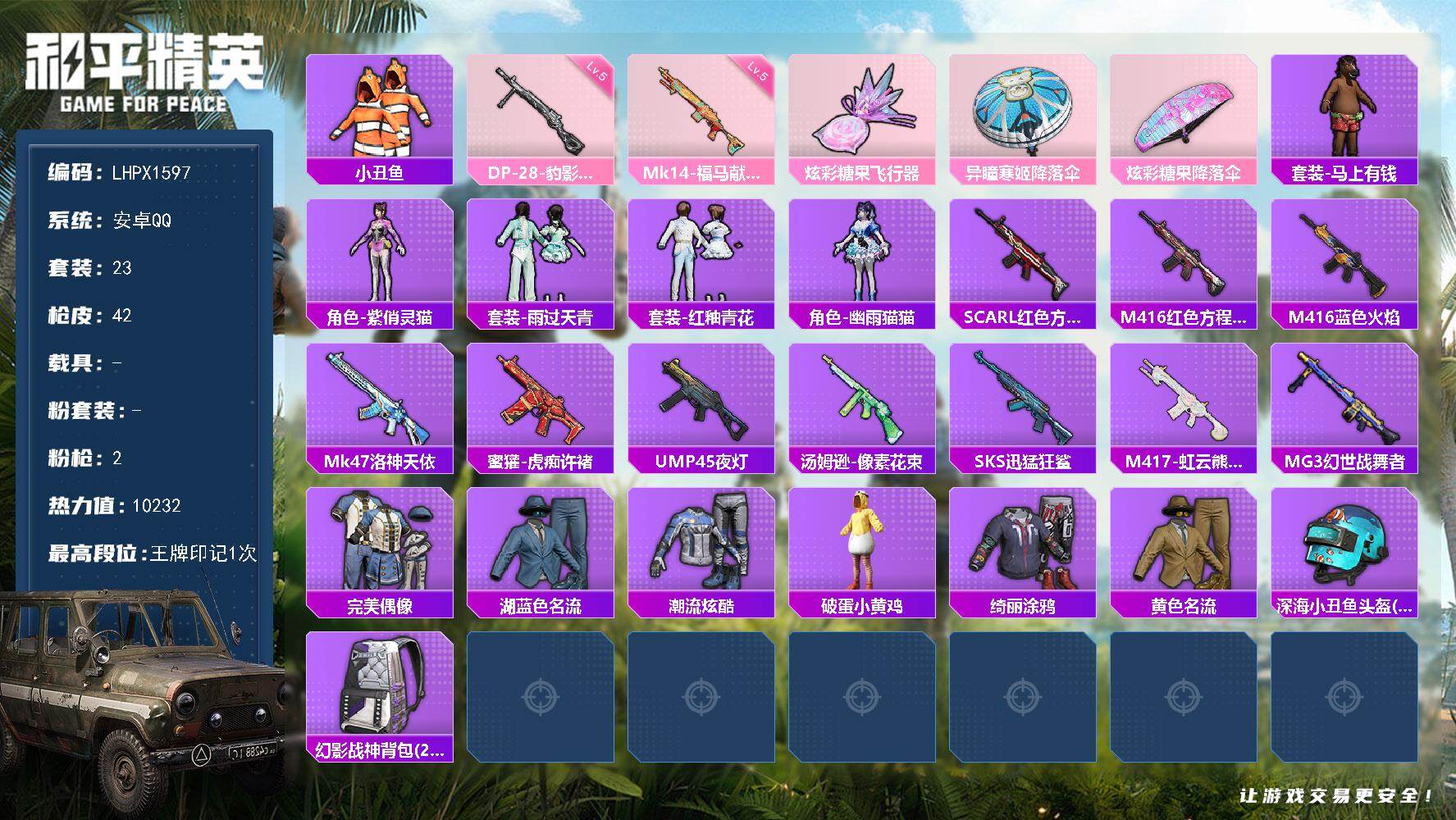[17712672]【特价出售/店主推荐】/绝世印记1 安卓 手Q-0粉装-2特效枪-1粉色飞行器-10232热力值-1王牌印记-23套装-42枪皮【热门品类】:套装-小丑鱼【粉色枪皮等级】:Mk14-福马献瑞(五级),DP-28-豹影疾电(五级)【粉色枪皮】:Mk14-福马献瑞,DP-28-豹影疾电【粉色飞行器】:炫彩糖果飞行器