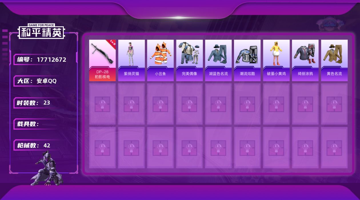- [12955563]素材身法号 安卓 手Q-6粉装-7特效枪-1载具-2粉色飞行器-7w热力值-18王牌印记-193套装-218枪皮【热门品类】:套装-深海小丑鱼,角色-8号机,角色-Mark.06【粉色载具】:玛莎拉蒂Quattroporte(夜幕蓝)【粉色套装】:粉装-齐天大圣,角色-洛天依,粉装-吟月归客,角色-复仇流浪者,角色-呆萌星弥,角色-初号机 觉醒Ver.【粉色枪皮等级】:AKM-绿萝繁花(五级),SCAR-L-锦绣绵绵(五级),UMP45-量子极限(五级),Kar98K-巳巳如意(五级),AMR-智耀战神(四级),M249-蓝莓炮弹(七级),PKM-守护天翼(七级)【粉色飞行器】:齐天大圣飞行器,深渊漩涡飞行器