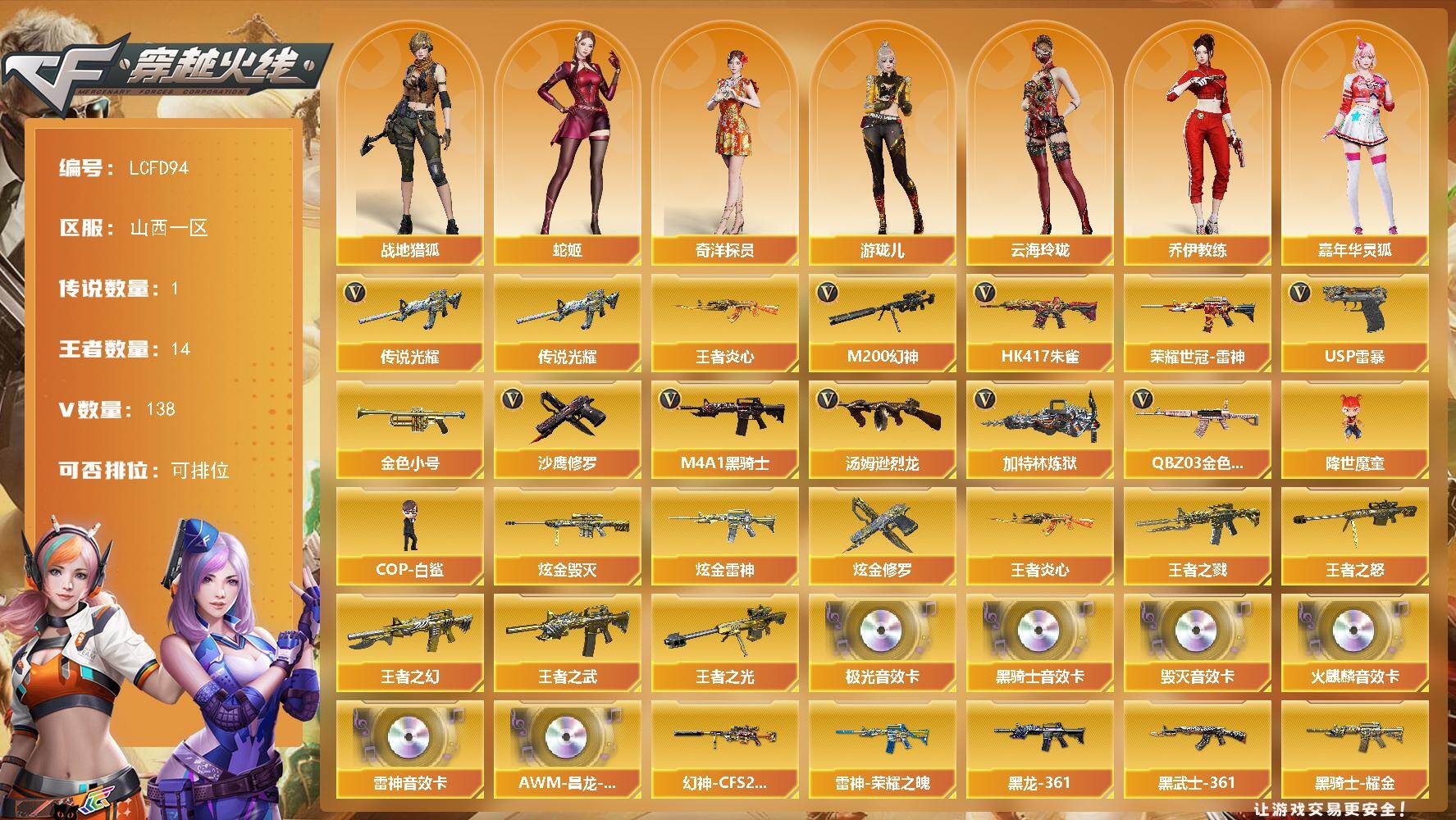 [17713856]山西一区-142V-14王者武器数-5炫金武器数 【传说武器】:传说光耀 【热门武器】:传说光耀,QBZ03-金色蔷薇,HK417-朱雀,M200-幻神,荣耀世冠-雷神,王者炎心,金色小号,M4A1-黑骑士*2,汤姆逊-烈龙*3,加特林-炼狱*8,降世魔童,COP-白鲨,USP-雷暴,沙鹰-修罗*3 【王者炫金武器】:王者炎心,王者之戮,王者之幻,王者之武*3,王者之光*2,王者之怒*2,炫金雷神,炫金毁灭*3,炫金修罗 【音效卡】:AK47-火麒麟音效卡,M4A1-雷神音效卡,M4A1-黑骑士音效卡,Barrett-毁灭音效卡,Barrett-极光音效卡,AWM-昌龙-怀旧音效卡 【皮肤】:幻神-CFS2022,雷神-暗月,雷神-能量核心*2,雷神-荣耀之魄,雷神-虎将,雷神-冠军之魄,火麒麟-雷神,火麒麟-冠军之心,AK47-火麒麟-传奇EVEN,火麒麟-轻羽皮肤,毁灭-荣耀之怒,毁灭耀金皮肤,毁灭-星空,黑龙-能量核心,黑龙-暗月,M4A1-黑龙-361,黑骑士耀金皮肤,黑骑士-冠军之势,无影-能量核心*2,AK47-黑武士-361,战神-粉色甜心皮肤,战神-紫绶金章皮肤*3,战神-流金岁月皮肤,天龙-秘银,AWM-天龙-传奇70KG,AWM-天龙-传奇白鲨,极光-能量核心*3,修罗-能量核心,修罗-星空*2 【角色】:炫,春,战地猎狐,王者-瞳-闭月羞花,王者樱-热浪之夏,王者-零,王者复仇,王者玲珑,狐影,奇洋探员,乔伊教练,云海玲珑,炽天使,芳心审判者,风暴女,嘉年华灵狐,零-水下丽影,潘多拉-X,蛇姬,铁骑荣耀,新灵狐者,新娜塔莎,影武者-X,游珑儿 【人偶武器】:COP-白鲨,火麒麟-灵狐,AWM-灵狐-15周年嘉年华,M37-葵,闪光弹-小乔,巴雷特-赏金猎人,降世魔童 【挑战大师】:神圣爆裂者III,阐释者III 【英雄级武器】:M4A1-千变,AK47-火麒麟*3,M4A1-黑龙*5,M4A1-雷神*5,M4A1-黑骑士*2,AK47-无影*2,M4A1-死神*2,AK47-黑武士*2,AK47-黑鲨*4,M4A1-龙血,M4A1-雷霆,AK47-雷暴,HK417-朱雀,黑武士-锦绣游龙,M4A1-玫瑰精灵*4,QBZ03-金色蔷薇,9A91-烈火*5,王者之心-觉醒版,王者之魄-觉醒版,AK-47-猩红传说*4,AK47-B-战神,荣耀世冠