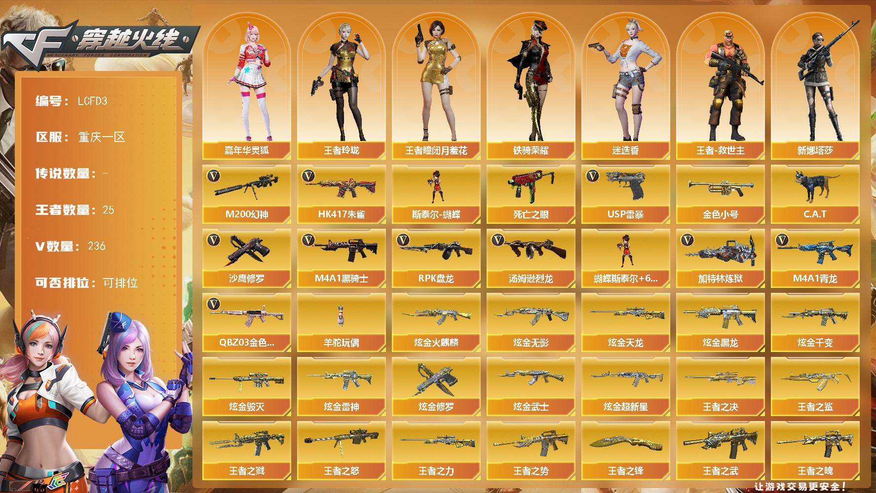 [17713894]幻神+王幻 重庆一区-244V-25王者武器数-17炫金武器数 【热门武器】:QBZ03-金色蔷薇*2,HK417-朱雀,M4A1-青龙,M200-幻神,死亡之眼*2,金色小号,C.A.T*2,M4A1-黑骑士*7,汤姆逊-烈龙*8,RPK-盘龙*5,加特林-炼狱*3,斯泰尔-蝴蝶,羊驼玩偶,USP-雷暴*2,沙鹰-修罗*14 【王者炫金武器】:王者之城,王者冰魄,王者之鲨,王者之戮,王者之势,王者之武,玫瑰精灵-悦动,王者之魄,王者之心,王者之决,王者之怒*2,王者之力,盘龙-悦心,王者之魂,王者之锋*2,炫金火麒麟,炫金无影,炫金黑龙,炫金千变,炫金雷神,炫金武士,炫金超新星*4,炫金毁灭*3,炫金天龙*2,炫金修罗*2 【音效卡】:AK47-火麒麟音效卡,M4A1-雷神音效卡,M4A1-黑骑士音效卡,Barrett-毁灭音效卡 【皮肤】:雷神-暗月,雷神-能量核心*2,雷神-星空,火麒麟-雷神,毁灭耀金皮肤,毁灭-星空,毁灭-AG-CFPLS15冠军,毁灭-CFS2020,黑龙-能量核心,黑龙-暗月,M4A1-黑龙-361,黑骑士耀金皮肤,无影-暗月,无影-能量核心,无影耀金皮肤,死神-秘银,天启-暗月,战神-粉色甜心皮肤,战神-紫绶金章皮肤,战神-流金岁月皮肤*2,天龙-秘银*2,天龙-能量核心*2,AWM-天龙-传奇70KG,AWM-天龙-传奇白鲨,极光-能量核心,修罗-能量核心*5,修罗耀金皮肤,修罗-星空,天神-暗月 【角色】:零,葵,樱,瞳,魅影,炫,春,迷迭香,审判者,王者-瞳-闭月羞花,王者-零,王者之瞳,王者玲珑,王者王力宏,王者-救世主,堕落女神,狐影,空,风暴女,嘉年华灵狐,兰-海滩派对,零-水下丽影,灵狐者-黄金海岸,铁骑荣耀,王者-零-传说之路,新娜塔莎,影武者-X,雅典娜 【人偶武器】:火麒麟-灵狐,M4A1-雷神-精英刀锋,斯泰尔-蝴蝶,AWM-灵狐-15周年嘉年华,M37-葵,COP-旗袍,C.A.T*2,M4A1-刀锋,迷你牛牛*2,迷你生化手雷,闪光弹-小乔 【暴走生化】:死亡之眼*2,超级对讲机 【挑战大师】:VEPR-12-金魔*2,阐释者III 【英雄级武器】:M4A1-千变*2,AK47-火麒麟*4,M4A1-黑龙*3,M4A1-雷神*12,M4A1-黑骑士*7,AK47-无影*2,M4A1-死神*6,AK47-黑武