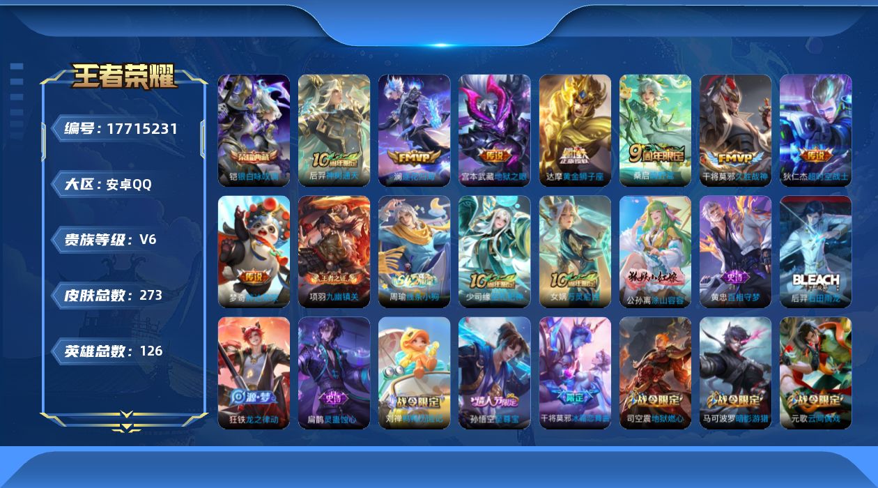[17715231]安卓Q-V6-最强王者段位-126英雄-273皮肤-1典藏皮肤-8传说-72史诗