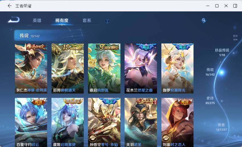 【传说皮肤】:狄仁杰神骥赴朔漠,后羿神树通天,桑启鸣野蒿,花木兰燃星之曲,伽罗炽翼辉光,百里守约碎云,虞姬启明星使,孙悟空零号赤焰,关羽武圣,刘备时之恋人,虞姬云霓雀翎,百里玄策白虎志,后羿黄金射手座,李白凤求凰,宫本武藏地狱之眼,吕布天魔缭乱
