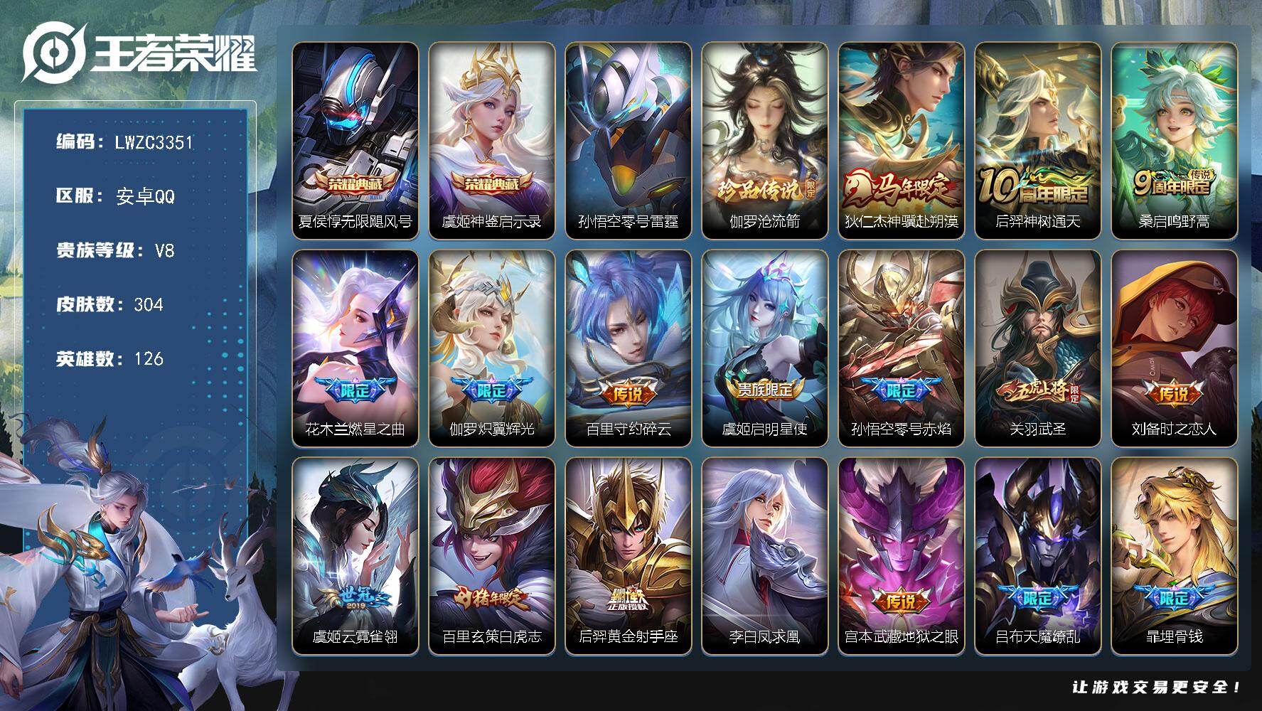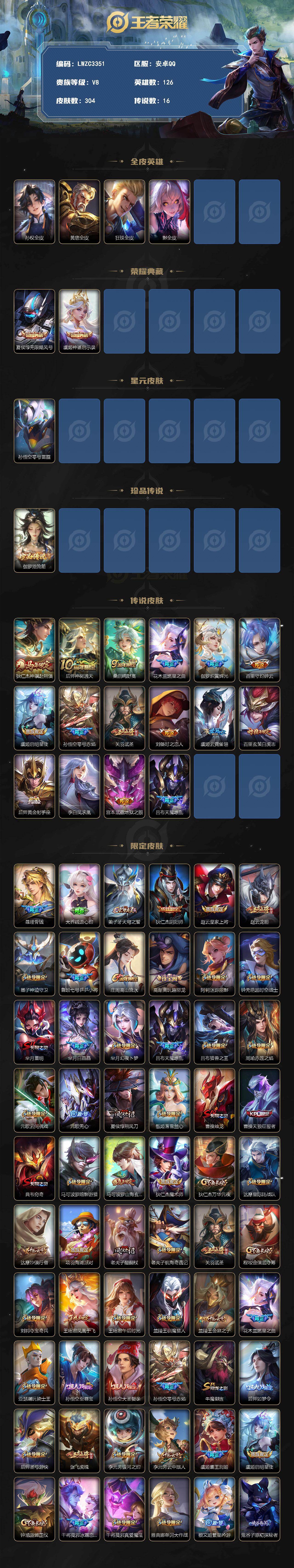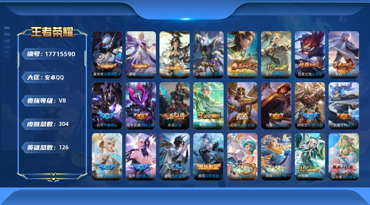 [17715590]可二次【特价出售/店主推荐/5332星币】:安卓Q-V8-最强王者段位-126英雄-304皮肤-2典藏皮肤-1珍品传说-1星元-16传说-84史诗