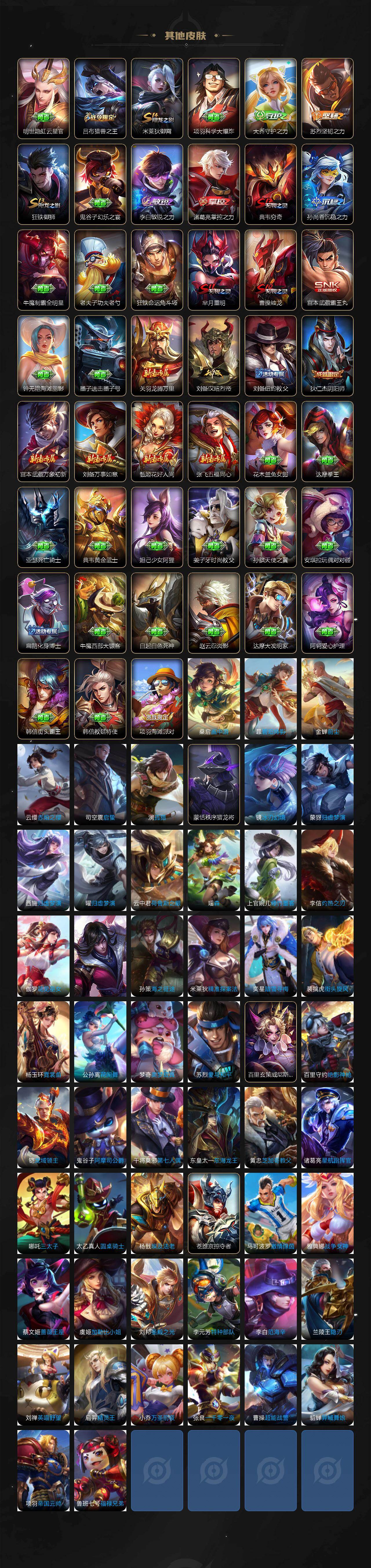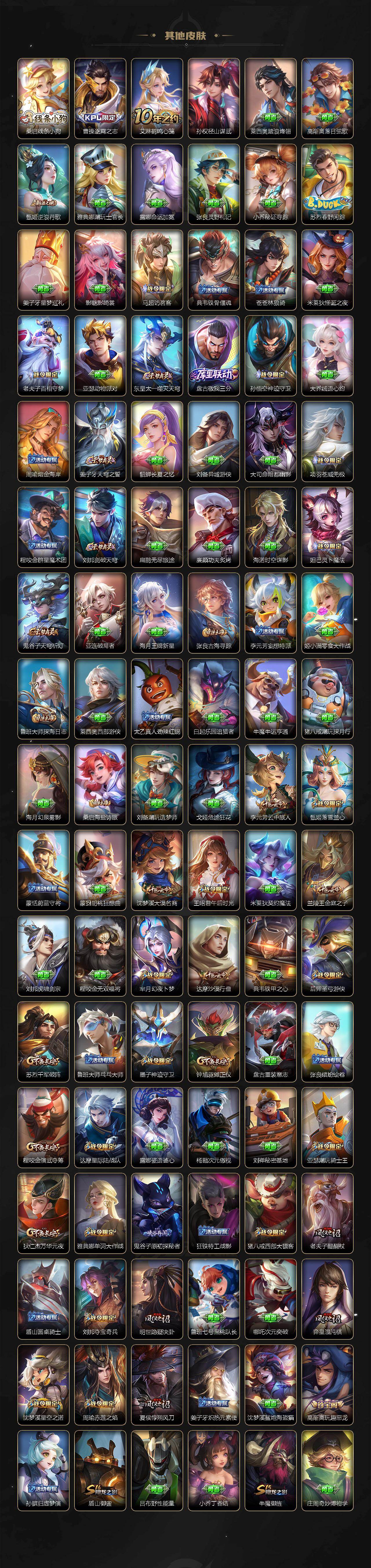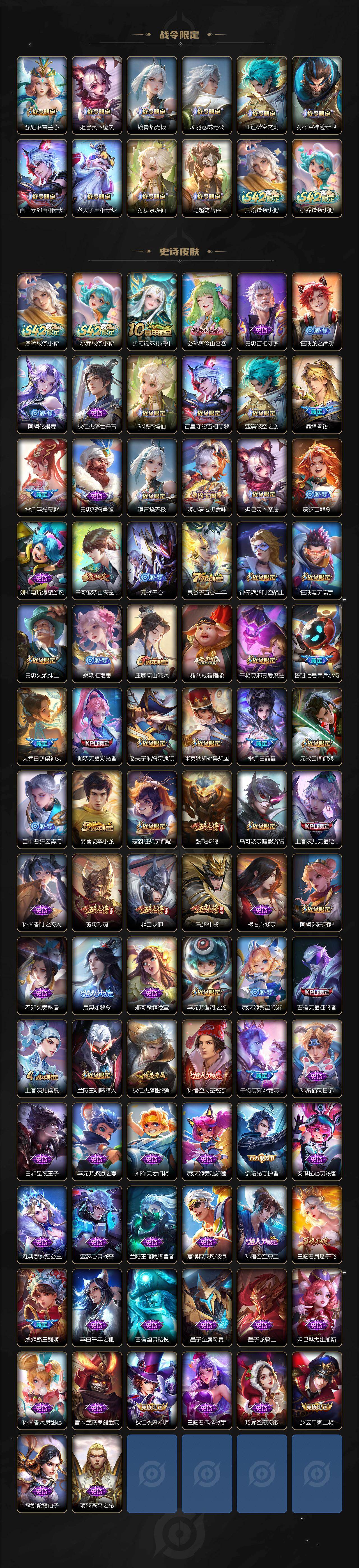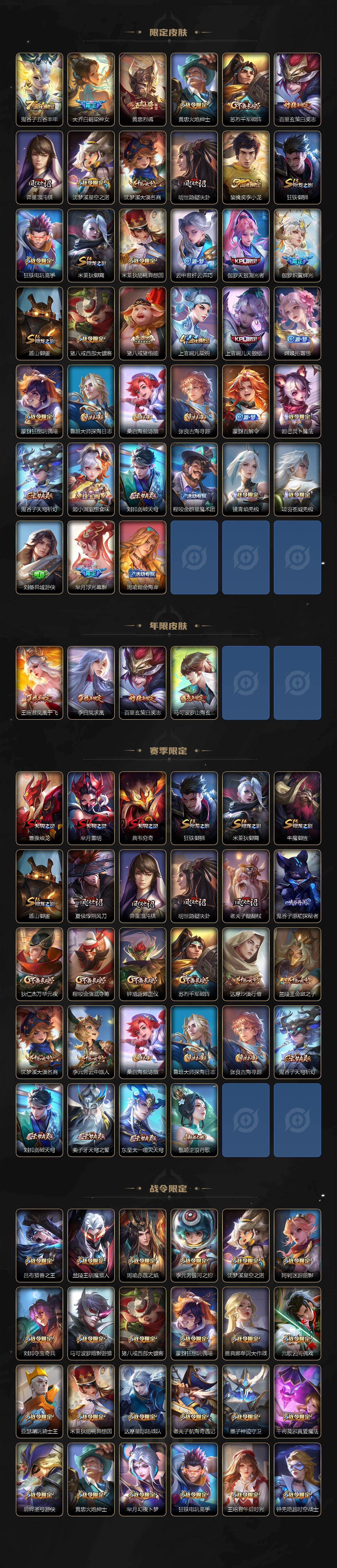 【限定皮肤】:暃埋骨钱,大乔绒语心约,姜子牙天穹之誓,狄仁杰阴阳师,赵云皇家上将,赵云龙胆,墨子神迹守卫,鲁班七号乒乒小将,庄周高山流水,高渐离玩趣恶龙,阿轲迷踪丽影,钟无艳超时空战士,芈月重明,芈月白晶晶,芈月幻夜卜梦,吕布天魔缭乱,吕布猎兽之王,周瑜赤莲之焰,元歌云间偶戏,元歌无心,夏侯惇朔风刀,甄姬落雪兰心,曹操烛龙,曹操天狼征服者,典韦穷奇,马可波罗暗影游猎,马可波罗山海玄木吟,狄仁杰魔术师,狄仁杰万华元夜,达摩星际陆战队,达摩沙漠行僧,项羽海滩派对,老夫子醍醐杖,老夫子航海奇遇记,关羽武圣,程咬金演武夺筹,刘邦夺宝奇兵,王昭君凤凰于飞,王昭君午后时光,兰陵王驯魔猎人,兰陵王金庭之子,花木兰燃星之曲,亚瑟潮玩骑士王,孙悟空至尊宝,孙悟空大圣娶亲,孙悟空零号赤焰,牛魔御旌,后羿如梦令,后羿圣弓游侠,张飞虎魄,李元芳银河之约,李元芳云中旅人,虞姬霸王别姬,虞姬启明星使,钟馗驱傩正仪,干将莫邪冰霜恋舞曲,干将莫邪真爱魔法,雅典娜单词大作战,蔡文姬繁星吟游,鬼谷子原初探秘者,鬼谷子五谷丰年,大乔白鹤梁神女,黄忠烈魂,黄忠火炮绅士,苏烈千军破阵,百里玄策白虎志,弈星混沌棋,沈梦溪星空之诺,沈梦溪大漠名商,明世隐疑决卦,裴擒虎李小龙,狂铁御狮,狂铁电玩高手,米莱狄御霄,米莱狄胡桃异想国,云中君纤云弄巧,伽罗天狼溯光者,伽罗炽翼辉光,盾山御銮,猪八戒西部大镖客,猪八戒猪悟能,上官婉儿梁祝,上官婉儿天狼绘梦者,嫦娥拒霜思,蒙犽狂想玩偶喵,鲁班大师探海日志,桑启海盐诗旅,张良古海寻踪,蒙犽百解令,妲己灵卜魔法,鬼谷子天穹祈灯,姬小满妄想食味,刘邦剑破天穹,程咬金群星魔术团,镜青焰无极,项羽苍威无极,刘备异域游侠,芈月浮光幕影,周瑜熔金海岸