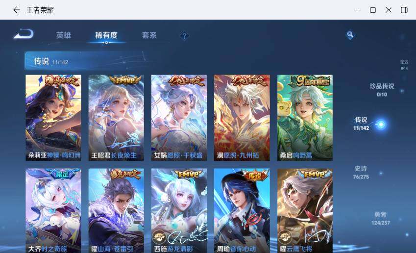 【传说皮肤】:朵莉亚神骥鸣幻洲,王昭君长夜焕生,女娲愿照千秋盛,澜愿照九州拓,桑启鸣野蒿,大乔时之奇旅,曜山海苍雷引,西施游龙清影,周瑜音你心动,曜云鹰飞将,诸葛亮武陵仙君