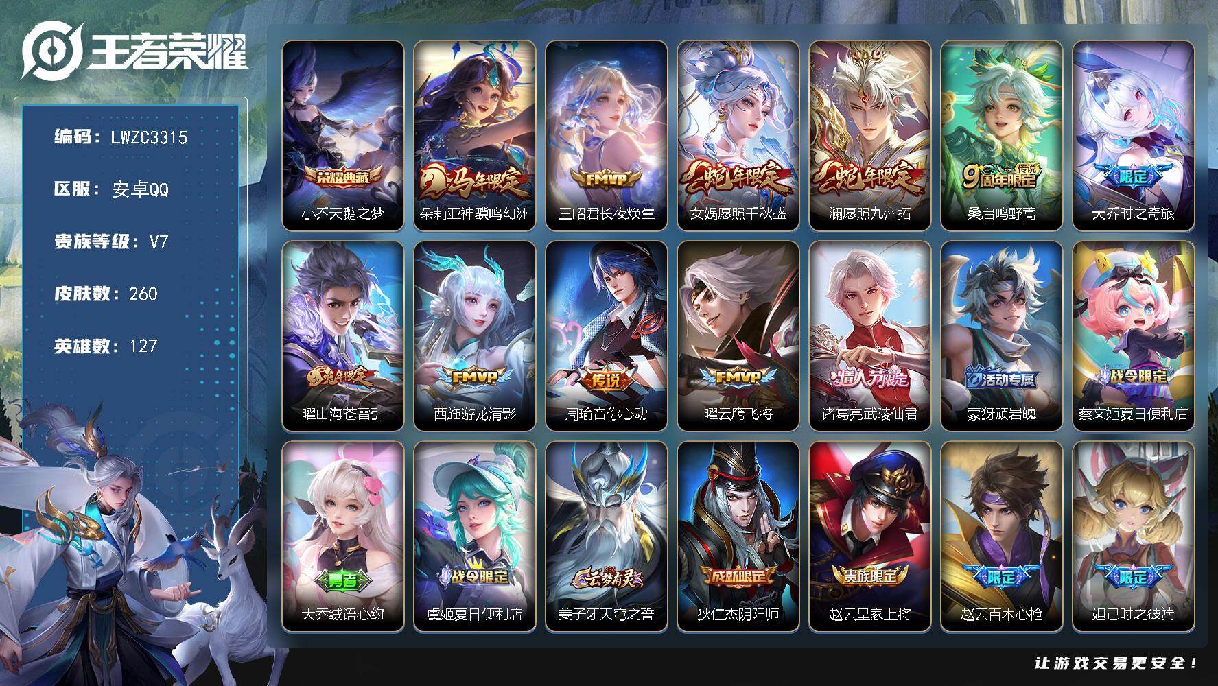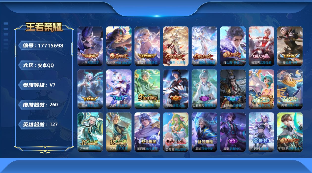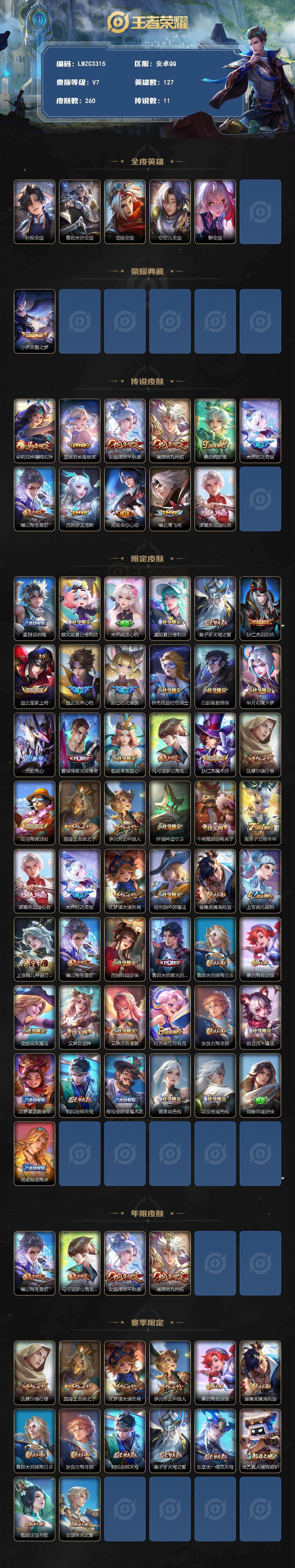 [17715698]【特价出售/店主推荐/1市标】:安卓Q-V7-最强王者段位-127英雄-260皮肤-1典藏皮肤-11传说-75史诗