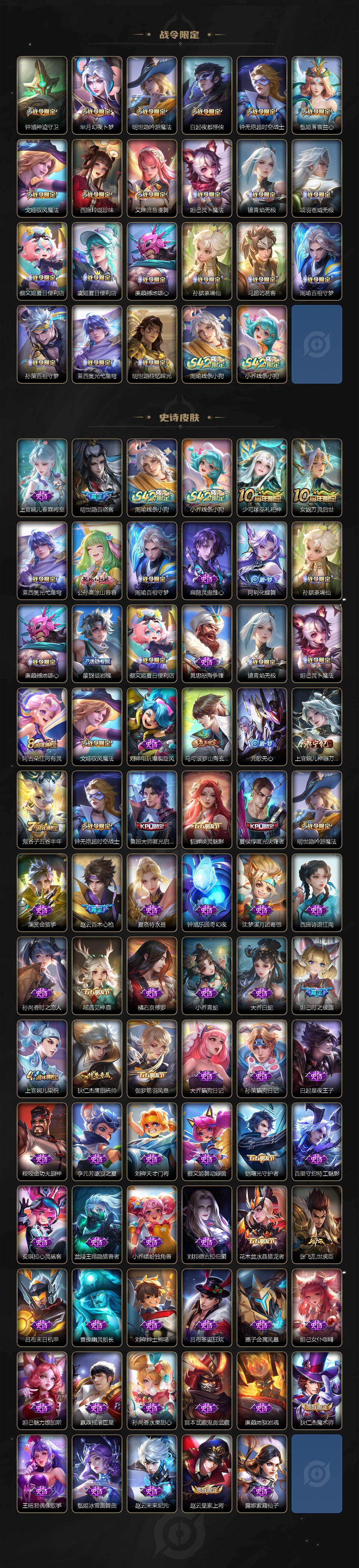 【战令限定】:钟馗神迹守卫,芈月幻夜卜梦,明世隐吟游魔法,白起夜都怪侠,钟无艳超时空战士,甄姬落雪兰心,戈娅驭风魔法,西施玲珑珍味,艾琳流音漫舞,妲己灵卜魔法,镜青焰无极,项羽苍威无极,蔡文姬夏日便利店,虞姬夏日便利店,廉颇撼地雄心,孙膑茶境仙,马超访茗客,周瑜百相守梦,孙策百相守梦,莱西奥光弋星穹,明世隐往忆晖光,周瑜线条小狗,小乔线条小狗