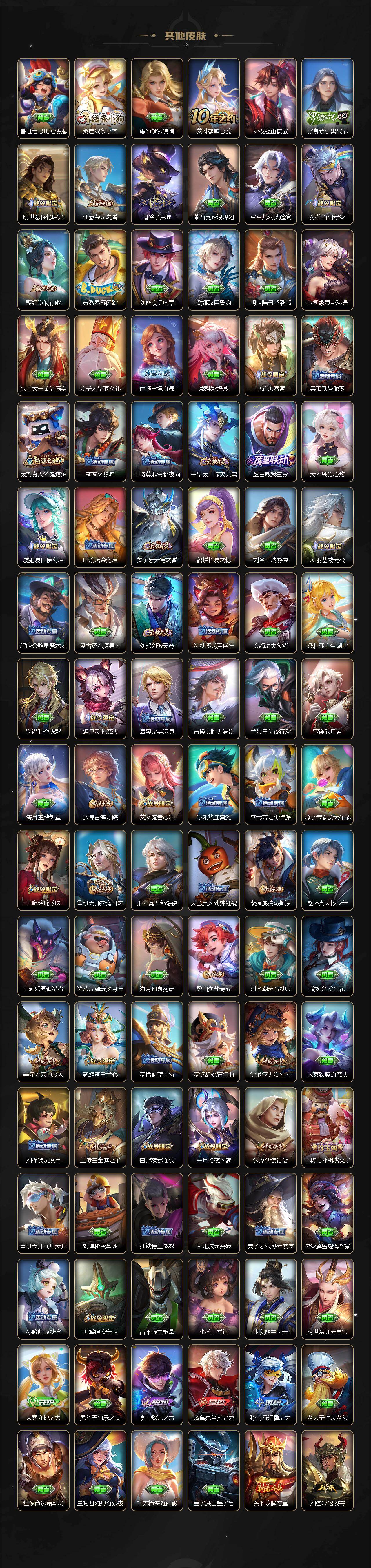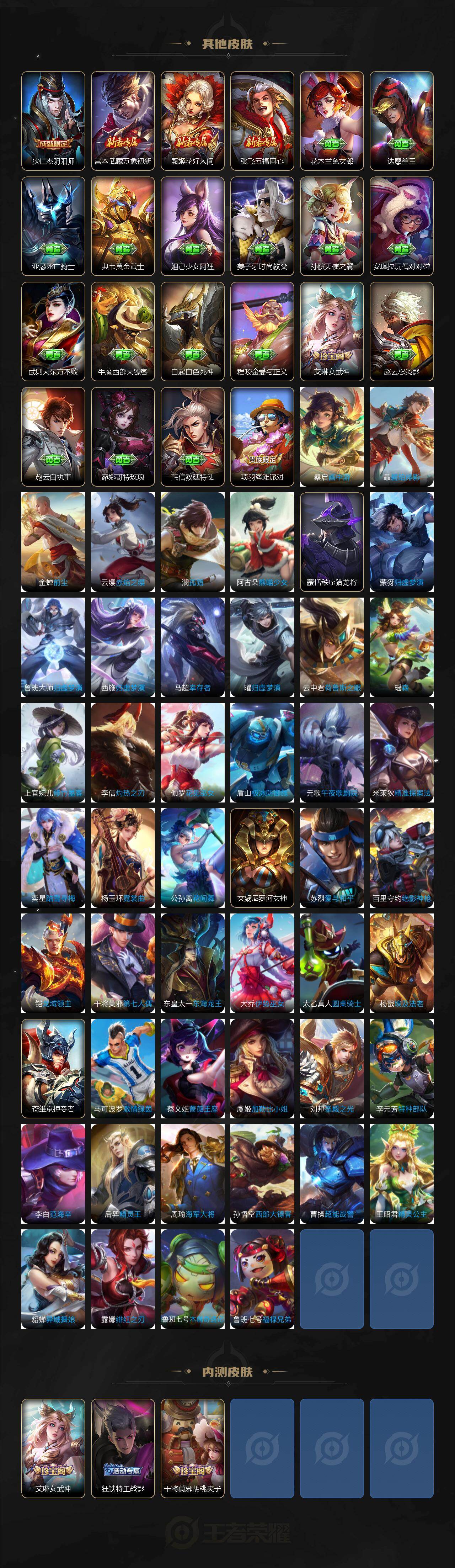 【限定皮肤】:蒙犽顽岩魄,蔡文姬夏日便利店,大乔绒语心约,虞姬夏日便利店,姜子牙天穹之誓,狄仁杰阴阳师,赵云皇家上将,赵云百木心枪,妲己时之彼端,钟无艳超时空战士,白起夜都怪侠,芈月幻夜卜梦,元歌无心,夏侯惇匿光决锋者,甄姬落雪兰心,马可波罗山海玄木吟,狄仁杰魔术师,达摩沙漠行僧,项羽海滩派对,兰陵王金庭之子,李元芳云中旅人,钟馗神迹守卫,干将莫邪胡桃夹子,鬼谷子五谷丰年,诸葛亮武陵仙君,大乔时之奇旅,沈梦溪大漠名商,明世隐吟游魔法,裴擒虎擒涛扼浪,上官婉儿梁祝,上官婉儿神器万象笔,曜山海苍雷引,西施玲珑珍味,鲁班大师匿光启智者,鲁班大师探海日志,桑启海盐诗旅,戈娅驭风魔法,艾琳女武神,艾琳流音漫舞,阿古朵江河有灵,张良古海寻踪,妲己灵卜魔法,沈梦溪龙舞盛年,刘邦剑破天穹,程咬金群星魔术团,镜青焰无极,项羽苍威无极,刘备异域游侠,周瑜熔金海岸