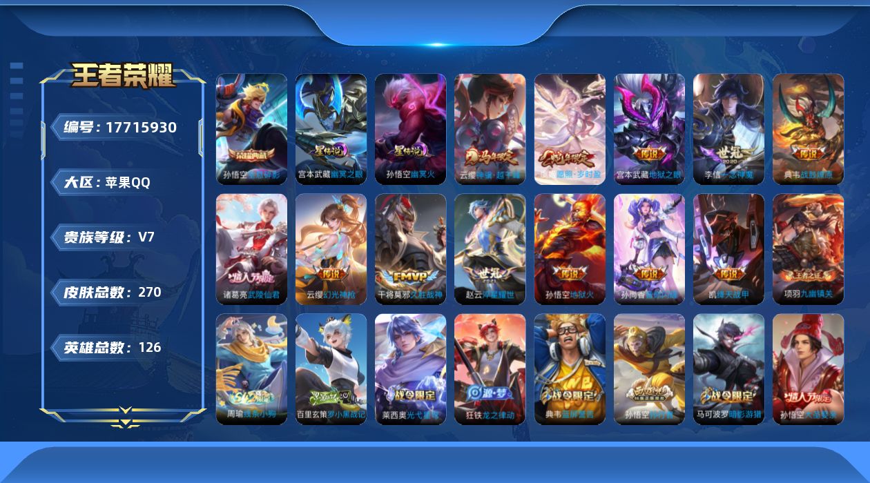 [17715930]【特价急出/详情看图】苹果Q-V7-最强王者段位-126英雄-270皮肤-1典藏皮肤-2星元-12传说-74史诗