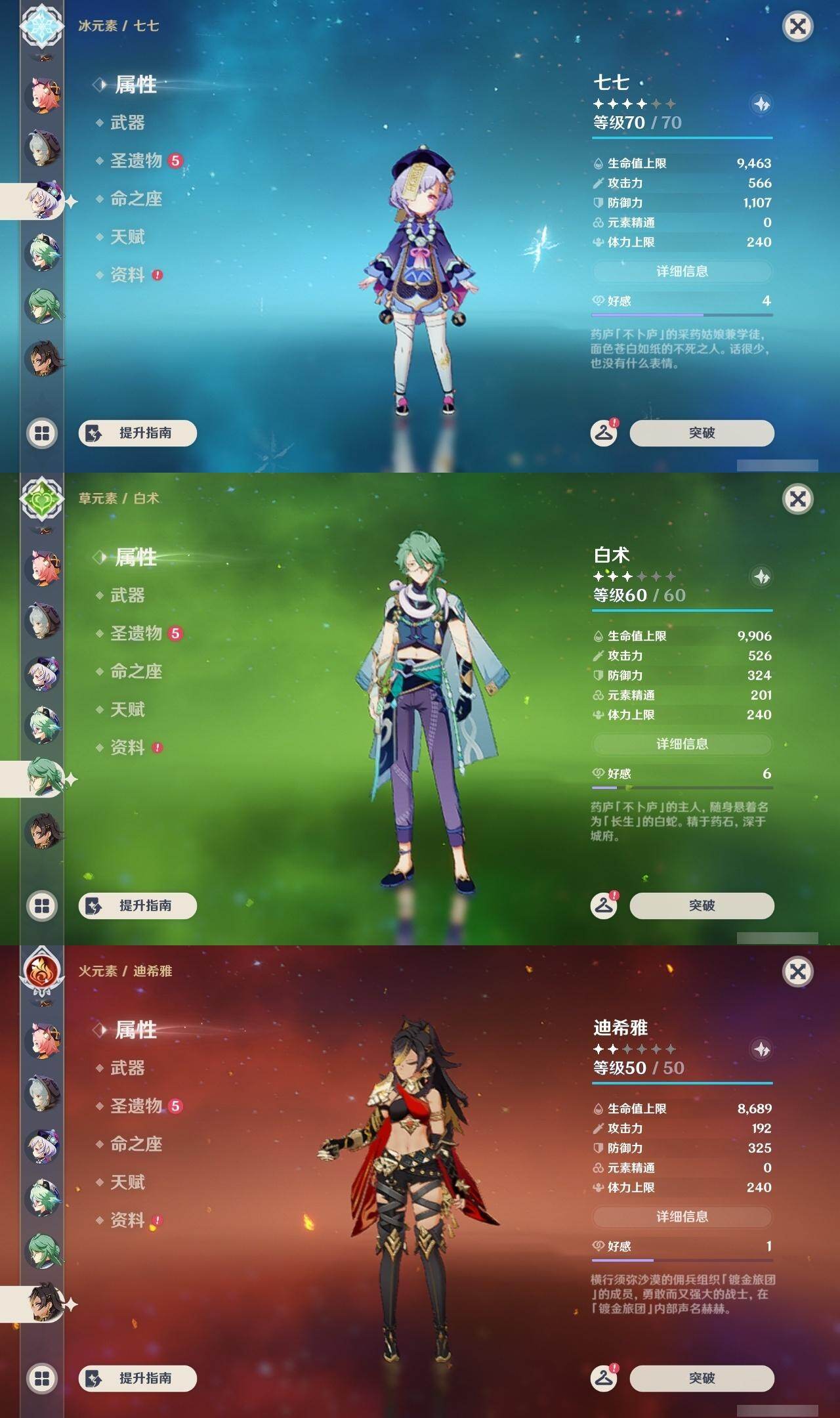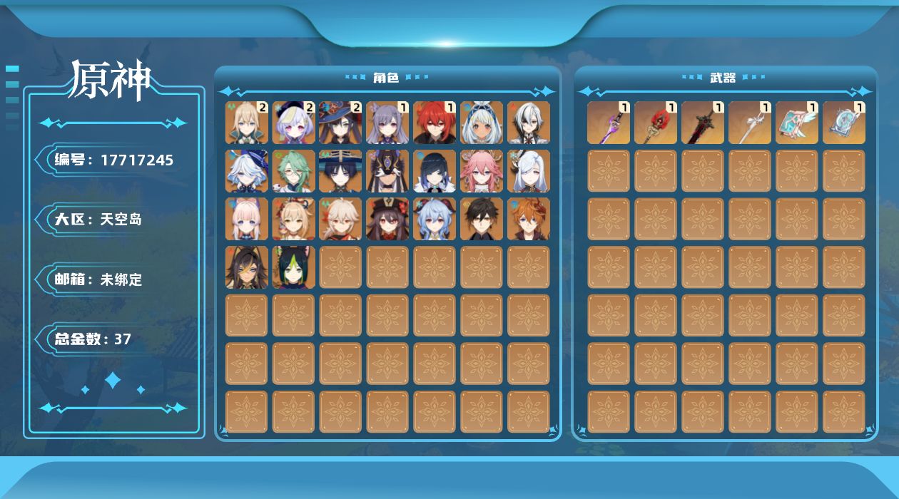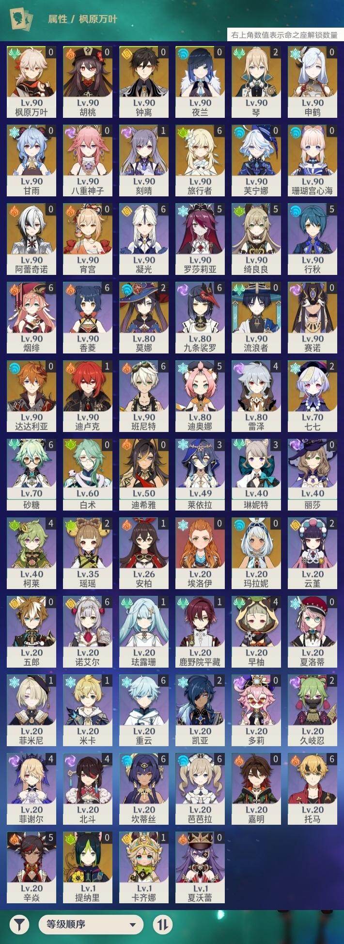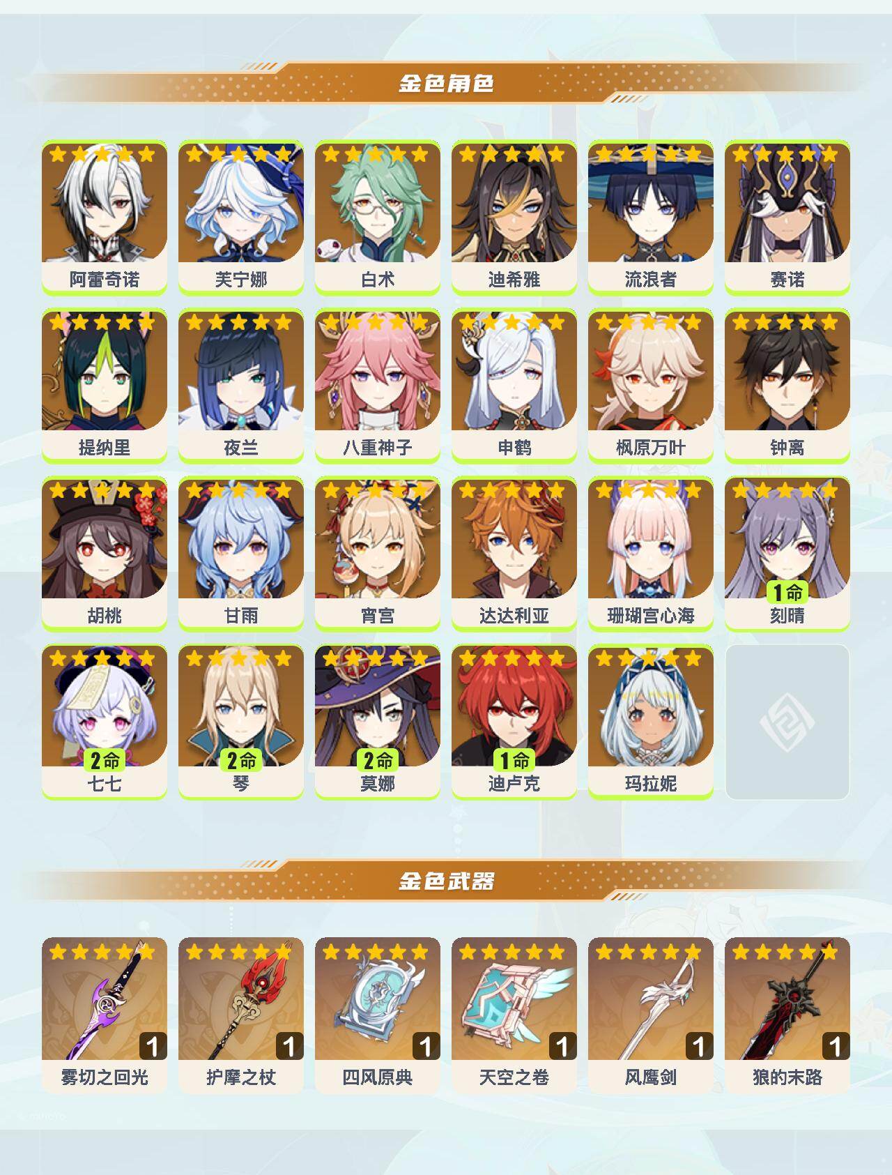0命阿蕾奇诺,0命芙宁娜,0命白术,0命迪希雅,0命流浪者,0命赛诺,0命提纳里,0命夜兰,0命八重神子,0命申鹤,0命枫原万叶,0命钟离,0命胡桃,0命甘雨,0命宵宫,0命达达利亚,0命珊瑚宫心海,1命刻晴,2命七七,2命琴,2命莫娜,1命迪卢克,0命玛拉妮,精1雾切之回光,精1护摩之杖,精1四风原典,精1天空之卷,精1风鹰剑,精1狼的末路