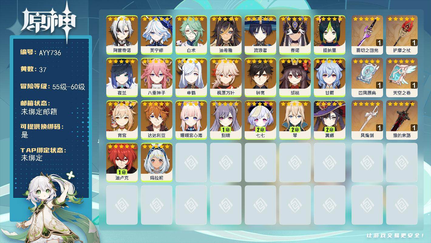 [17717245]【店主推荐捡漏号】59级/37黄/女主/23个五星角色/6个五星武器 0命阿蕾奇诺,0命芙宁娜,0命白术,0命迪希雅,0命流浪者,0命赛诺,0命提纳里,0命夜兰,0命八重神子,0命申鹤,0命枫原万叶,0命钟离,0命胡桃,0命甘雨,0命宵宫,0命达达利亚,0命珊瑚宫心海,1命刻晴,2命七七,2命琴,2命莫娜,1命迪卢克,0命玛拉妮,精1雾切之回光,精1护摩之杖,精1四风原典,精1天空之卷,精1风鹰剑,精1狼的末路