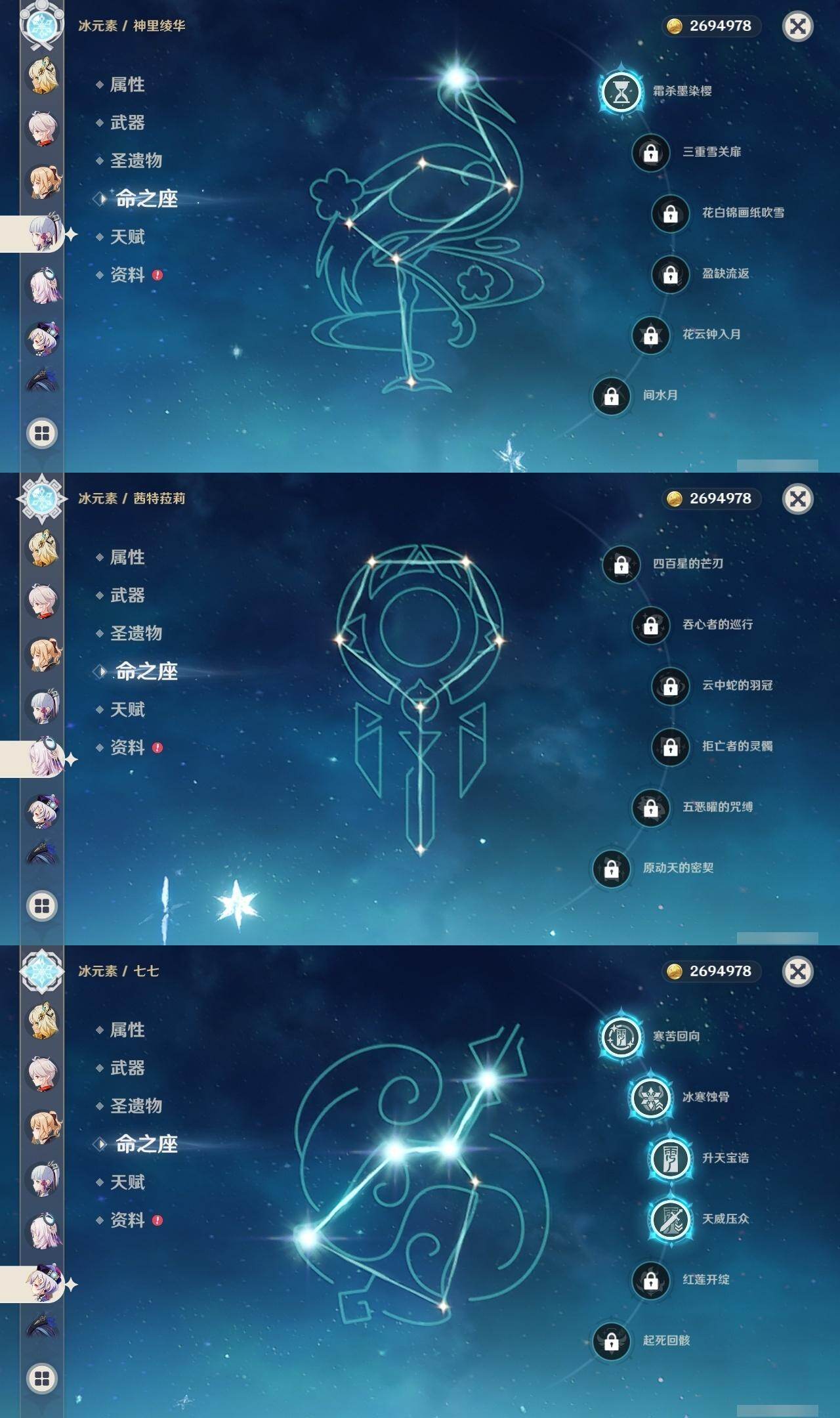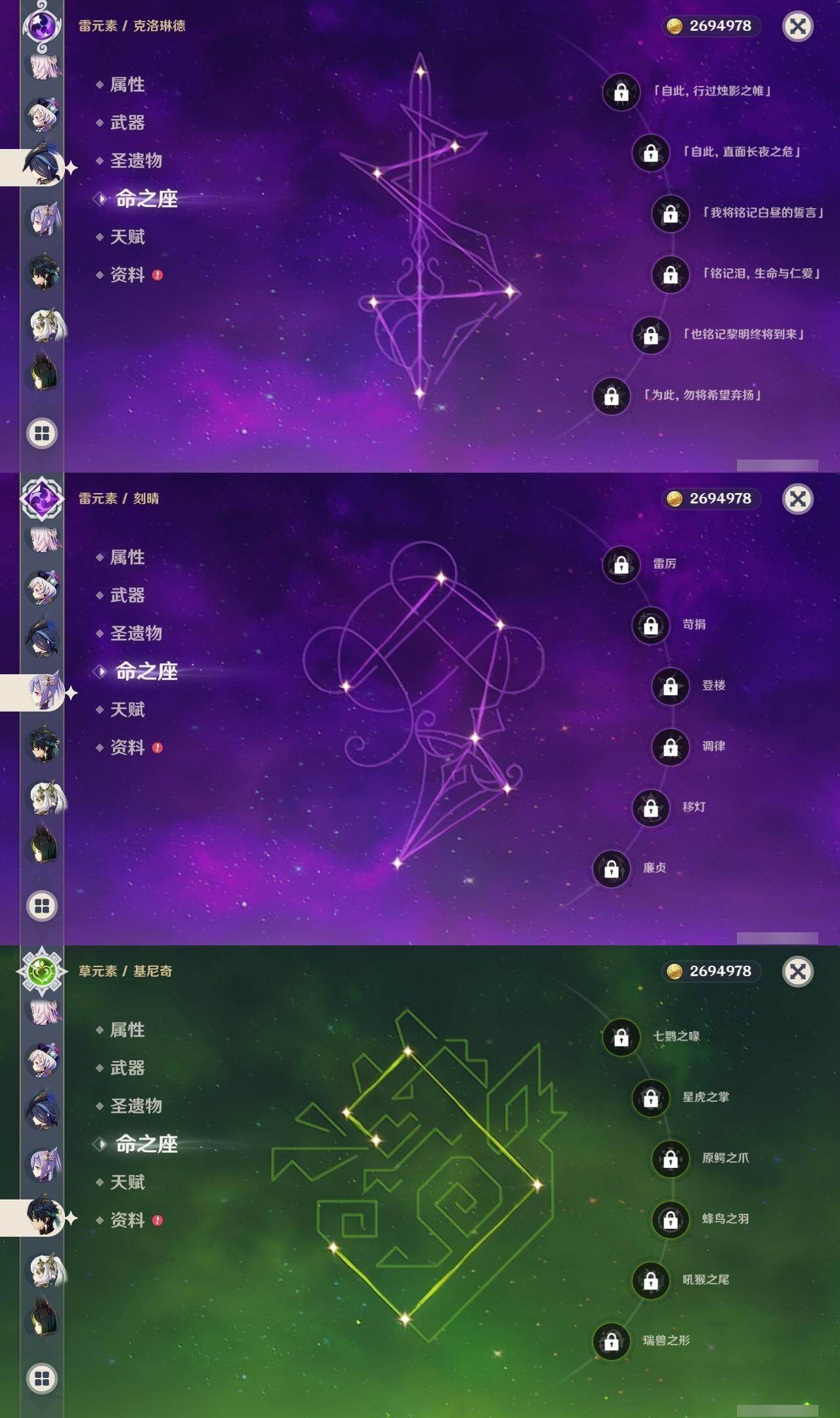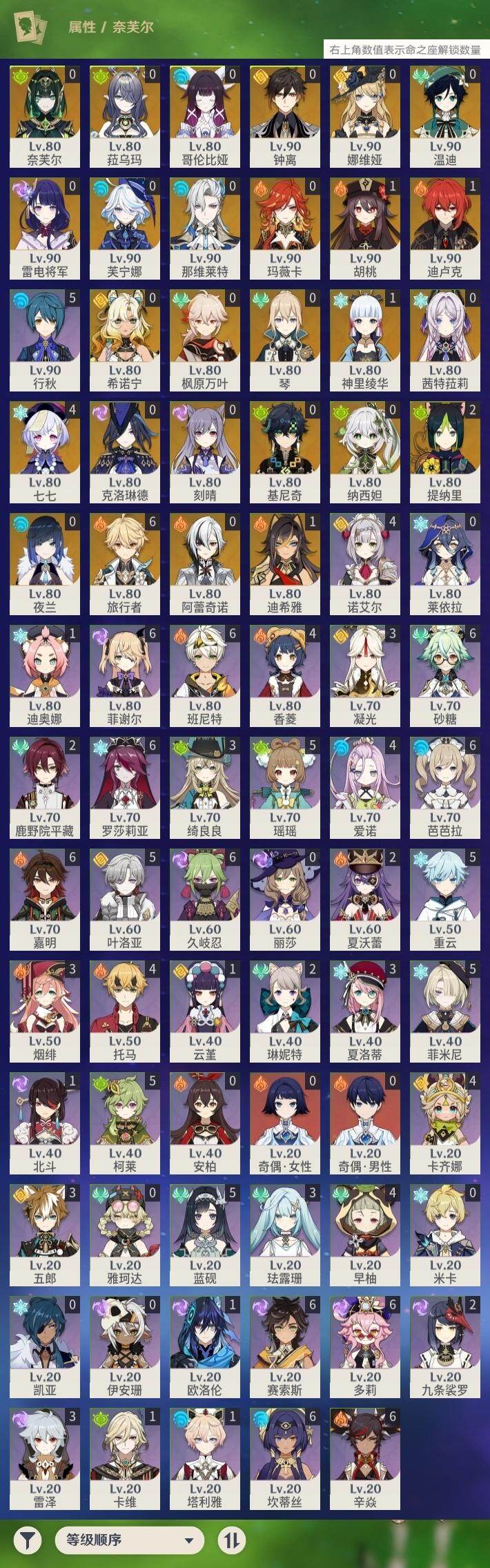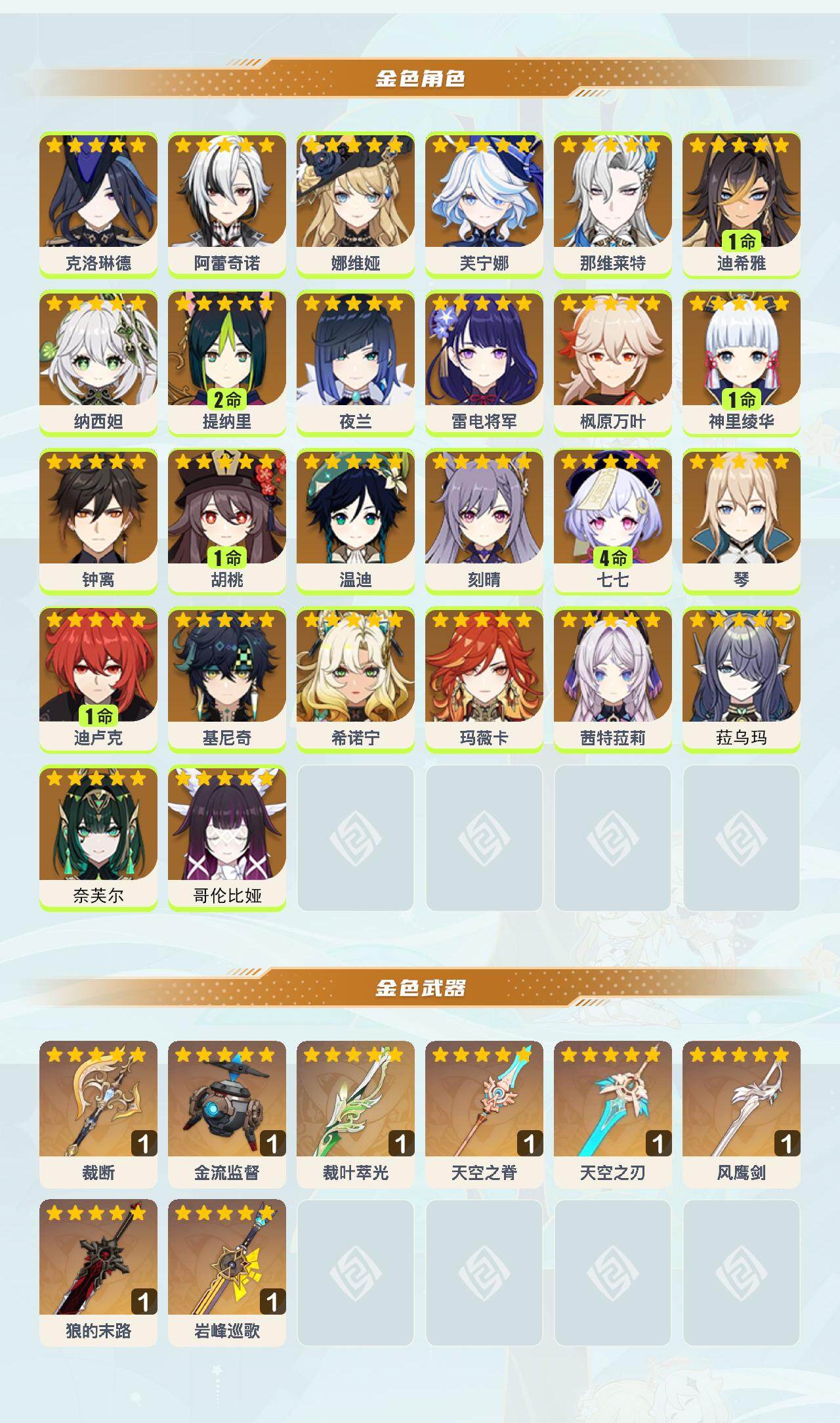 0命克洛琳德,0命阿蕾奇诺,0命娜维娅,0命芙宁娜,0命那维莱特,1命迪希雅,0命纳西妲,2命提纳里,0命夜兰,0命雷电将军,0命枫原万叶,1命神里绫华,0命钟离,1命胡桃,0命温迪,0命刻晴,4命七七,0命琴,1命迪卢克,0命基尼奇,0命希诺宁,0命玛薇卡,0命茜特菈莉,0命菈乌玛,0命奈芙尔,0命哥伦比娅,精1裁断,精1金流监督,精1裁叶萃光,精1天空之脊,精1天空之刃,精1风鹰剑,精1狼的末路,精1岩峰巡歌