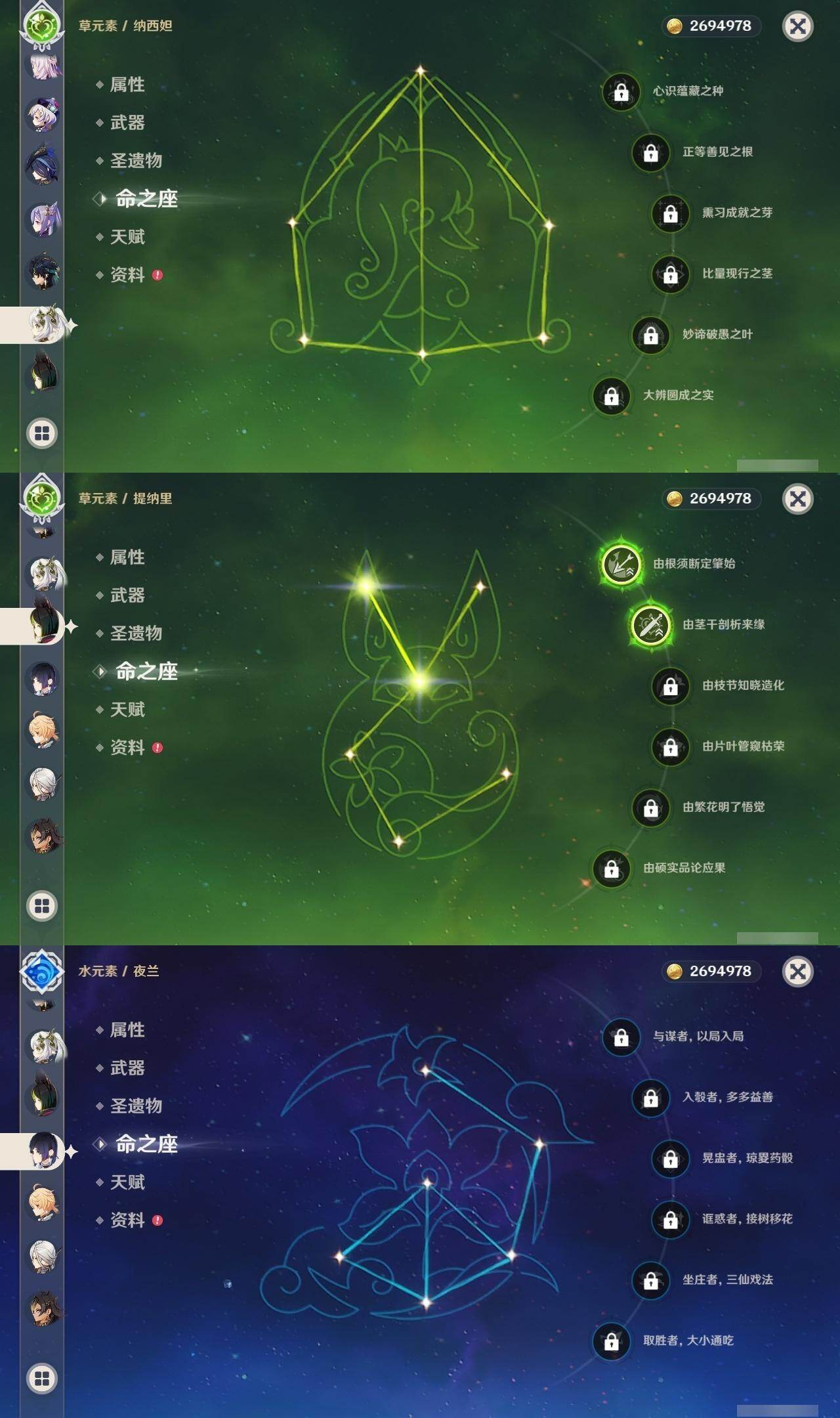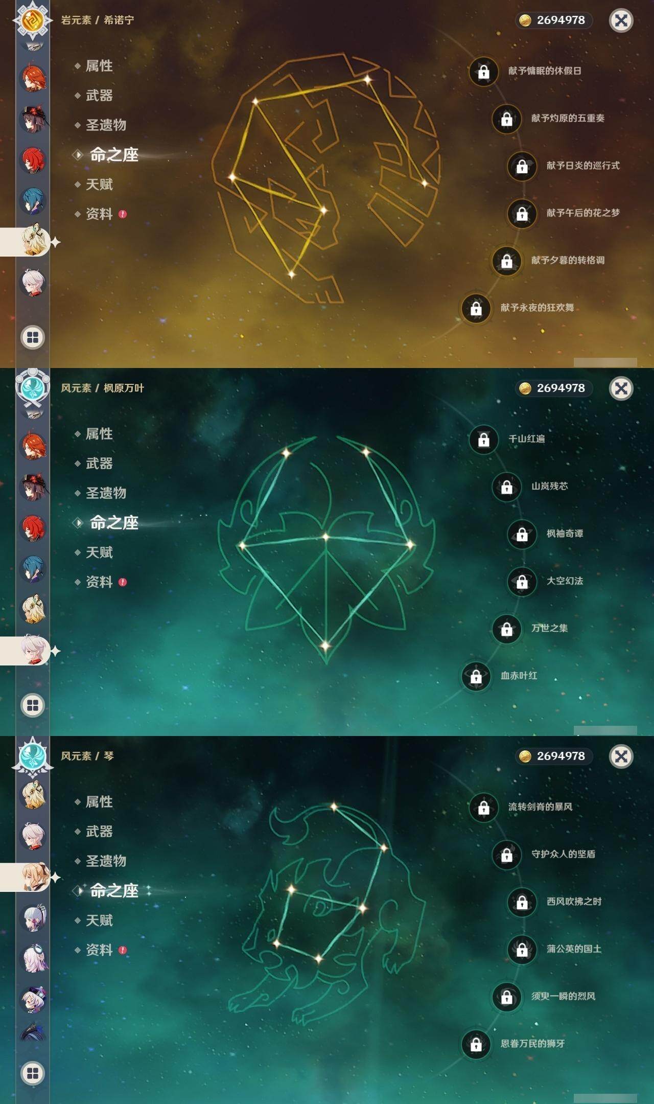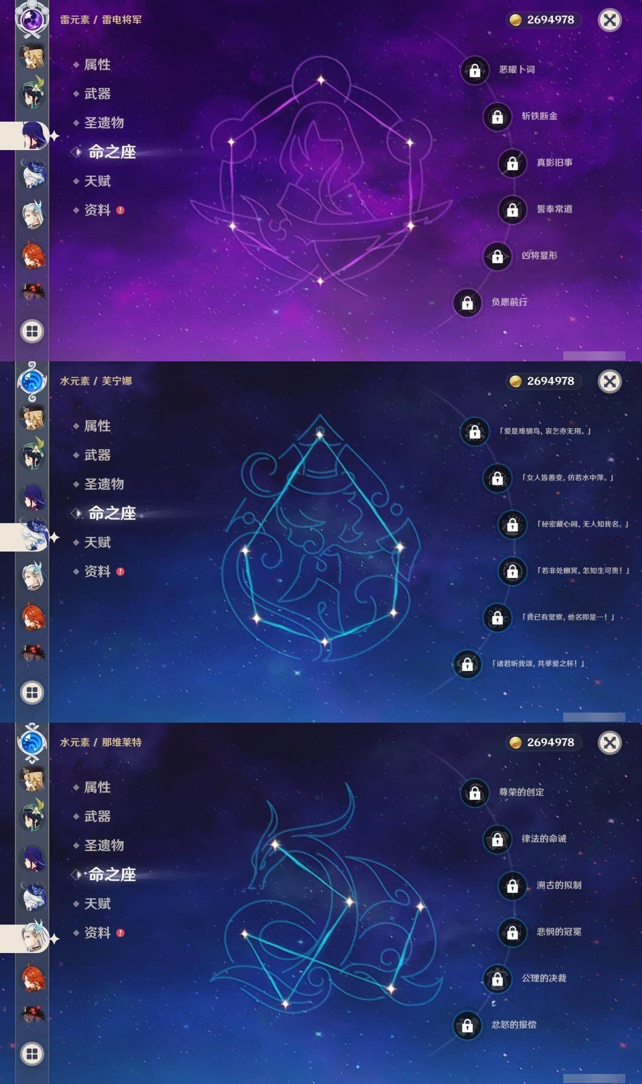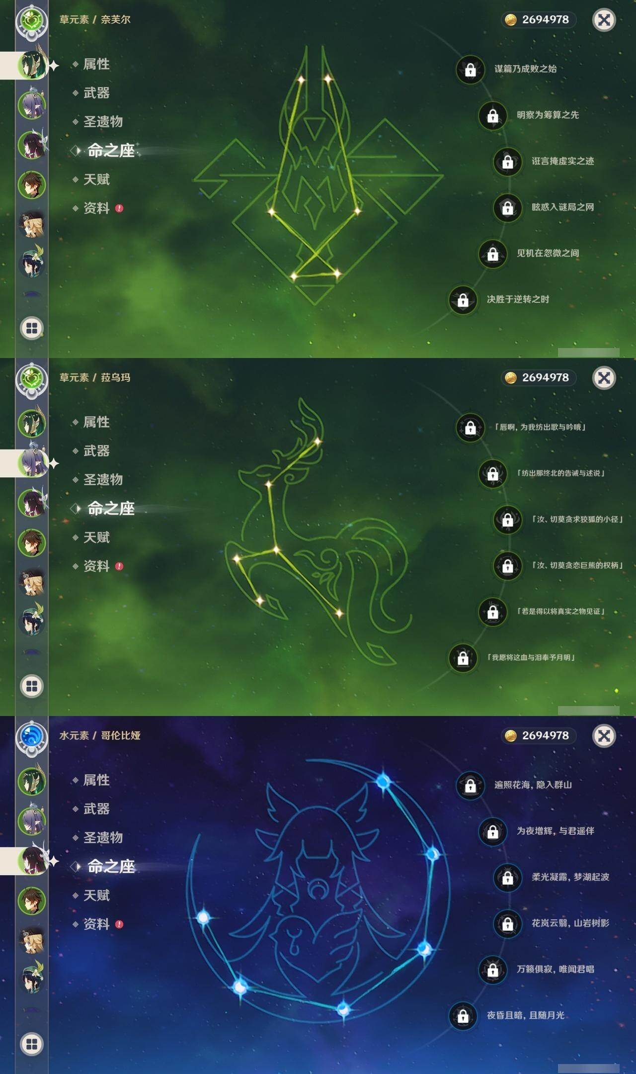 0命克洛琳德,0命阿蕾奇诺,0命娜维娅,0命芙宁娜,0命那维莱特,1命迪希雅,0命纳西妲,2命提纳里,0命夜兰,0命雷电将军,0命枫原万叶,1命神里绫华,0命钟离,1命胡桃,0命温迪,0命刻晴,4命七七,0命琴,1命迪卢克,0命基尼奇,0命希诺宁,0命玛薇卡,0命茜特菈莉,0命菈乌玛,0命奈芙尔,0命哥伦比娅,精1裁断,精1金流监督,精1裁叶萃光,精1天空之脊,精1天空之刃,精1风鹰剑,精1狼的末路,精1岩峰巡歌