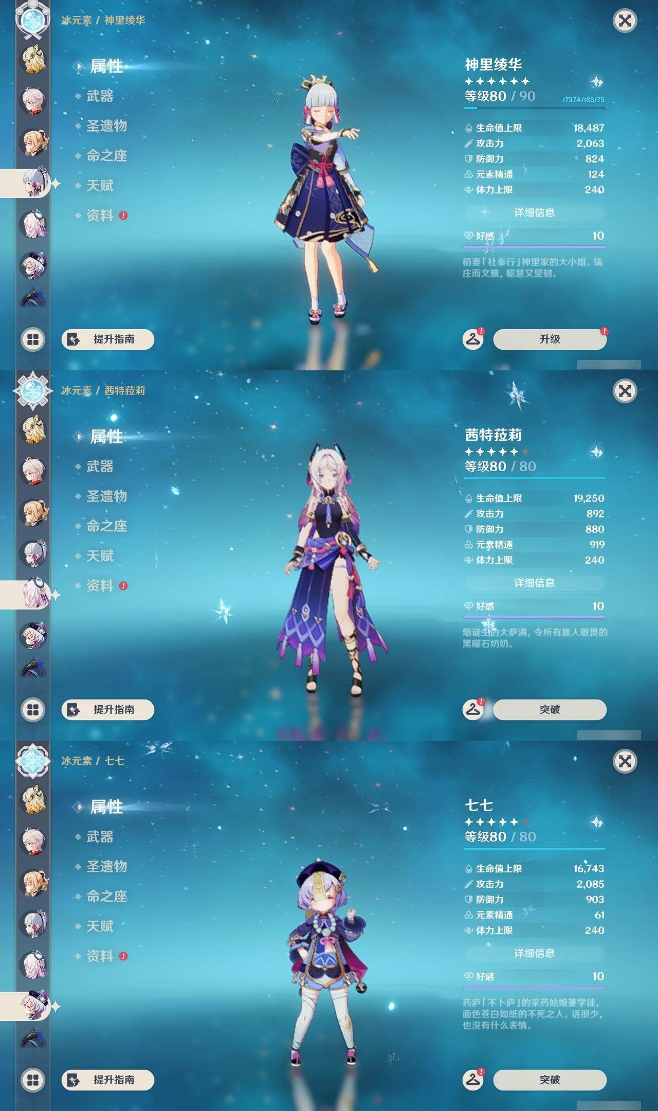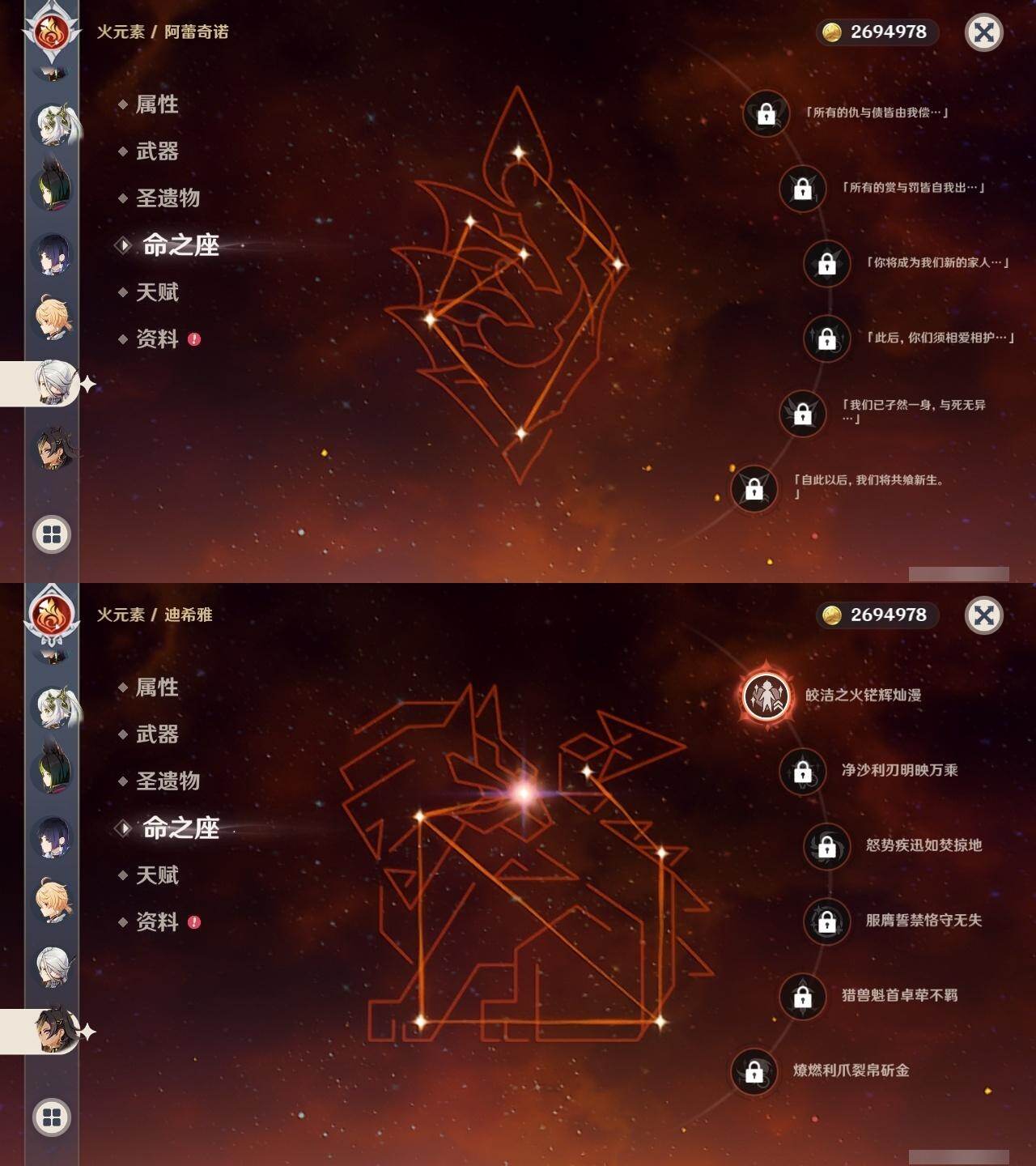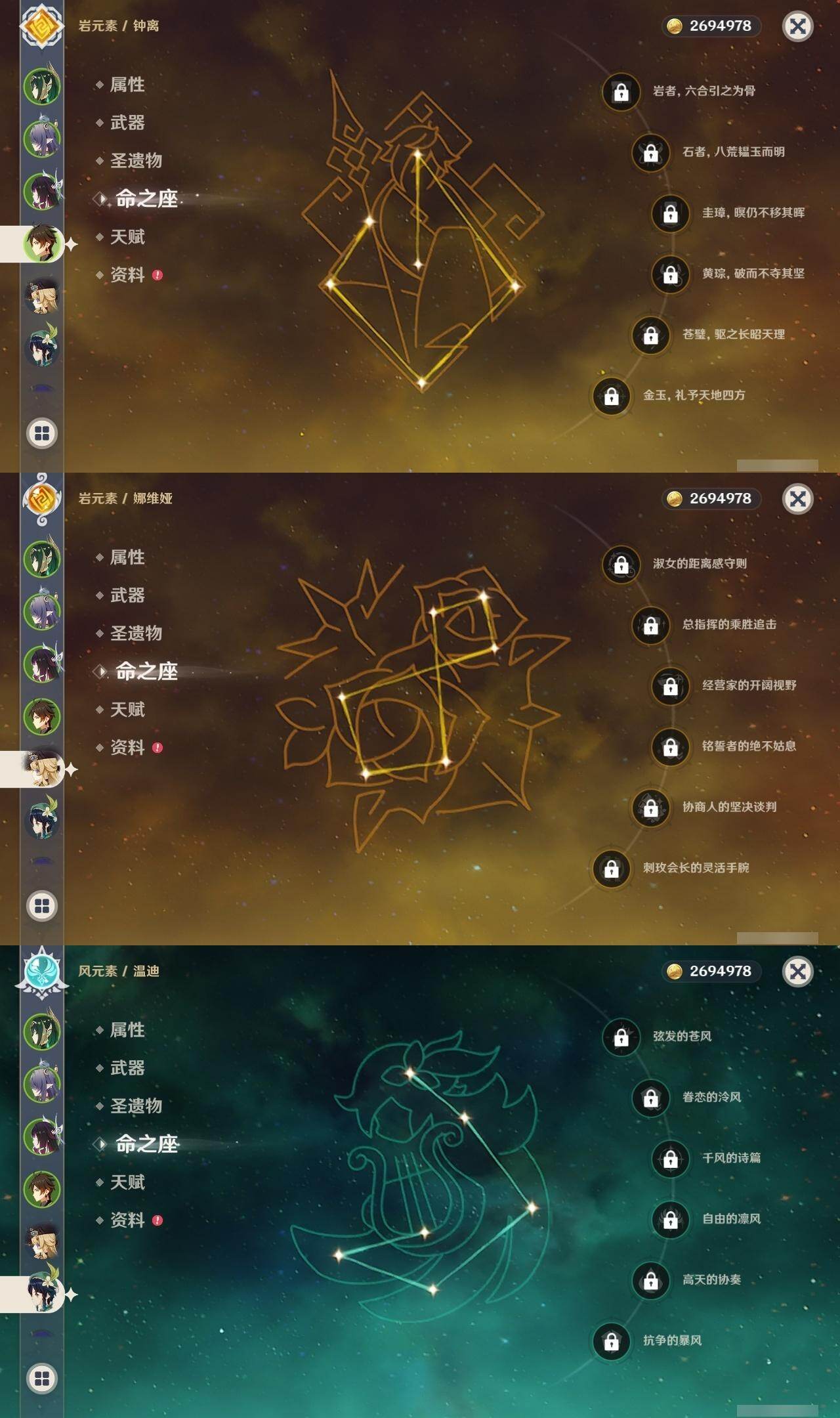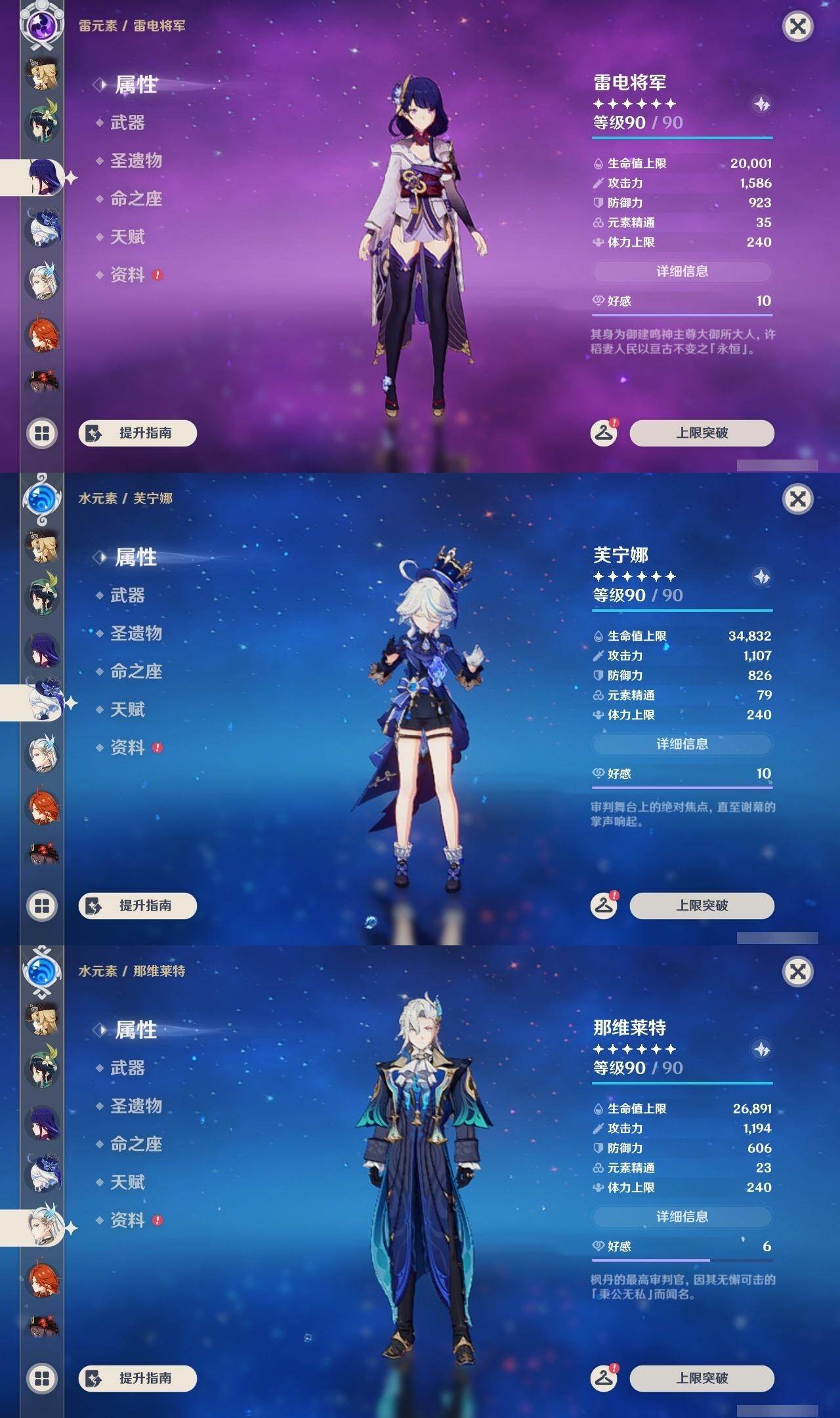 0命克洛琳德,0命阿蕾奇诺,0命娜维娅,0命芙宁娜,0命那维莱特,1命迪希雅,0命纳西妲,2命提纳里,0命夜兰,0命雷电将军,0命枫原万叶,1命神里绫华,0命钟离,1命胡桃,0命温迪,0命刻晴,4命七七,0命琴,1命迪卢克,0命基尼奇,0命希诺宁,0命玛薇卡,0命茜特菈莉,0命菈乌玛,0命奈芙尔,0命哥伦比娅,精1裁断,精1金流监督,精1裁叶萃光,精1天空之脊,精1天空之刃,精1风鹰剑,精1狼的末路,精1岩峰巡歌