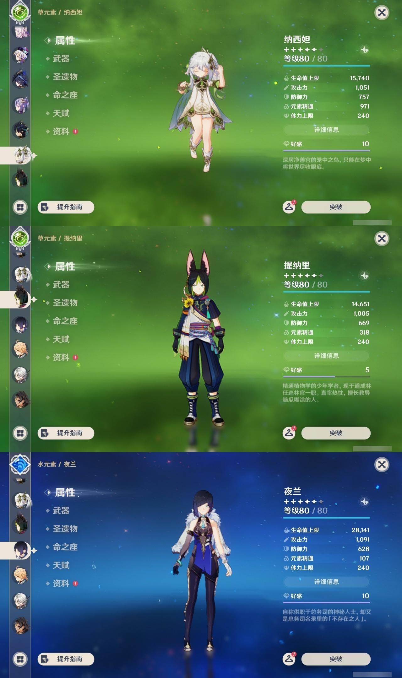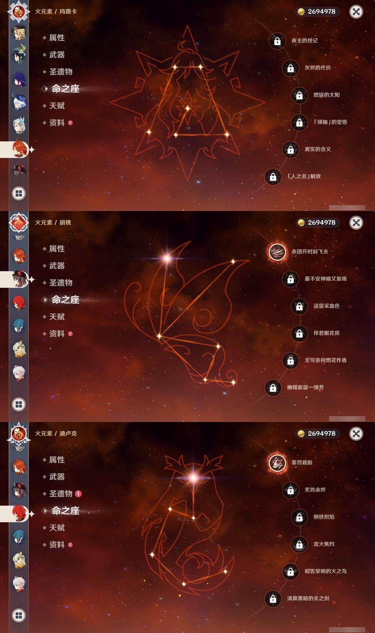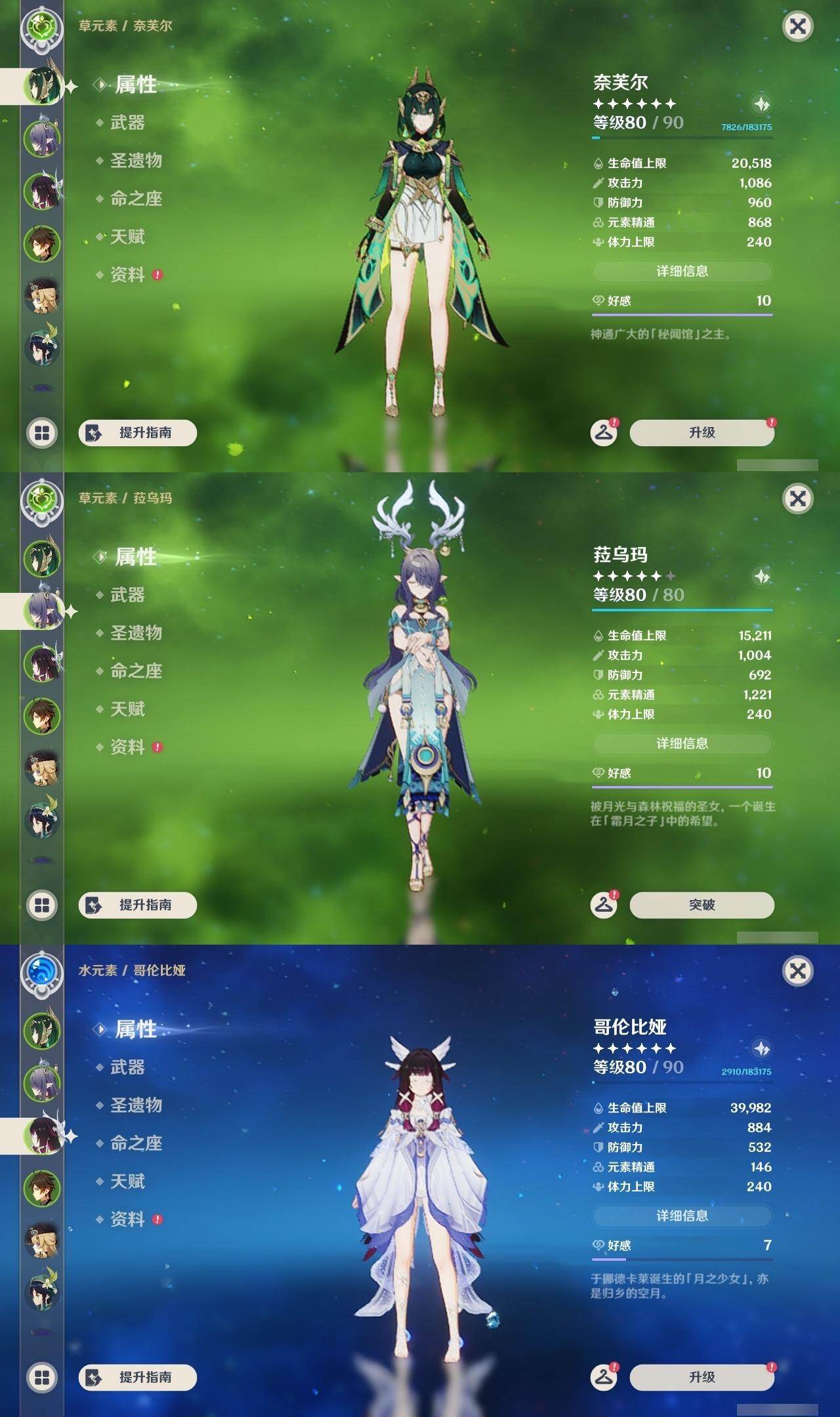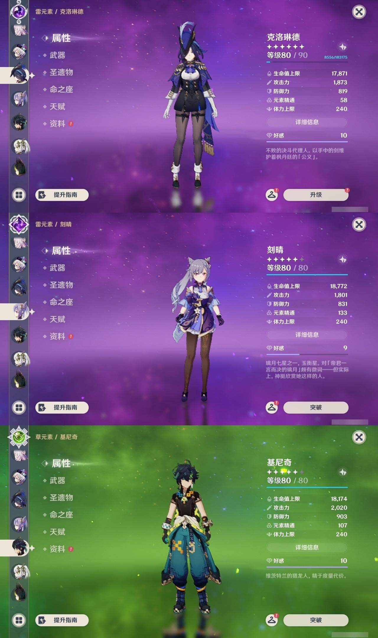 0命克洛琳德,0命阿蕾奇诺,0命娜维娅,0命芙宁娜,0命那维莱特,1命迪希雅,0命纳西妲,2命提纳里,0命夜兰,0命雷电将军,0命枫原万叶,1命神里绫华,0命钟离,1命胡桃,0命温迪,0命刻晴,4命七七,0命琴,1命迪卢克,0命基尼奇,0命希诺宁,0命玛薇卡,0命茜特菈莉,0命菈乌玛,0命奈芙尔,0命哥伦比娅,精1裁断,精1金流监督,精1裁叶萃光,精1天空之脊,精1天空之刃,精1风鹰剑,精1狼的末路,精1岩峰巡歌