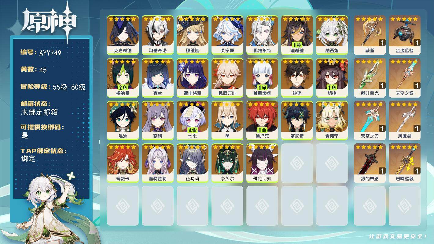 [17717315]60级/45黄/男主/26个五星角色/9个五星武器 0命克洛琳德,0命阿蕾奇诺,0命娜维娅,0命芙宁娜,0命那维莱特,1命迪希雅,0命纳西妲,2命提纳里,0命夜兰,0命雷电将军,0命枫原万叶,1命神里绫华,0命钟离,1命胡桃,0命温迪,0命刻晴,4命七七,0命琴,1命迪卢克,0命基尼奇,0命希诺宁,0命玛薇卡,0命茜特菈莉,0命菈乌玛,0命奈芙尔,0命哥伦比娅,精1裁断,精1金流监督,精1裁叶萃光,精1天空之脊,精1天空之刃,精1风鹰剑,精1狼的末路,精1岩峰巡歌