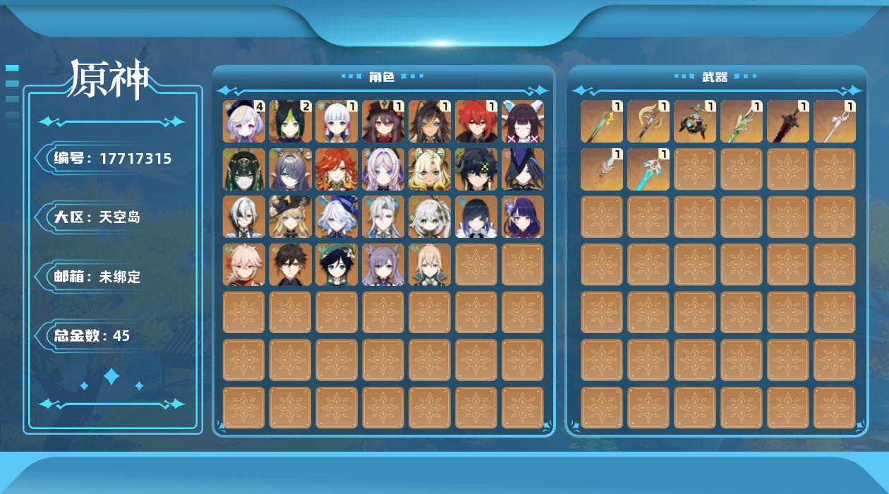 [17717315]60级/45黄/男主/26个五星角色/9个五星武器