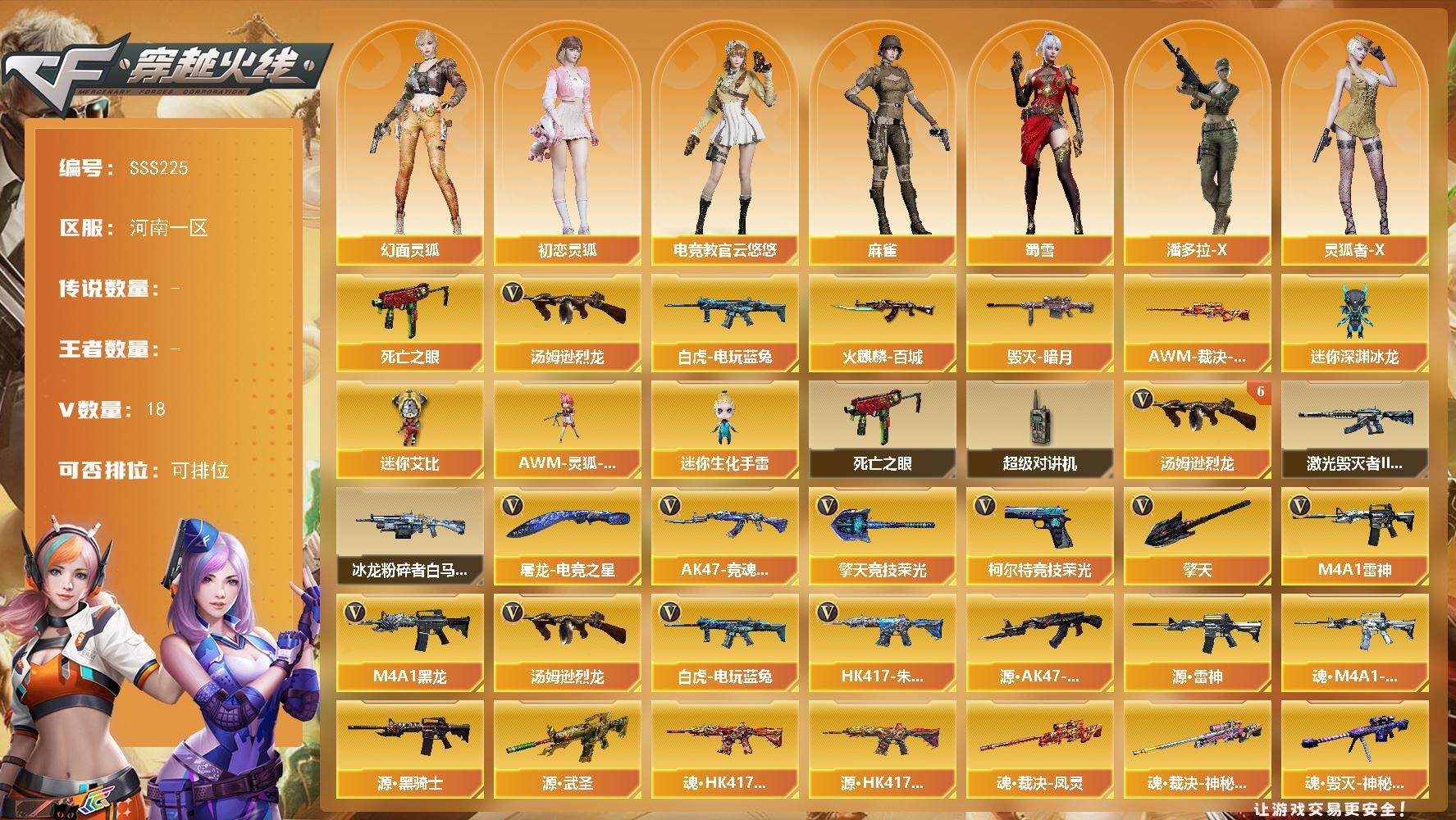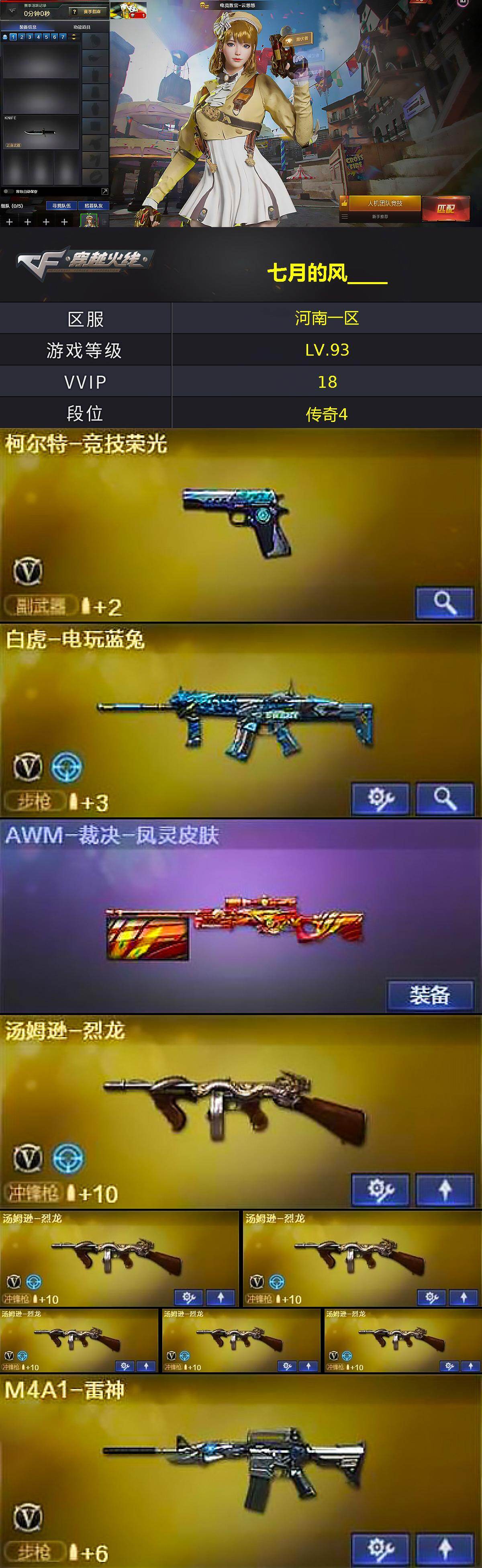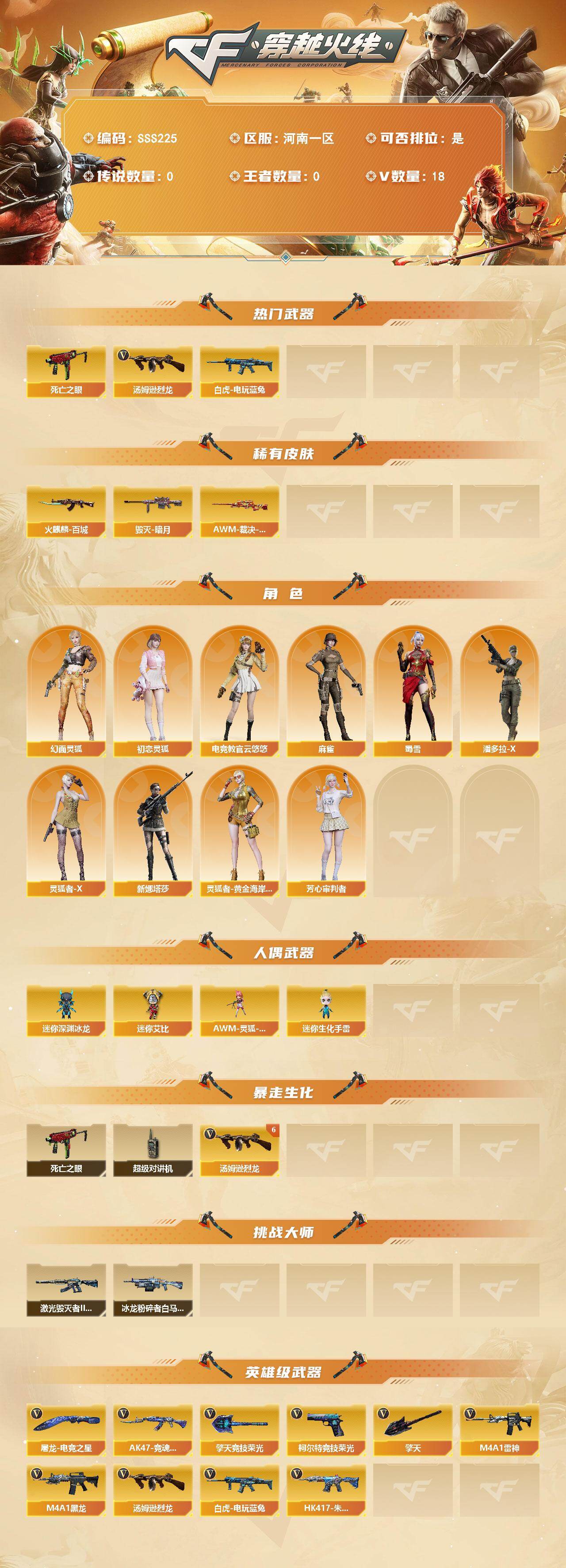 [17717605]河南一区-20V-0王者武器数-0炫金武器数 【热门武器】:死亡之眼,白虎-电玩蓝兔,汤姆逊-烈龙*6 【皮肤】:AWM-裁决-凤灵皮肤,火麒麟-百城,毁灭-暗月 【角色】:电竞教官-云悠悠,幻面灵狐,初恋灵狐,芳心审判者,灵狐者-X,灵狐者-黄金海岸,麻雀,潘多拉-X,蜀雪,新娜塔莎 【人偶武器】:AWM-灵狐-15周年嘉年华,迷你深渊冰龙,迷你生化手雷*2,迷你艾比 【暴走生化】:死亡之眼,超级对讲机 【挑战大师】:冰龙粉碎者-白马银枪*2,激光毁灭者III-白马银枪 【英雄级武器】:M4A1-黑龙,M4A1-雷神,白虎-电玩蓝兔,HK417-朱雀-电竞之星,汤姆逊-烈龙*6,柯尔特-竞技荣光,擎天,擎天-竞技荣光,屠龙-电竞之星,AK47-竞魂无影 【源级武器】:源·雷神,魂·M4A1-雷神-化蛇,源·黑骑士,源·AK47-黑武士*2,源·武圣,魂·HK417-朱雀-凤灵,源·HK417-朱雀,魂·裁决-凤灵,魂·裁决-神秘按键,魂·毁灭-神秘黑洞,源·Barrett-朱雀,魂·炼狱-月,魂·天神-宇航兔兔,源·武圣glock,魂·擎天-蒸汽钟表,源·擎天-萌杀,魂·龙啸-NICE,魂·龙啸-秦师,魂·麒麟刺-神秘黑洞*2 【道具】:冰冰企鹅背包-猛男专用,战舰背包,绿色巨人,灵魂忍者,变异宝贝,迷雾幽灵,夺命之镰,防化服*2,星辰流光-枪王排位,枪王排位28赛季金色流光,电玩兔兔表情,动感闪耀表情,云海游龙表情,防弹头盔*4,防弹衣*4,C4工具钳*4,手雷包*4 【特殊枪械】:6烈龙