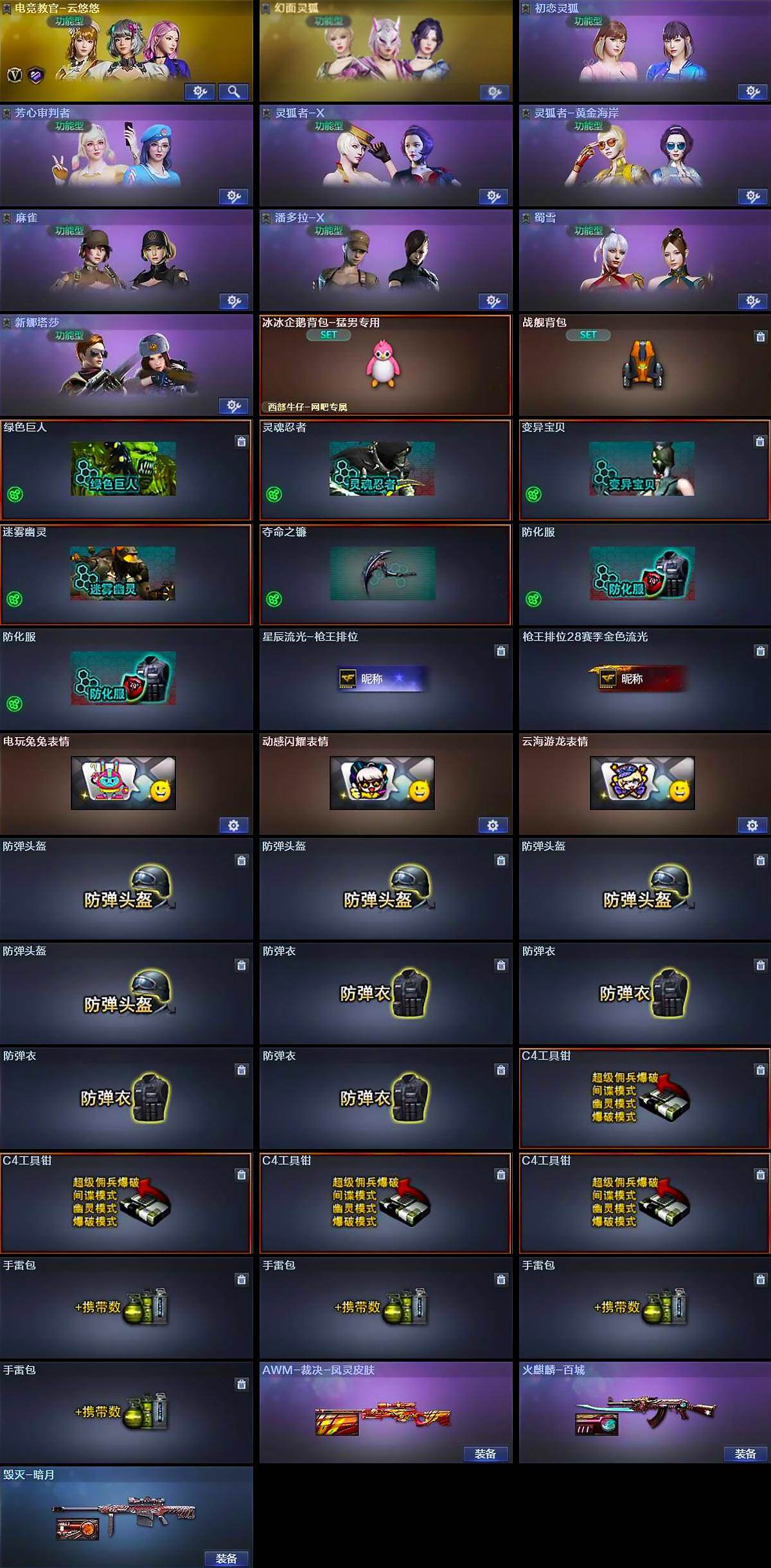 【道具】:冰冰企鹅背包-猛男专用,战舰背包,绿色巨人,灵魂忍者,变异宝贝,迷雾幽灵,夺命之镰,防化服*2,星辰流光-枪王排位,枪王排位28赛季金色流光,电玩兔兔表情,动感闪耀表情,云海游龙表情,防弹头盔*4,防弹衣*4,C4工具钳*4,手雷包*4