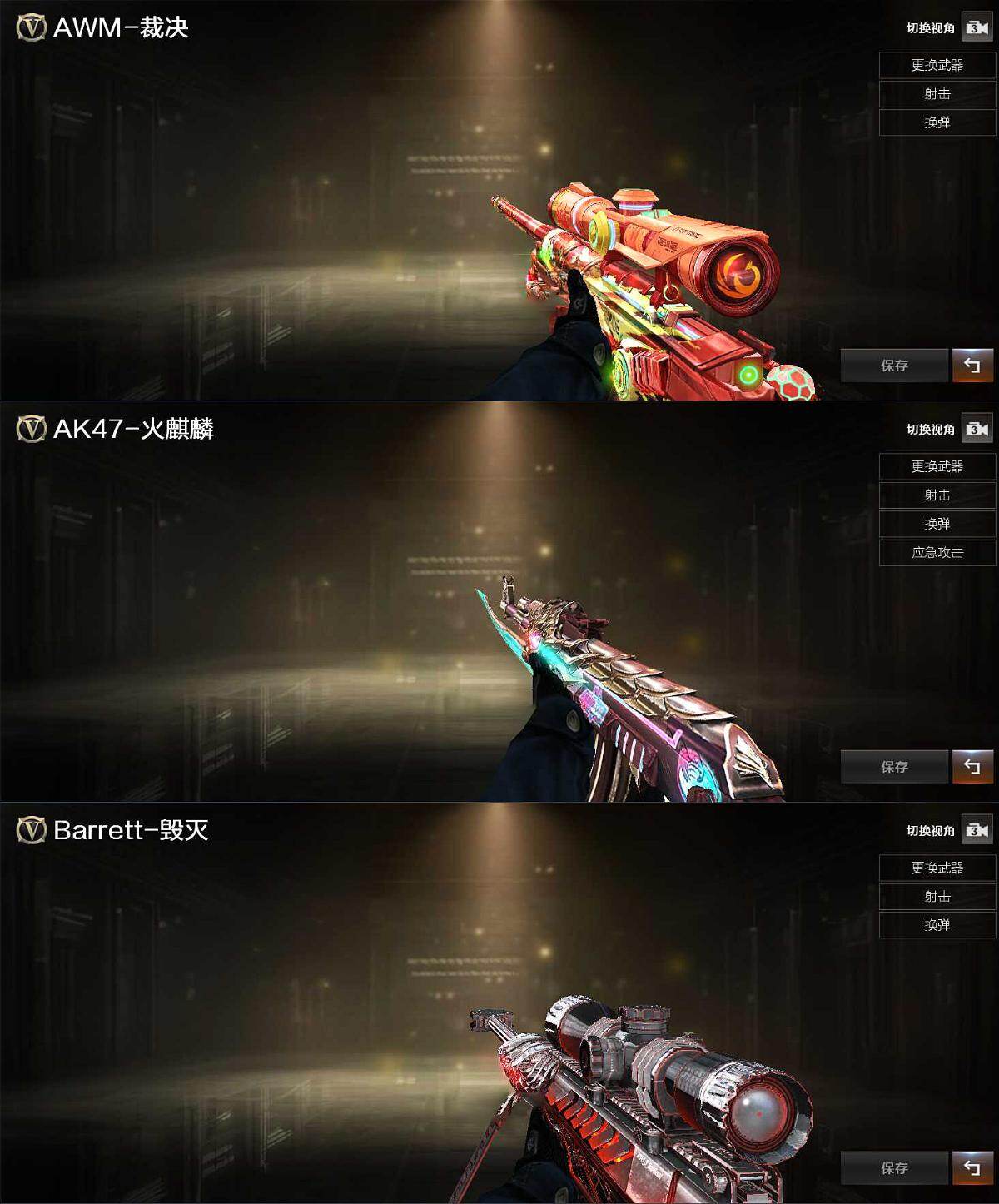 【源级武器】:源·雷神,魂·M4A1-雷神-化蛇,源·黑骑士,源·AK47-黑武士*2,源·武圣,魂·HK417-朱雀-凤灵,源·HK417-朱雀,魂·裁决-凤灵,魂·裁决-神秘按键,魂·毁灭-神秘黑洞,源·Barrett-朱雀,魂·炼狱-月,魂·天神-宇航兔兔,源·武圣glock,魂·擎天-蒸汽钟表,源·擎天-萌杀,魂·龙啸-NICE,魂·龙啸-秦师,魂·麒麟刺-神秘黑洞*2