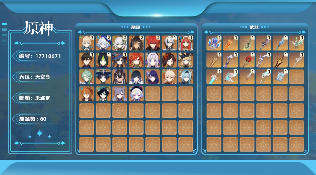 1命阿蕾奇诺,0命千织,0命娜维娅,2命芙宁娜,0命白术,2命迪希雅,0命流浪者,2命纳西妲,1命妮露,0命赛诺,1命提纳里,0命夜兰,0命优菈,0命雷电将军,0命枫原万叶,1命钟离,0命温迪,0命达达利亚,0命刻晴,0命七七,3命琴,1命莫娜,2命迪卢克,0命玛薇卡,0命茜特菈莉,精1赦罪,精1静水流涌之辉,精1苇海信标,精1千夜浮梦,精1圣显之钥,精1若水,精1护摩之杖,精1四风原典,精1天空之脊,精1天空之翼,精1阿莫斯之弓,精1天空之卷,精1风鹰剑,精1天空之傲,精1山王长牙,精1祭星者之望,精1焚曜千阳