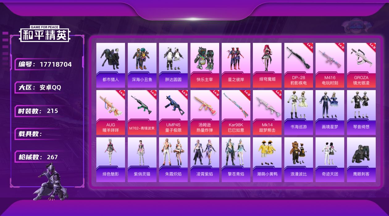 [17718704]安卓 手Q-3粉装-13特效枪-0载具-1粉色飞行器-76771热力值-14王牌印记-215套装-267枪皮 【热门品类】:套装-浪漫天命,套装-都市猎人,套装-深海小丑鱼,套装-胖达圆圆,套装-SS1特训,套装-潮萌小黄鸭,套装-暗影哥特,套装-浪漫波比,熔岩游骑兵连帽夹克 【粉色套装】:粉装-快乐主宰,粉装-星之彼岸,角色-绯穹魔姬 【粉色枪皮等级】:M416-电玩时刻(五级),GROZA-镜光银凌(五级),AUG-暖羊咩咩(五级),M762-青锋波束(五级),ACE32-萌骑漫游(三级),UMP45-量子极限(五级),汤姆逊-热量炸弹(五级),AKS-74U-森灵之息(四级),Kar98K-巳巳如意(五级),Mk14-甜梦熊击(五级),Mk14-福马献瑞(一级),DP-28-豹影疾电(五级),PKM-萌骑夺宝(五级) 【粉色枪皮】:M416-电玩时刻,GROZA-镜光银凌,AUG-暖羊咩咩,M762-青锋波束,ACE32-萌骑漫游,UMP45-量子极限,汤姆逊-热量炸弹,AKS-74U-森灵之息,Kar98K-巳巳如意,Mk14-甜梦熊击,Mk14-福马献瑞,DP-28-豹影疾电,PKM-萌骑夺宝 【粉色飞行器】:炫彩糖果飞行器 【粉色降落伞】:深海曼妙降落伞,幻影战神降落伞,甜心宝贝降落伞,春暖花开降落伞,华贵君王降落伞,星之信仰降落伞,金风玉露降落伞,神秘黑猫降落伞,星之彼岸降落伞,守护天翼降落伞,忍者神龟降落伞,樱桃泡泡降落伞,幻彩电音降落伞,荧海星豚降落伞,绯穹魔姬降落伞,喜羊羊与灰太狼降落伞,异瞳寒姬降落伞,炫彩糖果降落伞 【稀有套装】:玩偶服-憨乐熊二,套装-巳巳如意,套装-云鹰凌岚,套装-雪国风尚,套装-炫彩糖果,套装-马上有钱,套装-雏菊兔兔,套装-萝兰蝴蝶,套装-糖糖葫芦,套装-青团波波,角色-怀庆长公主,套装-燕燕于飞,套装-鱼渊荷华,套装-紫幽梦,套装-蓝冰羽,套装-星渊小夜曲,套装-彩虹兔,套装-云朵鹅,套装-雪绒豹,角色-灵公主,角色-夜瞳黯灵,套装-朱霞炽焰,套装-凌霄紫焰,套装-擎苍青焰,角色-绯色魅影,角色-紫俏灵猫,套装-书海巡游,套装-画境星梦,套装-琴音绮想 【稀有枪皮】:AKM-影袭,AKM-星之彼岸,AKM-灼热熔岩,AKM-生命誓言,AKM-破晓战魂,AKM-霓虹街区,AKM-龙的传人,M16A4-生命誓言,M16