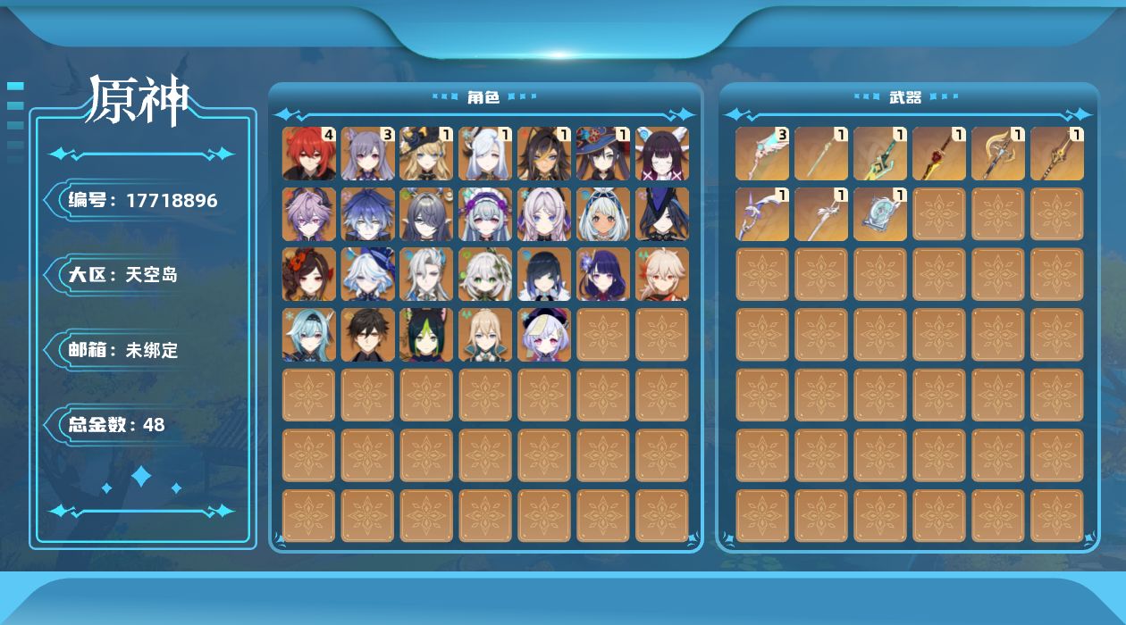 0命克洛琳德,0命千织,1命娜维娅,0命芙宁娜,0命那维莱特,1命迪希雅,0命纳西妲,0命提纳里,0命夜兰,1命申鹤,0命优菈,0命雷电将军,0命枫原万叶,0命钟离,3命刻晴,0命七七,0命琴,1命莫娜,4命迪卢克,0命玛拉妮,0命茜特菈莉,0命梦见月瑞希,0命菈乌玛,0命菲林斯,0命杜林,0命哥伦比娅,精1有乐御簾切,精1裁断,精1赤沙之杖,精1四风原典,精3天空之翼,精1阿莫斯之弓,精1风鹰剑,精1山王长牙,精1朏魄含光