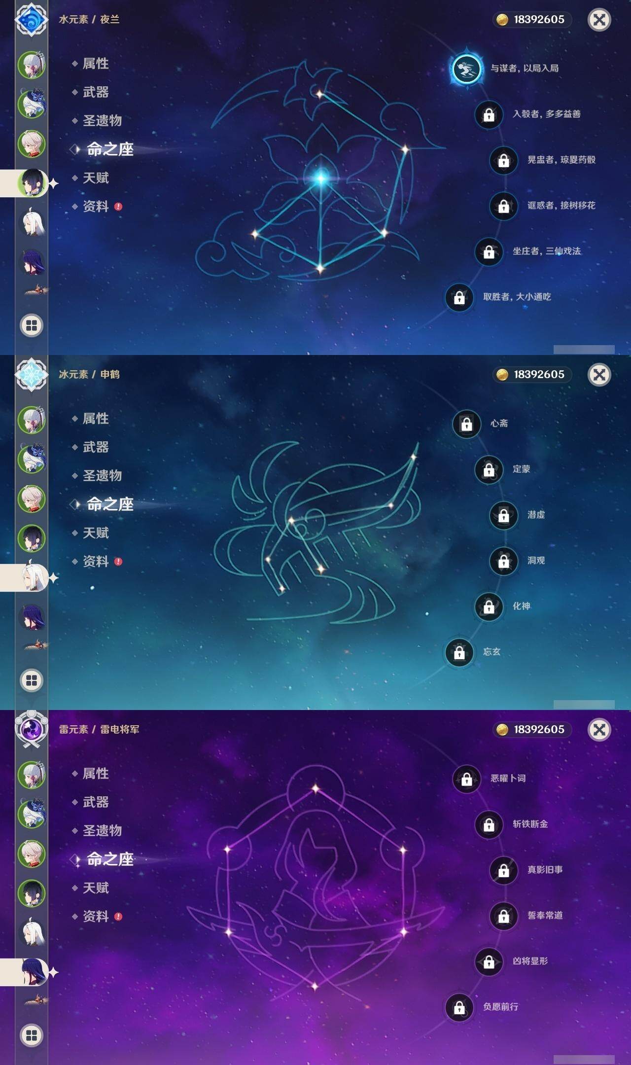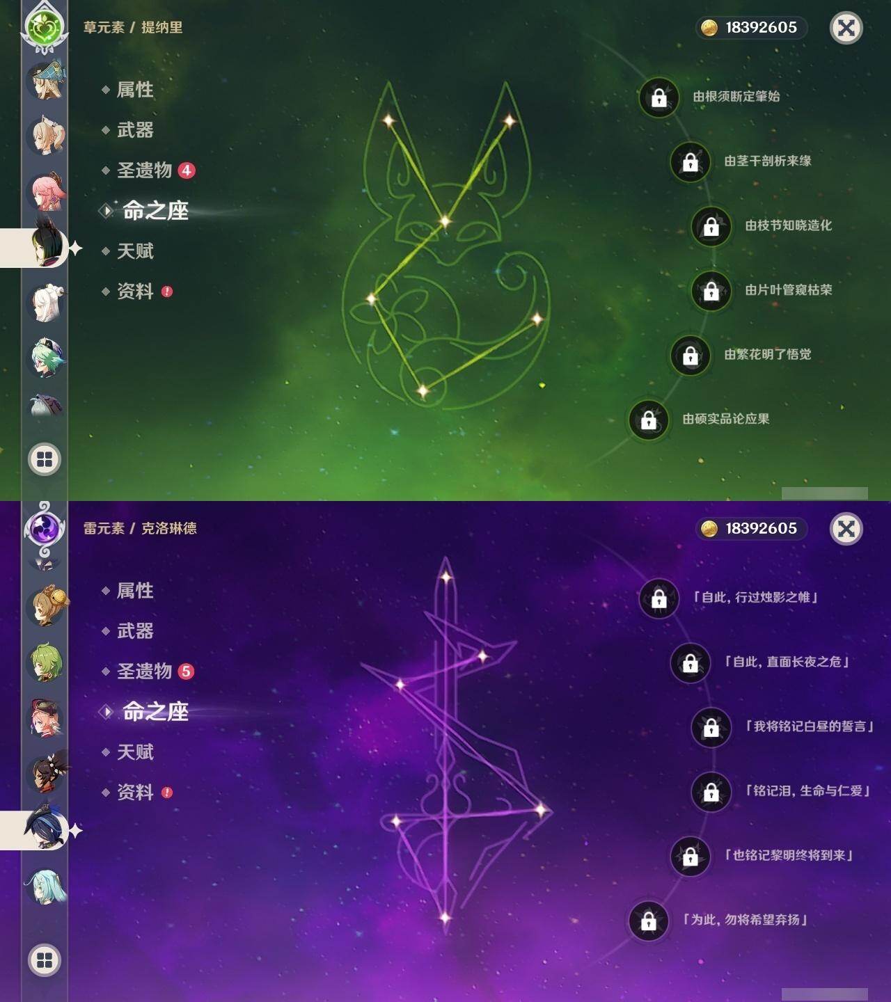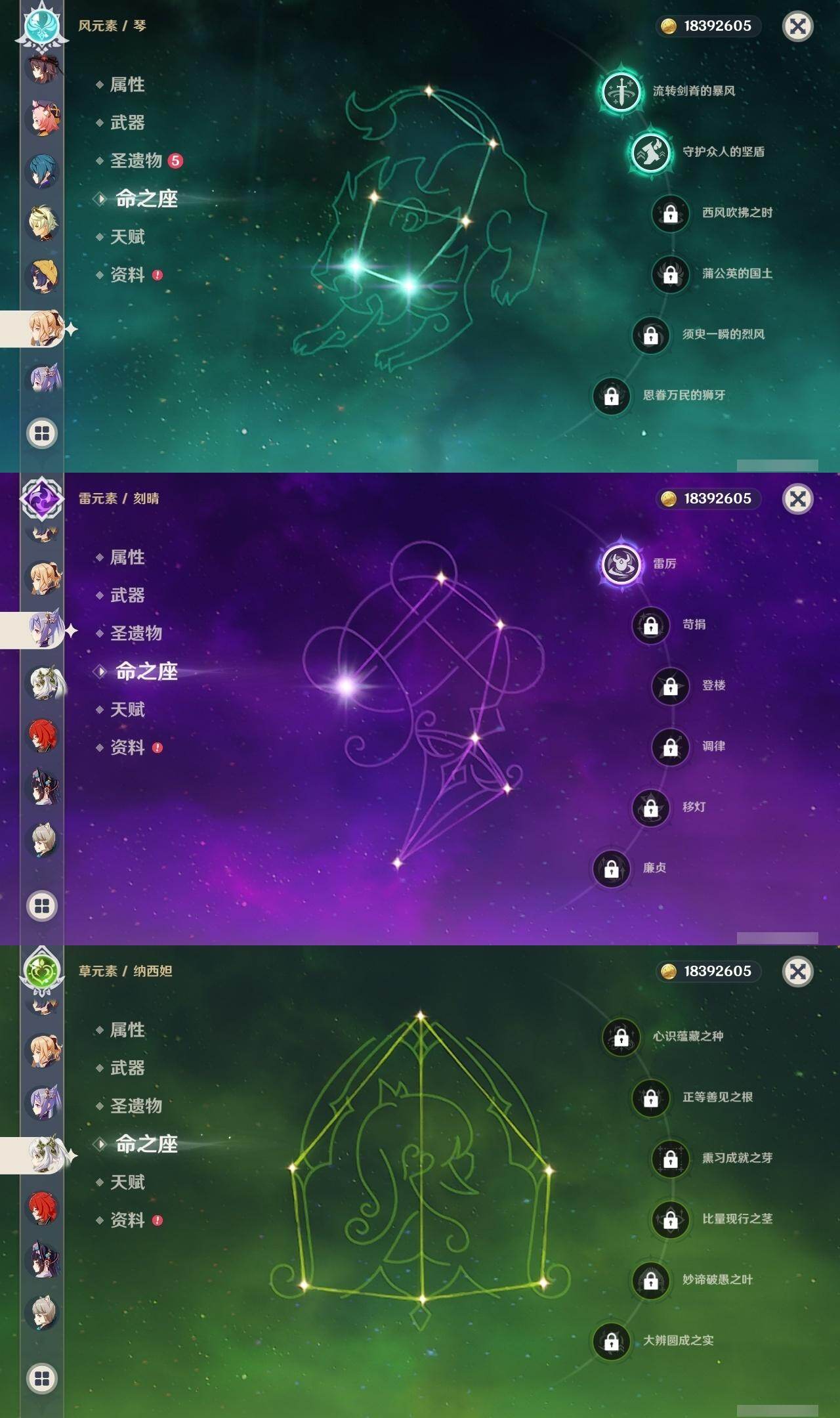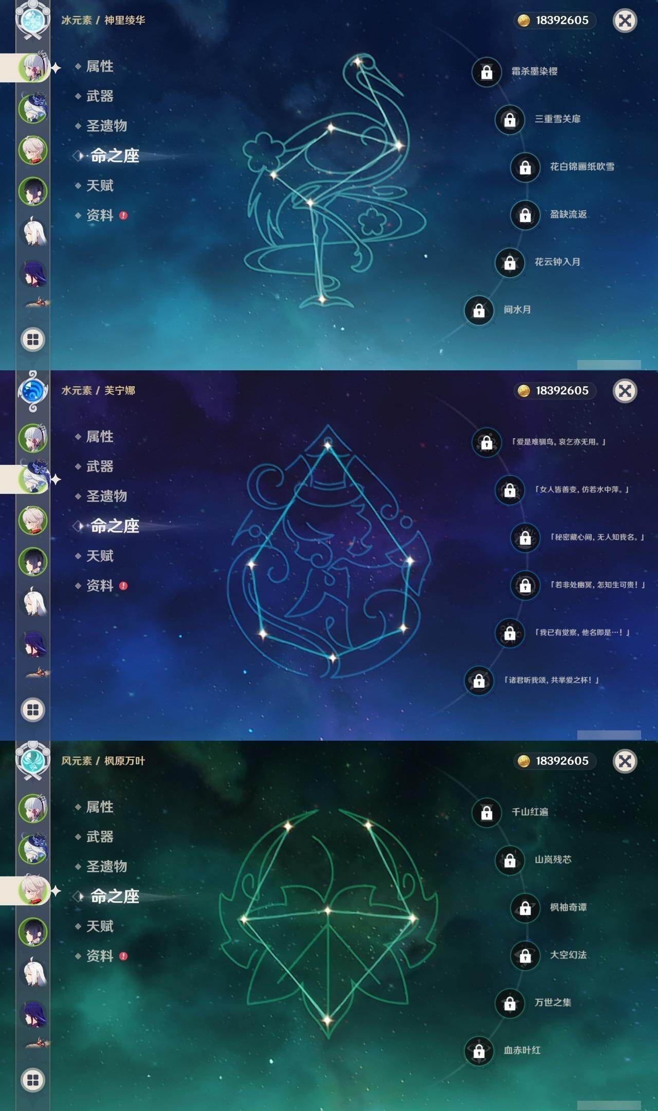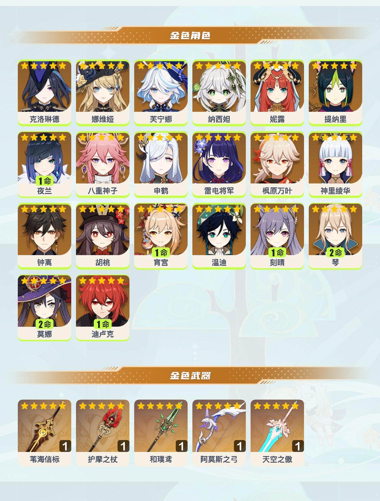 0命克洛琳德,0命娜维娅,0命芙宁娜,0命纳西妲,0命妮露,0命提纳里,1命夜兰,0命八重神子,0命申鹤,0命雷电将军,0命枫原万叶,0命神里绫华,0命钟离,0命胡桃,1命宵宫,0命温迪,1命刻晴,2命琴,2命莫娜,1命迪卢克,精1苇海信标,精1护摩之杖,精1和璞鸢,精1阿莫斯之弓,精1天空之傲