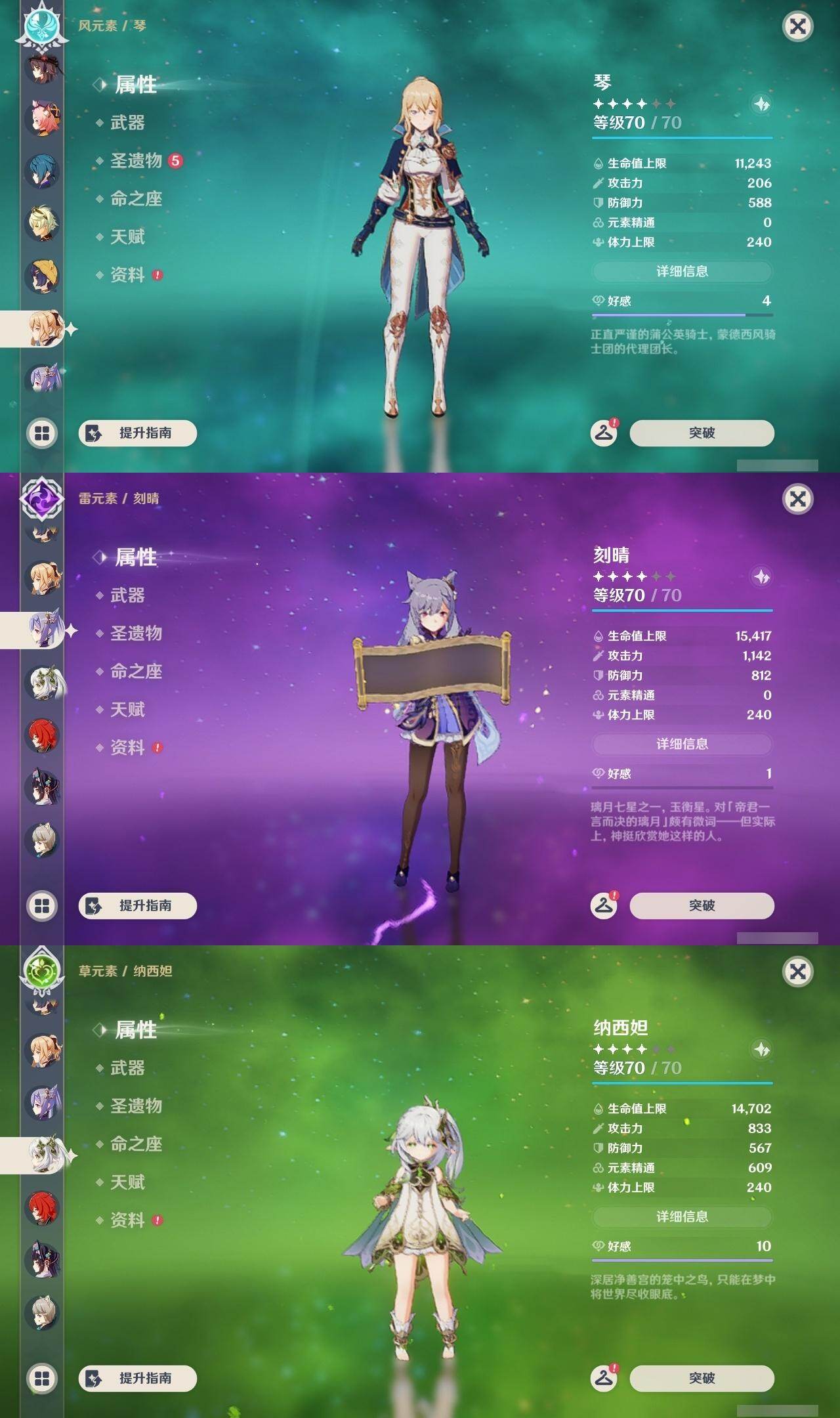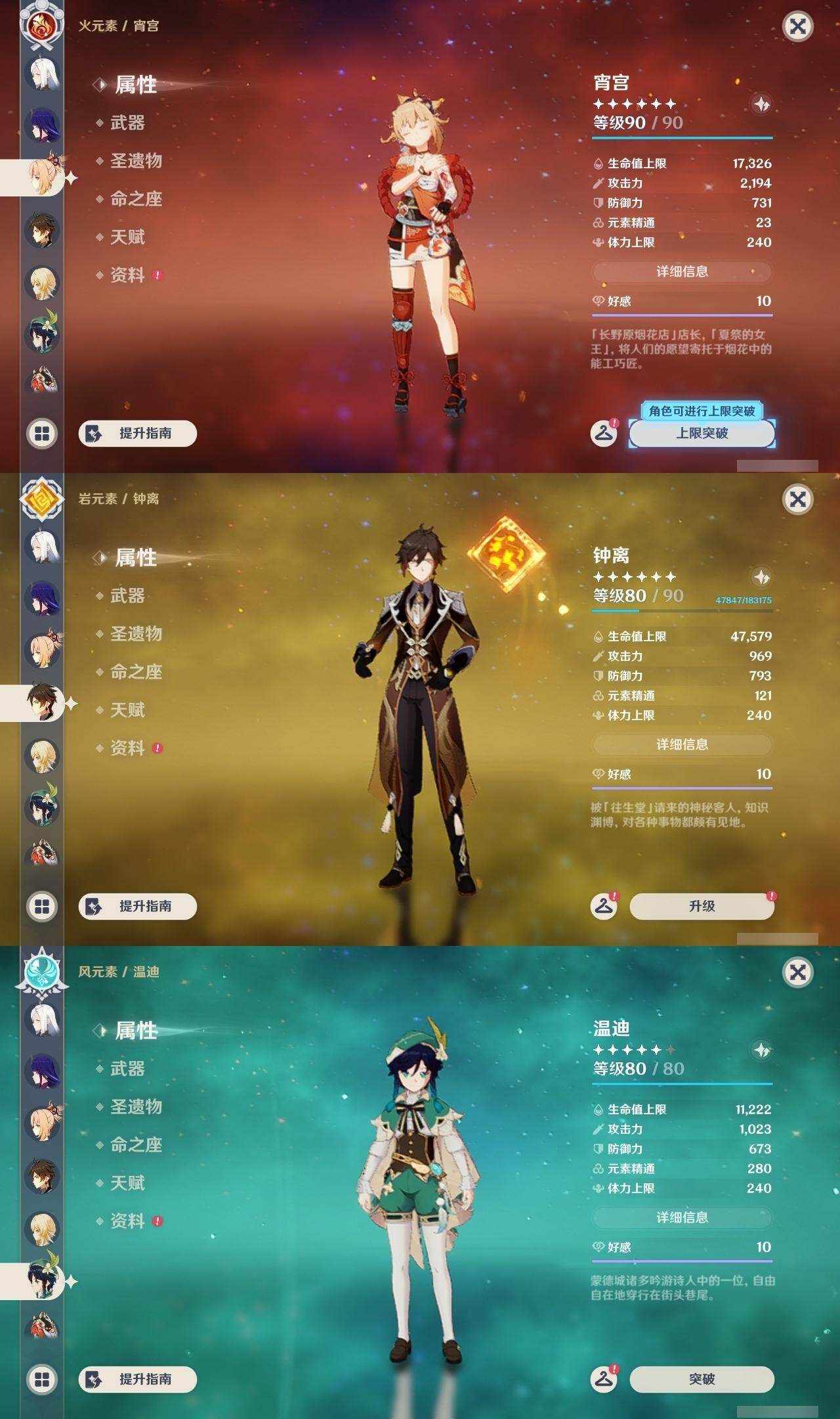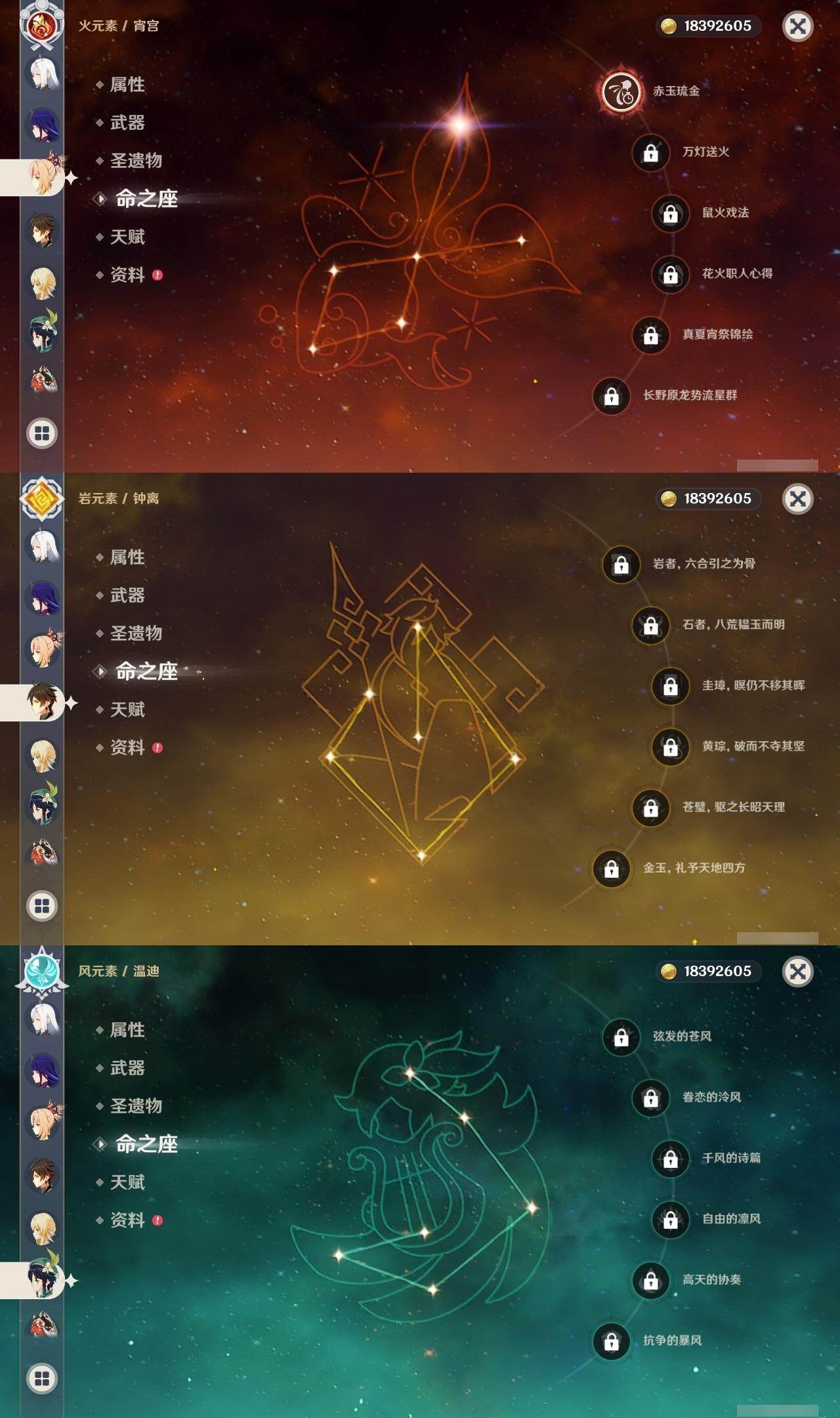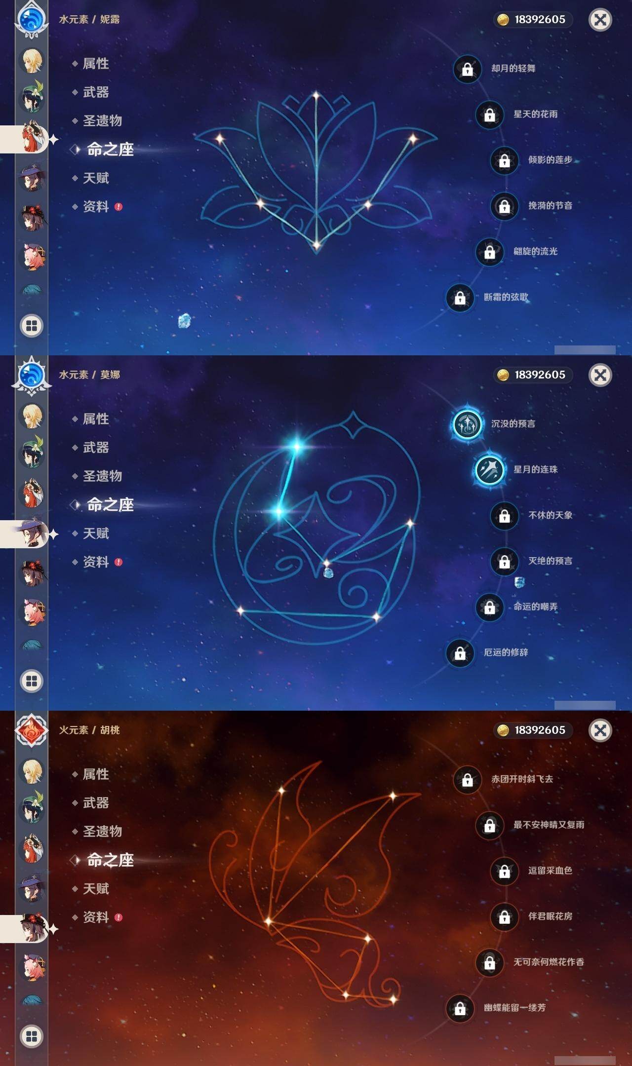0命克洛琳德,0命娜维娅,0命芙宁娜,0命纳西妲,0命妮露,0命提纳里,1命夜兰,0命八重神子,0命申鹤,0命雷电将军,0命枫原万叶,0命神里绫华,0命钟离,0命胡桃,1命宵宫,0命温迪,1命刻晴,2命琴,2命莫娜,1命迪卢克,精1苇海信标,精1护摩之杖,精1和璞鸢,精1阿莫斯之弓,精1天空之傲
