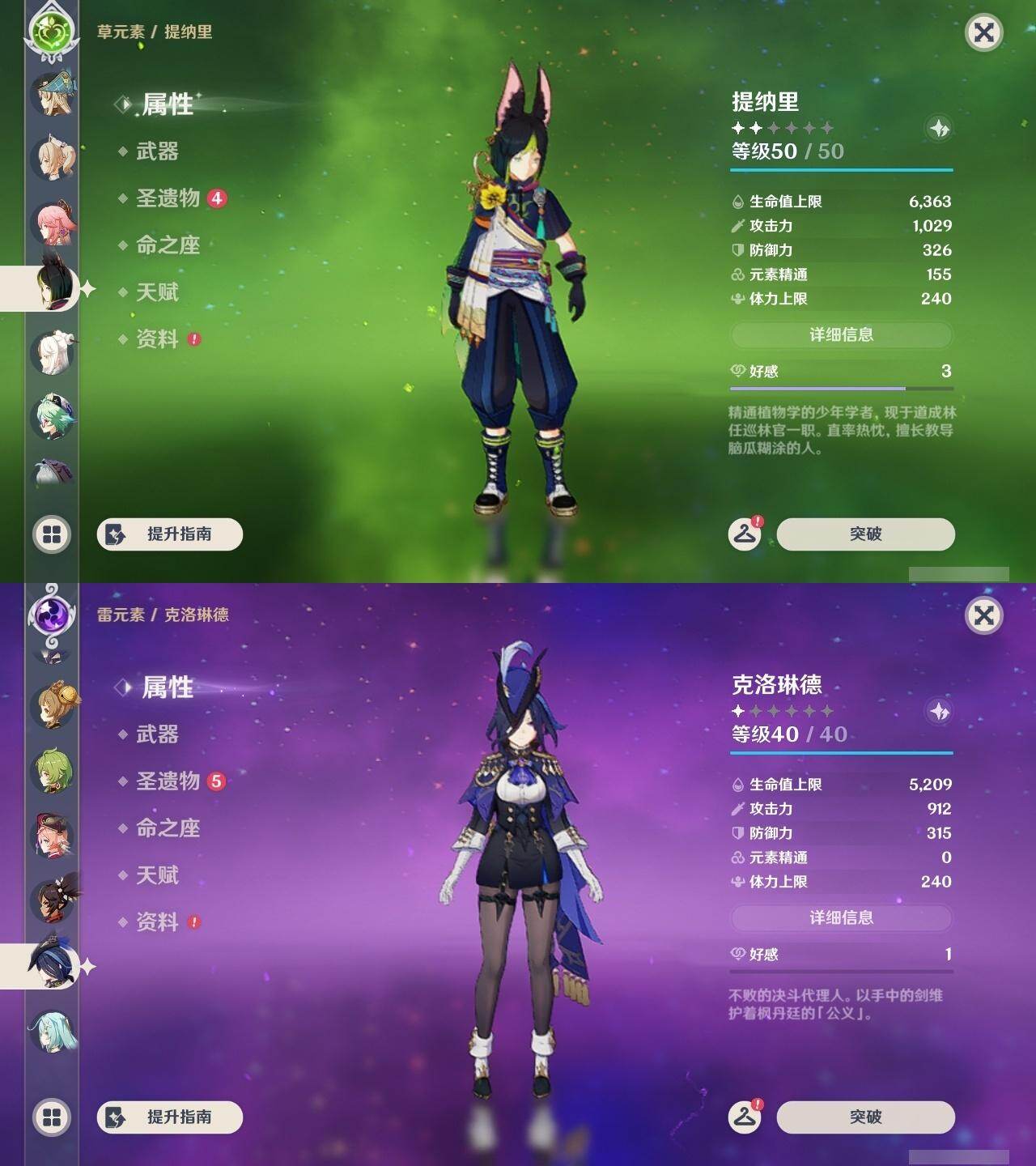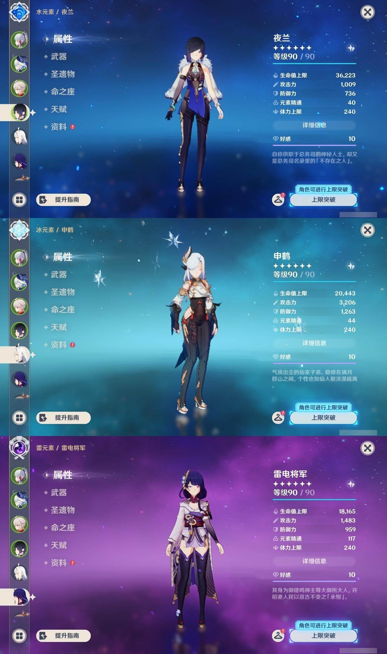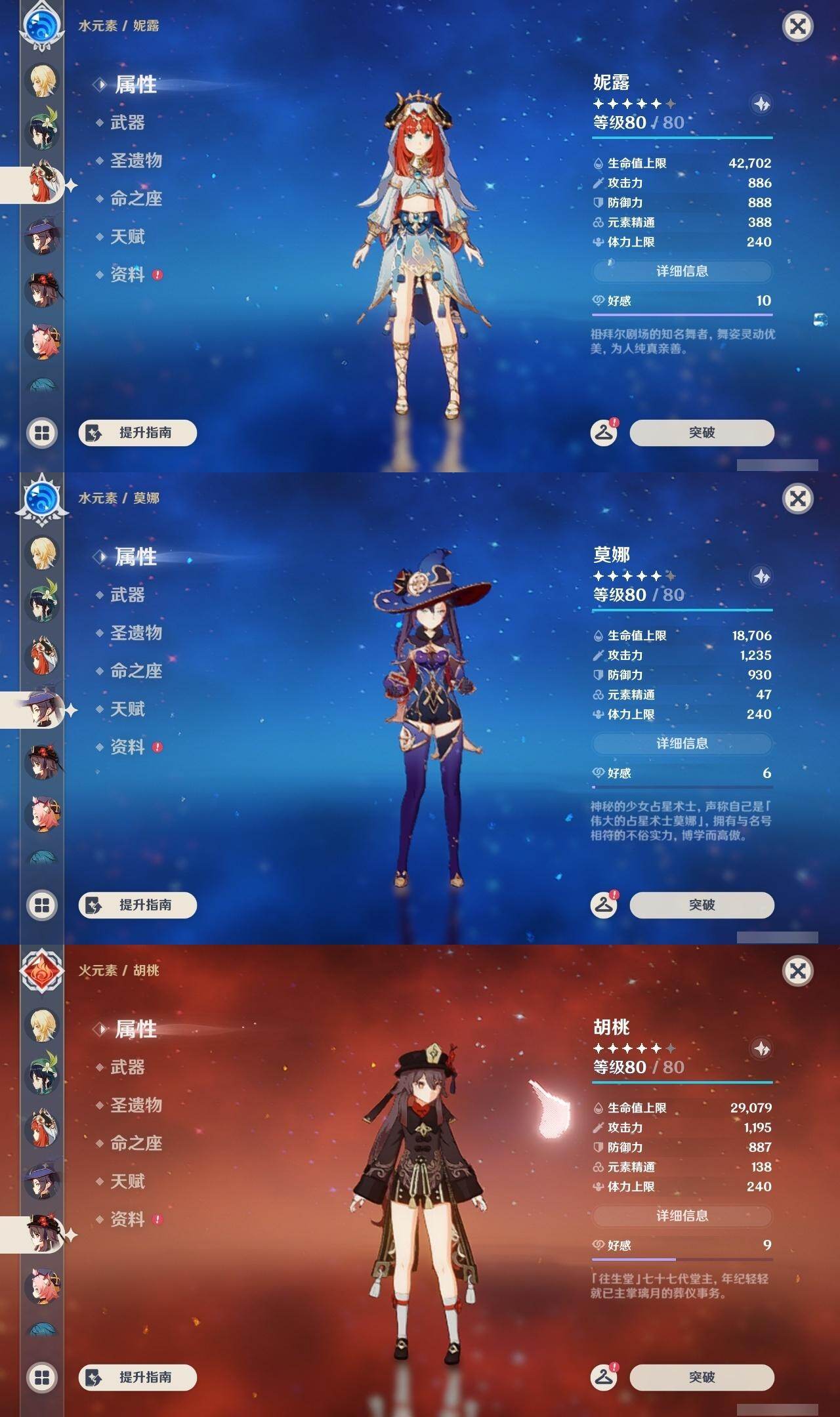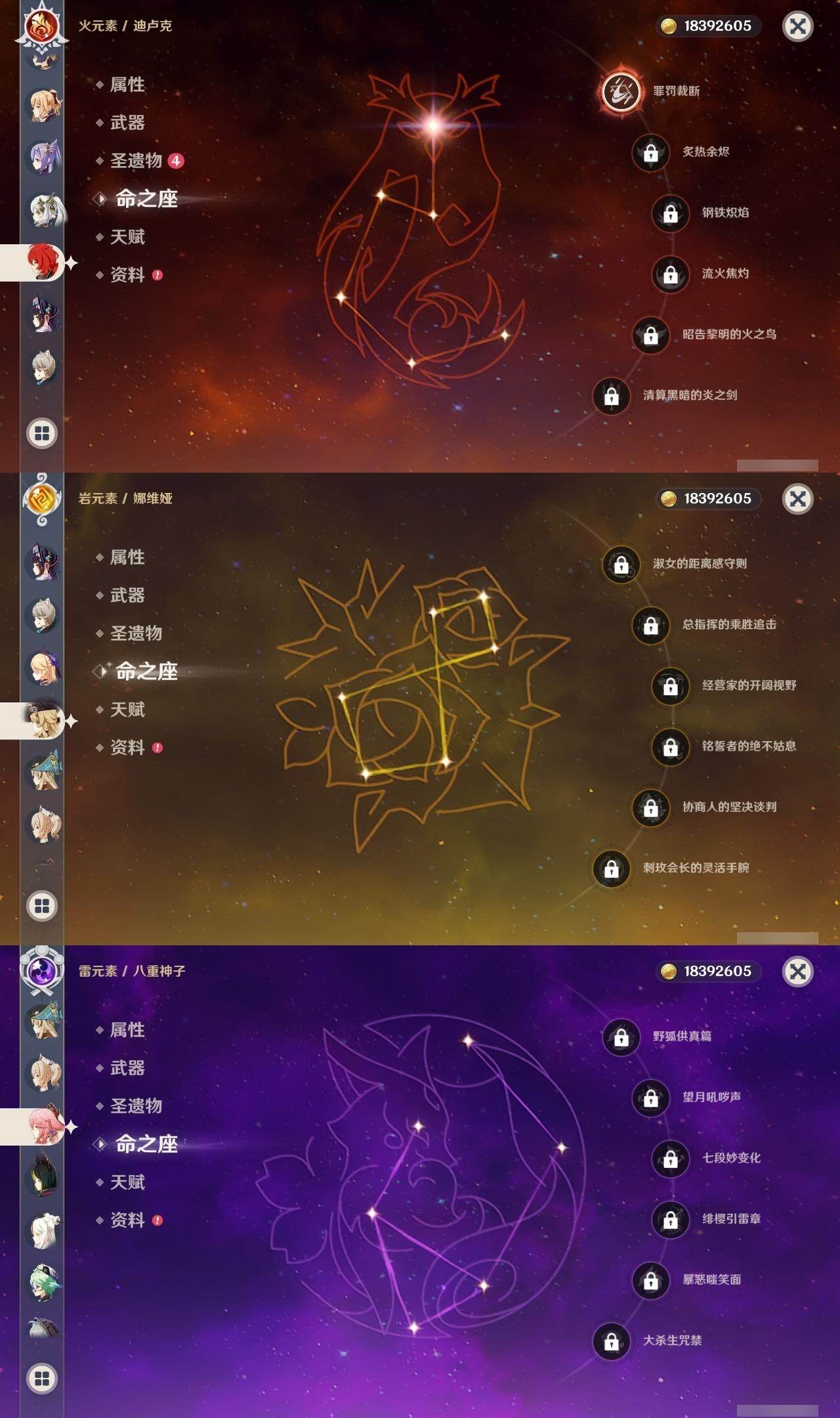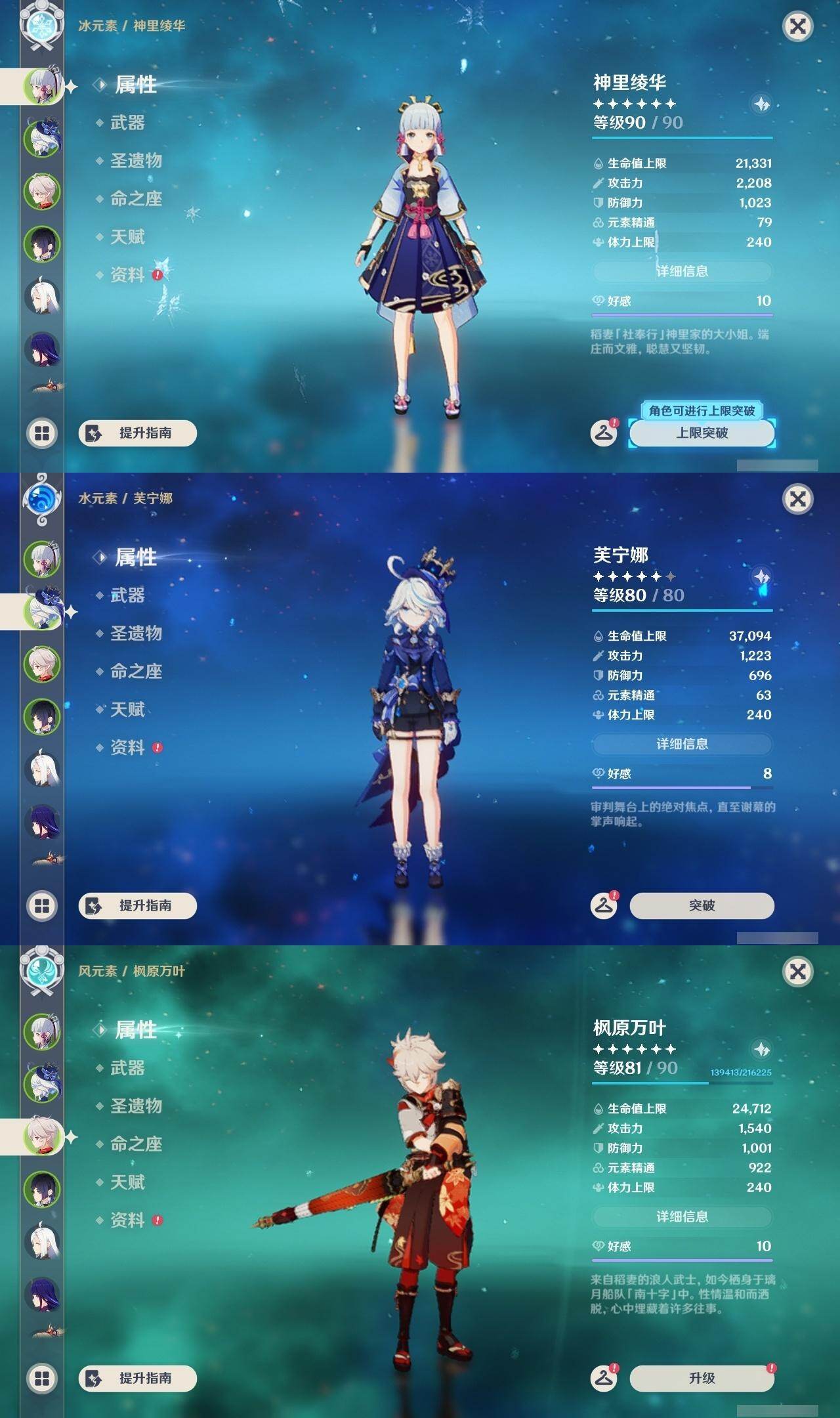 0命克洛琳德,0命娜维娅,0命芙宁娜,0命纳西妲,0命妮露,0命提纳里,1命夜兰,0命八重神子,0命申鹤,0命雷电将军,0命枫原万叶,0命神里绫华,0命钟离,0命胡桃,1命宵宫,0命温迪,1命刻晴,2命琴,2命莫娜,1命迪卢克,精1苇海信标,精1护摩之杖,精1和璞鸢,精1阿莫斯之弓,精1天空之傲