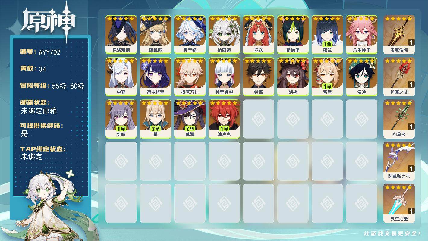 [17690706]58级/34黄/女主/20个五星角色/6个五星武器 0命克洛琳德,0命娜维娅,0命芙宁娜,0命纳西妲,0命妮露,0命提纳里,1命夜兰,0命八重神子,0命申鹤,0命雷电将军,0命枫原万叶,0命神里绫华,0命钟离,0命胡桃,1命宵宫,0命温迪,1命刻晴,2命琴,2命莫娜,1命迪卢克,精1苇海信标,精1护摩之杖,精1和璞鸢,精1阿莫斯之弓,精1天空之傲