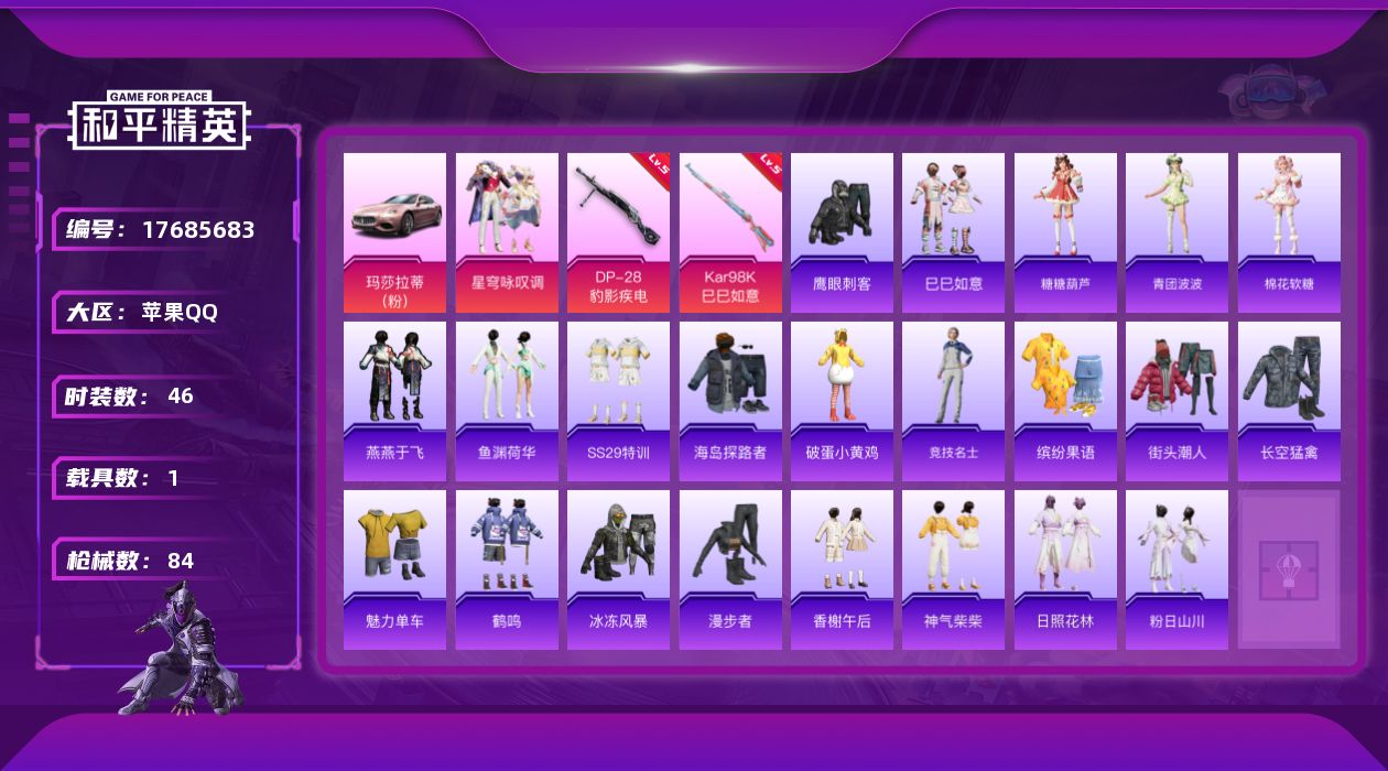 [17685683]苹果 手Q-1粉装-3特效枪-1载具-0粉色飞行器-21256热力值-6王牌印记-46套装-84枪皮 【粉色套装】:粉装-星穹咏叹调 【粉色枪皮等级】:Kar98K-巳巳如意(五级),Mk14-福马献瑞(四级),DP-28-豹影疾电(五级) 【粉色载具】:玛莎拉蒂Ghibli(粉) 【粉色枪皮】:Kar98K-巳巳如意,Mk14-福马献瑞,DP-28-豹影疾电