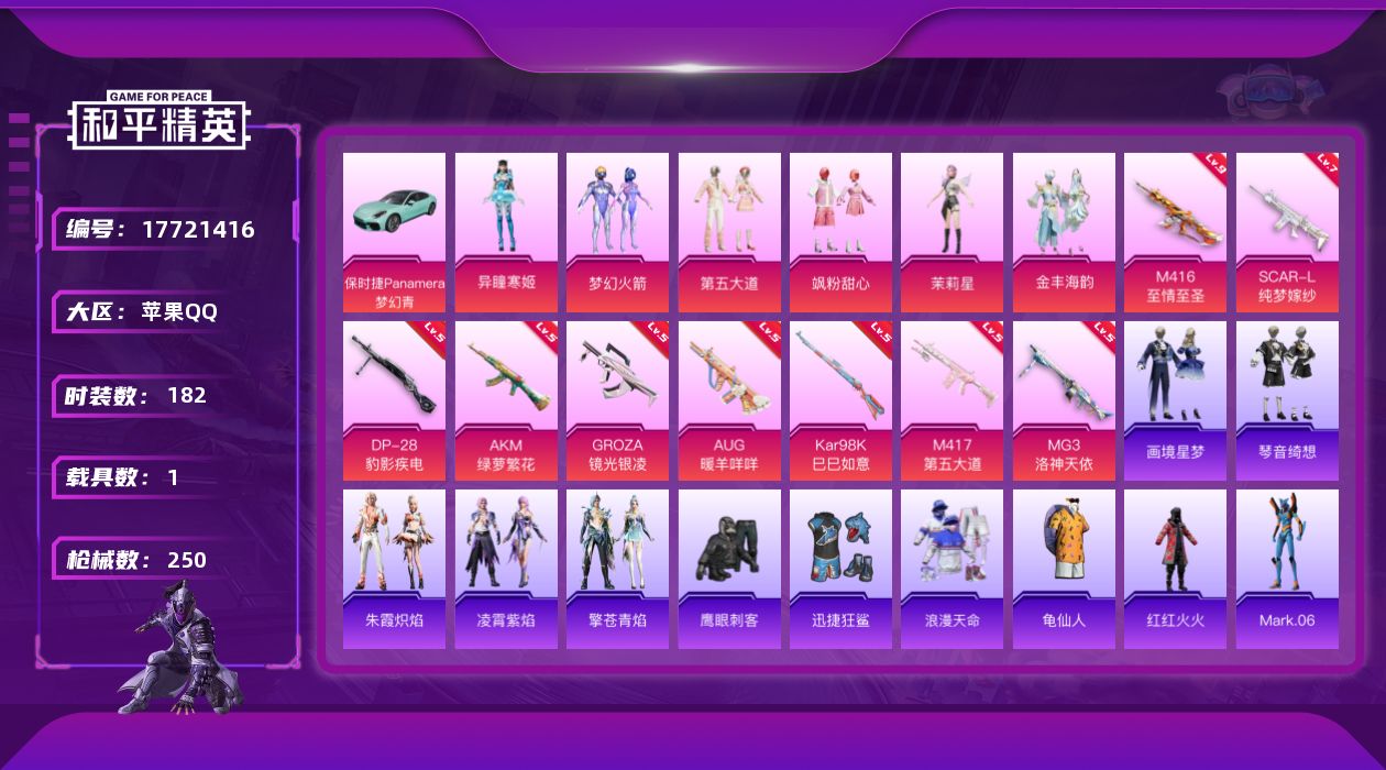 [17721416]苹果 手Q-6粉装-12特效枪-1载具-3粉色飞行器-73440热力值-16王牌印记-182套装-250枪皮 【热门品类】:粉装-梦幻火箭,套装-浪漫天命,套装-龟仙人,套装-红红火火,角色-Mark.06 【粉色套装】:粉装-梦幻火箭,粉装-第五大道,粉装-飒粉甜心,角色-茉莉星,粉装-金丰海韵,角色-异瞳寒姬 【粉色枪皮等级】:AKM-绿萝繁花(五级),SCAR-L-纯梦嫁纱(七级),M416-至情至圣(九级),GROZA-镜光银凌(五级),AUG-暖羊咩咩(五级),UMP45-萌骑冒险(五级),AKS-74U-森灵之息(五级),Kar98K-巳巳如意(五级),Mk14-福马献瑞(三级),M417-第五大道(五级),DP-28-豹影疾电(五级),MG3-洛神天依(五级) 【粉色载具】:保时捷Panamera(梦幻青) 【粉色枪皮】:AKM-绿萝繁花,SCAR-L-纯梦嫁纱,M416-至情至圣,GROZA-镜光银凌,AUG-暖羊咩咩,UMP45-萌骑冒险,AKS-74U-森灵之息,Kar98K-巳巳如意,Mk14-福马献瑞,M417-第五大道,DP-28-豹影疾电,MG3-洛神天依 【粉色飞行器】:炫彩糖果飞行器,拂晓神骑飞行器 【粉色降落伞】:绝对恒星降落伞,幻影战神降落伞,梦幻火箭降落伞,洛神天依降落伞,暗星紫秘降落伞,暗夜鎏金降落伞,海螺星光降落伞,第五大道降落伞,仲夏莫吉托降落伞,圣堂之誓降落伞,江南烟雨降落伞,异瞳寒姬降落伞,炫彩糖果降落伞 【稀有套装】:套装-龟仙人,套装-巳巳如意,套装-炫彩糖果,套装-马上来财,套装-糖糖葫芦,套装-青团波波,套装-燕燕于飞,套装-鱼渊荷华,角色-风玲,套装-紫幽梦,套装-蓝冰羽,套装-云朵鹅,套装-雪绒豹,角色-绛羽幽主,套装-朱霞炽焰,套装-凌霄紫焰,套装-擎苍青焰,套装-画境星梦,套装-琴音绮想,套装-雨过天青,套装-红釉青花 【稀有枪皮】:AKM-彩虹符号,AKM-破晓战魂,AKM-胡桃卫兵,AKM-龙的传人,M16A4-幻世战舞者,M16A4-甜心亚梦,M16A4-红色方程式,M16A4-蓝色火焰,SCAR-L-夜灯,SCAR-L-炫彩节奏,SCAR-L-玉兔迎春,SCAR-L-红色方程式,M416-糯团青竹,M416-红色方程式,M416-蓝色火焰,GROZA-2B战斗服款,GROZA-异彩先驱,GRO